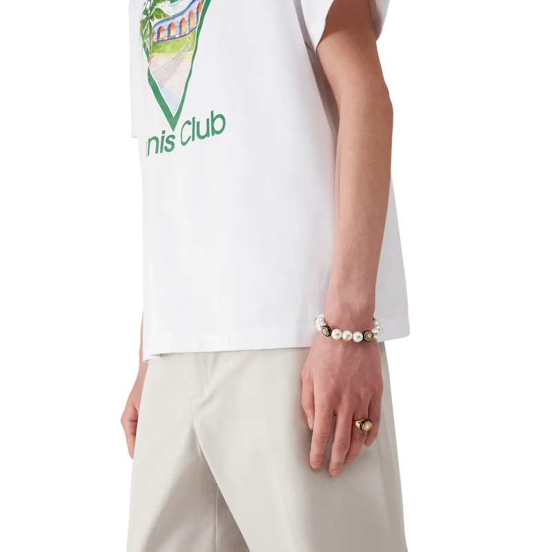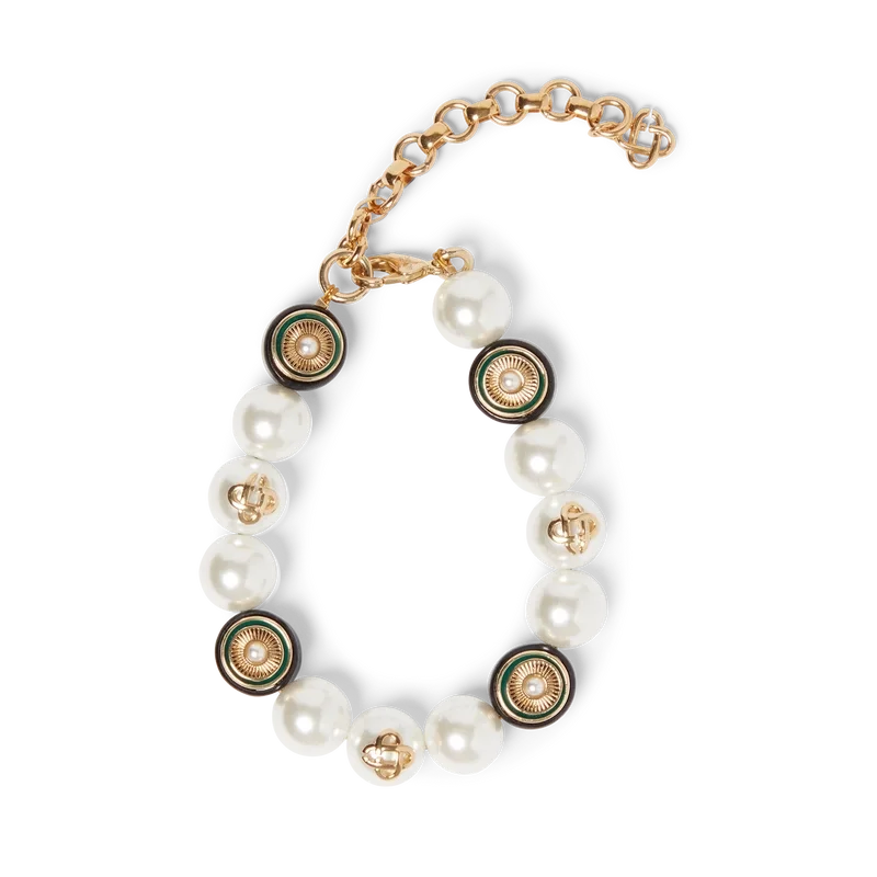 Das Spoke Wheel Armband ist aus vergoldetem Messing, Emaille und Süßwasserperlen gefertigt. Abgerundet wird es durch das ineinander verschlungene CC-Logo des Hauses, eine vergoldete Kette und einen Karabinerverschluss.