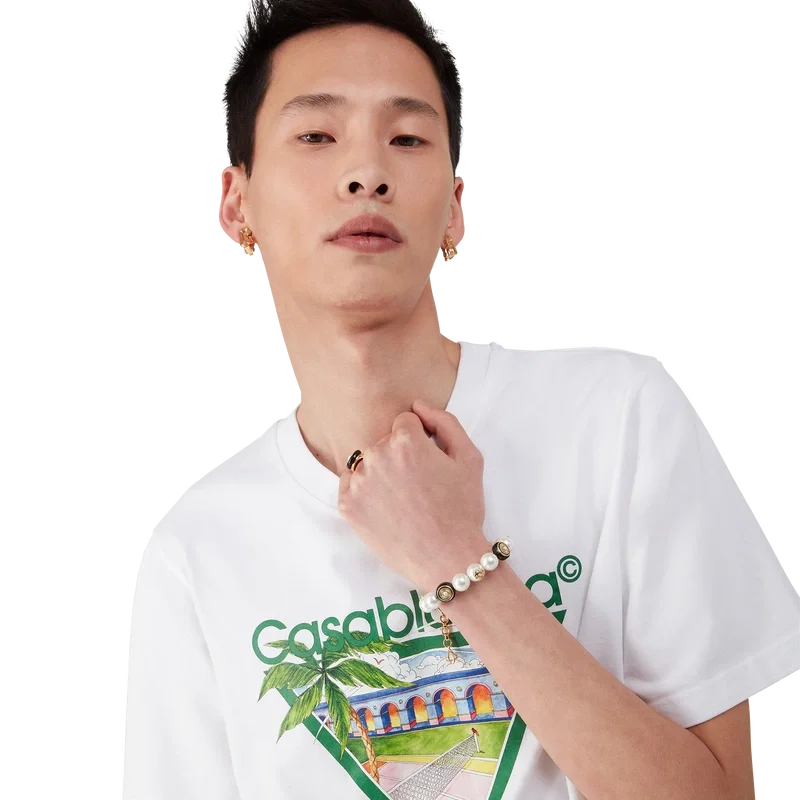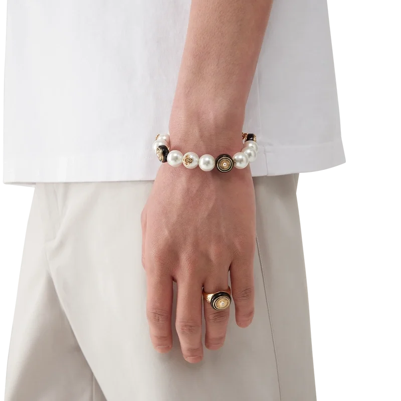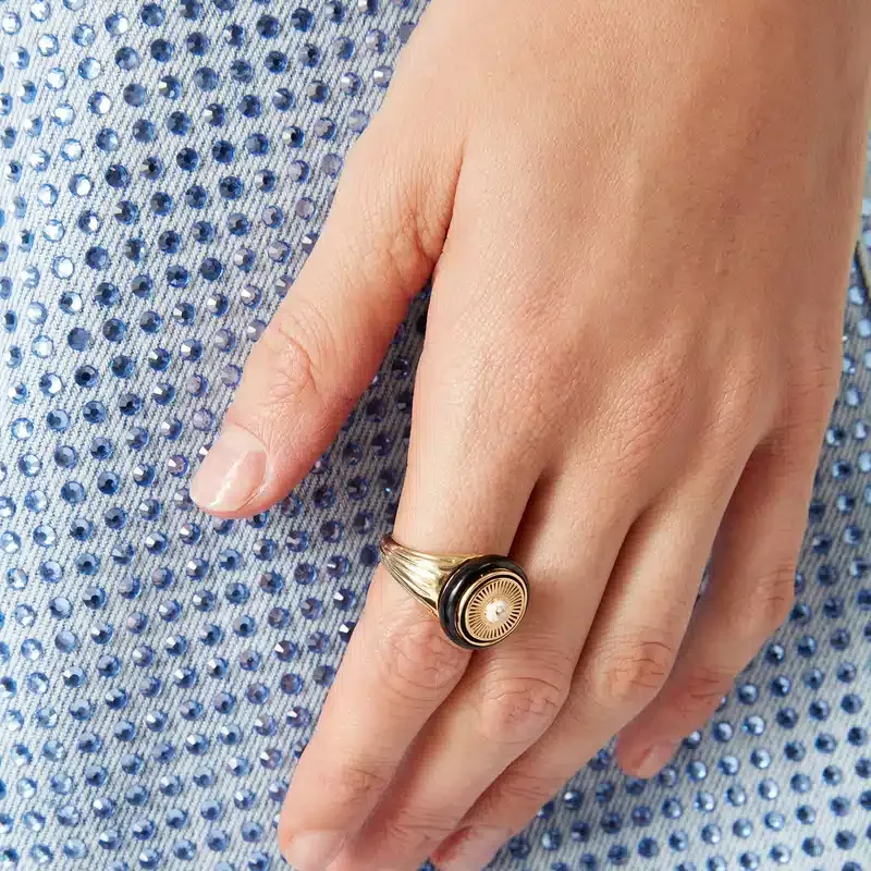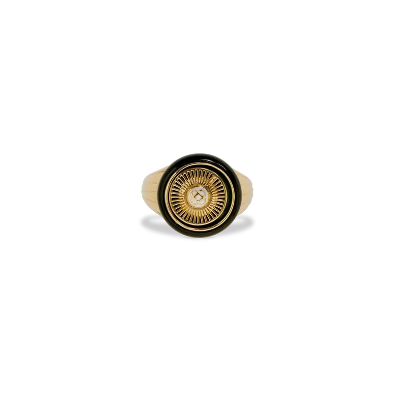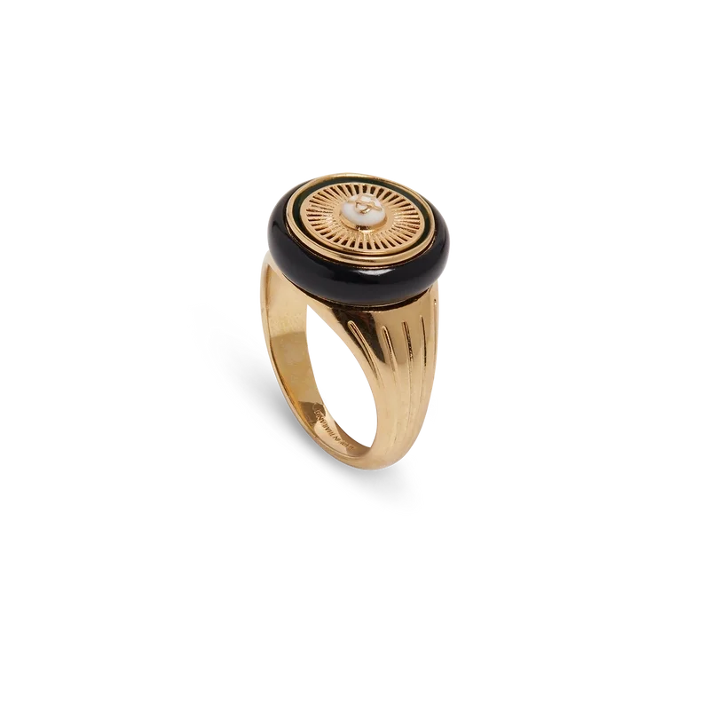 Der Spoke Wheel Ring ist aus vergoldetem Messing und Emaille gefertigt. Er ist mit dem ineinander verschlungenen Cc-Logo des Hauses in der Mitte der radförmigen Vorderseite sowie mit in den Ringband eingravierten Linien verziert.