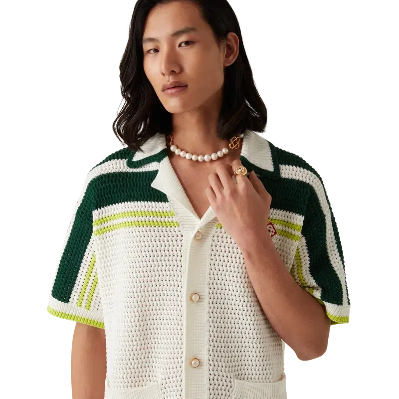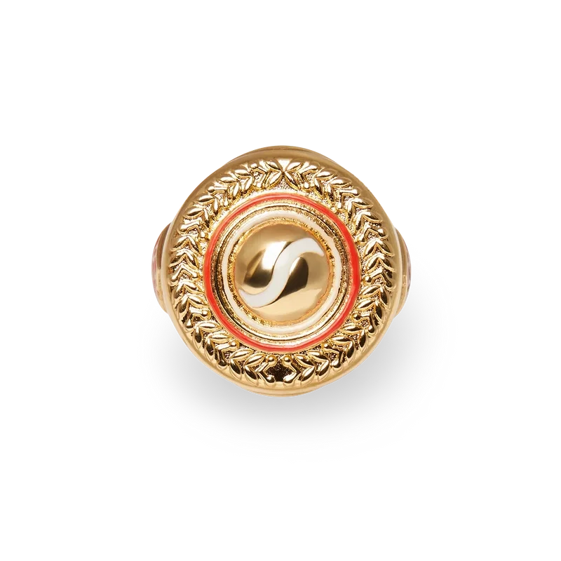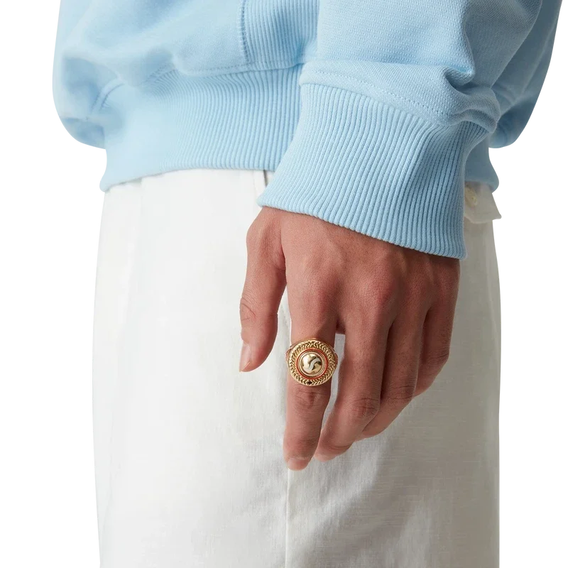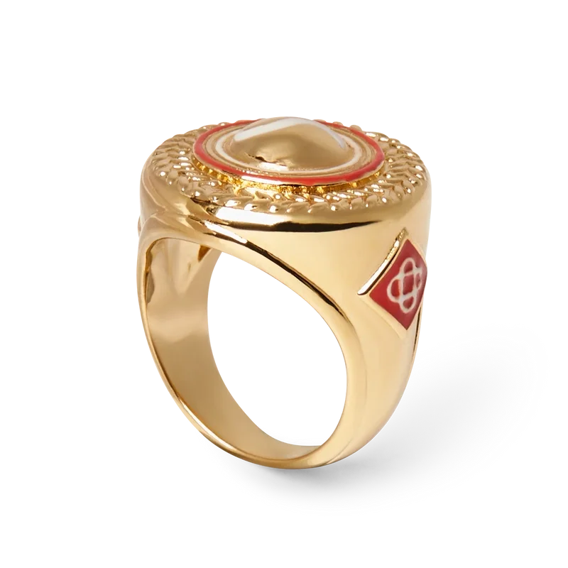 Der Sports Medallion Ring ist aus vergoldetem Messing und handbemaltem Emaille gefertigt. Abgerundet wird er durch das charakteristische Diamant-Logo des Hauses auf den Ringbändern.
