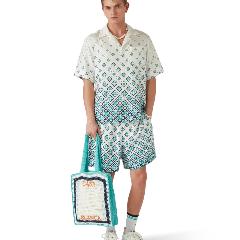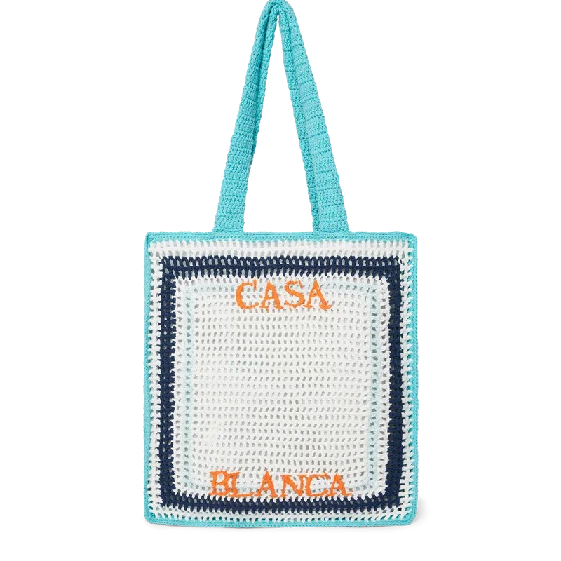Die Stripe Crochet Bag ist eine gestrickte Tasche aus gehäkelter Baumwolle und zeichnet sich durch eine lockere Silhouette aus. Abgerundet wird sie durch ein gesticktes, übereinanderliegendes Casablanca-Logo sowie Riemen, mit denen die Tasche als Tote-Bag über der Schulter oder in der Hand getragen werden kann.