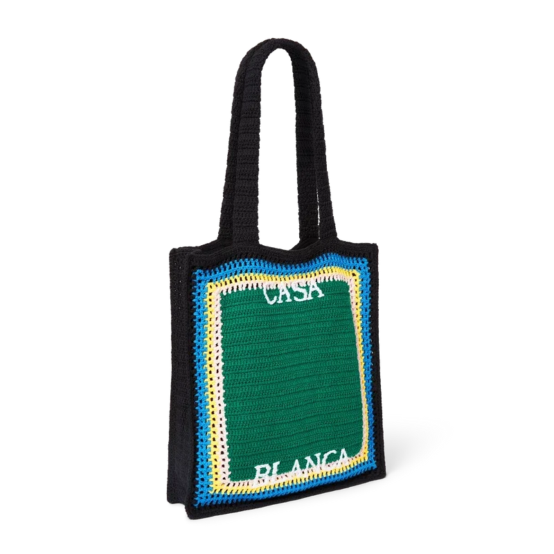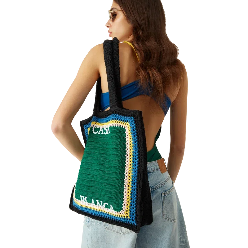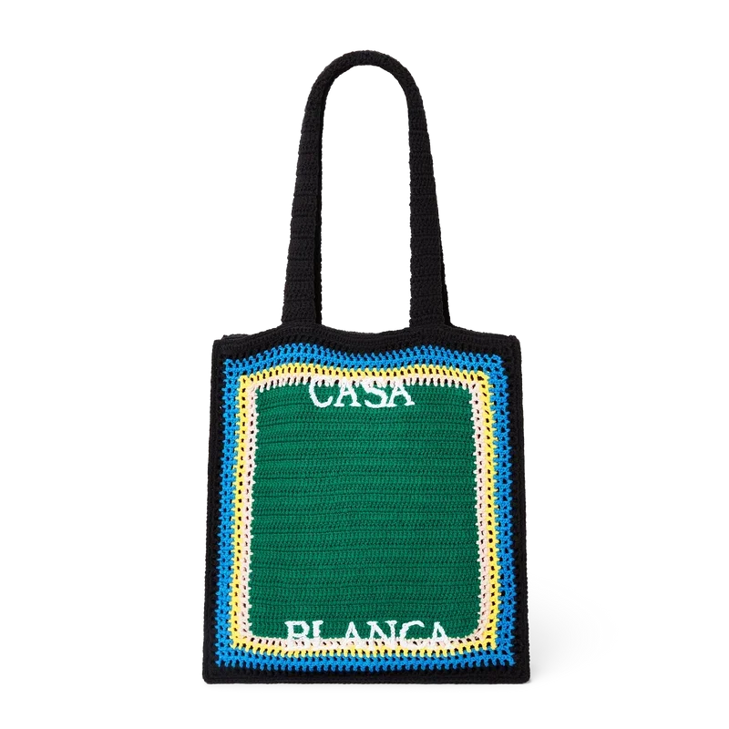 Die Crochet Bag ist eine im Strickstil gefertigte Tasche aus gehäkelter Baumwolle und zeichnet sich durch eine lockere Silhouette aus. Abgerundet wird sie durch ein gesticktes schwarzes Logo und Riemen, die es ermöglichen, die Tasche im Tote-Stil über der Schulter oder in der Hand zu tragen.