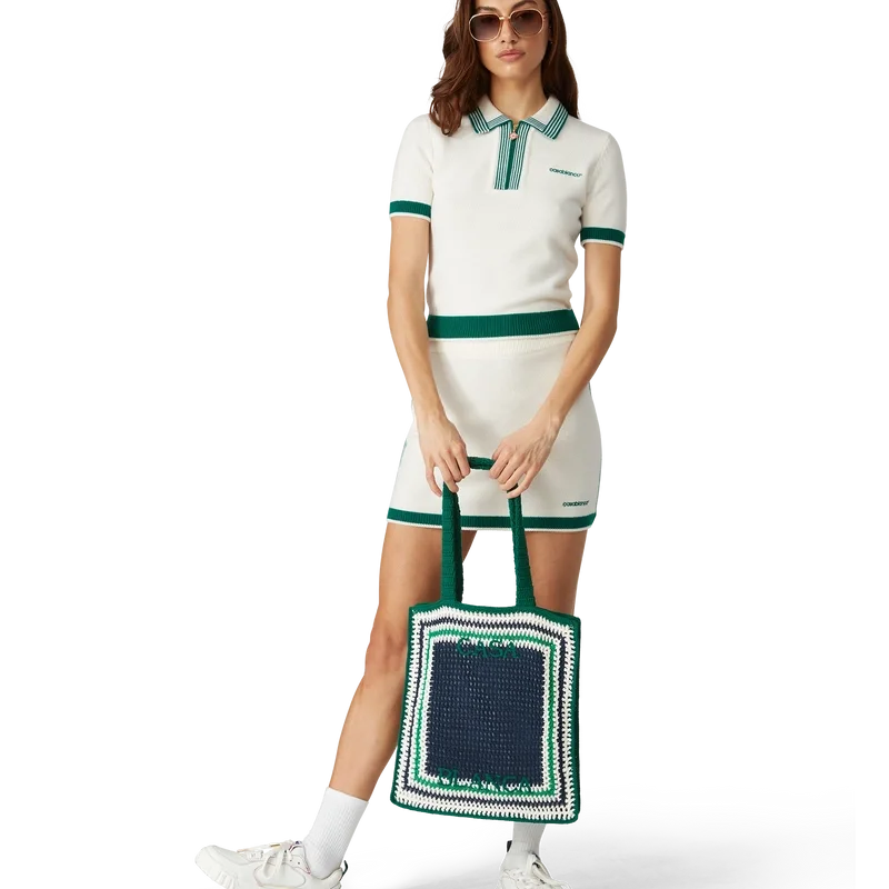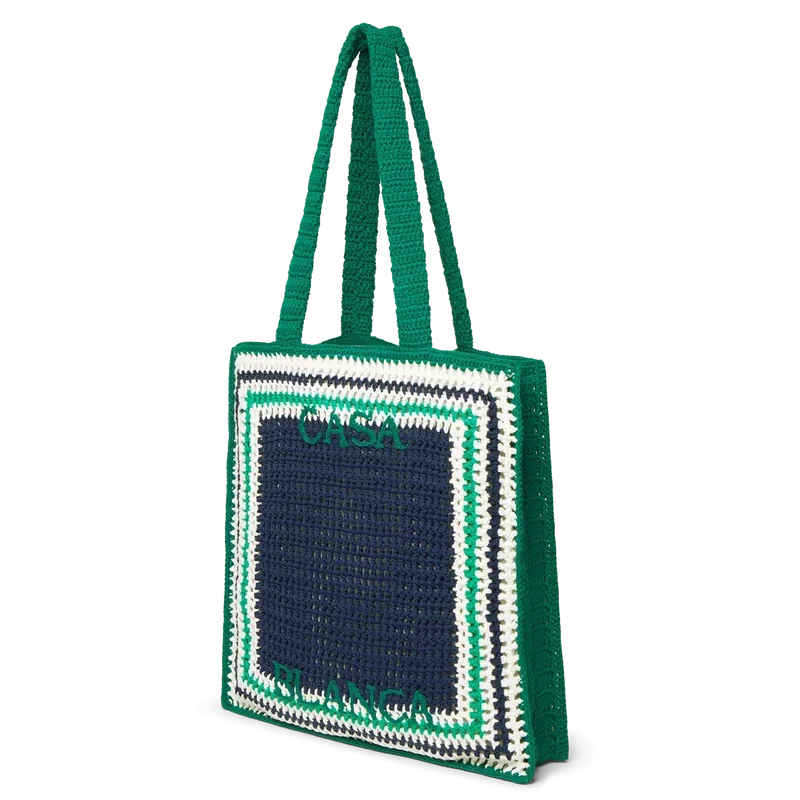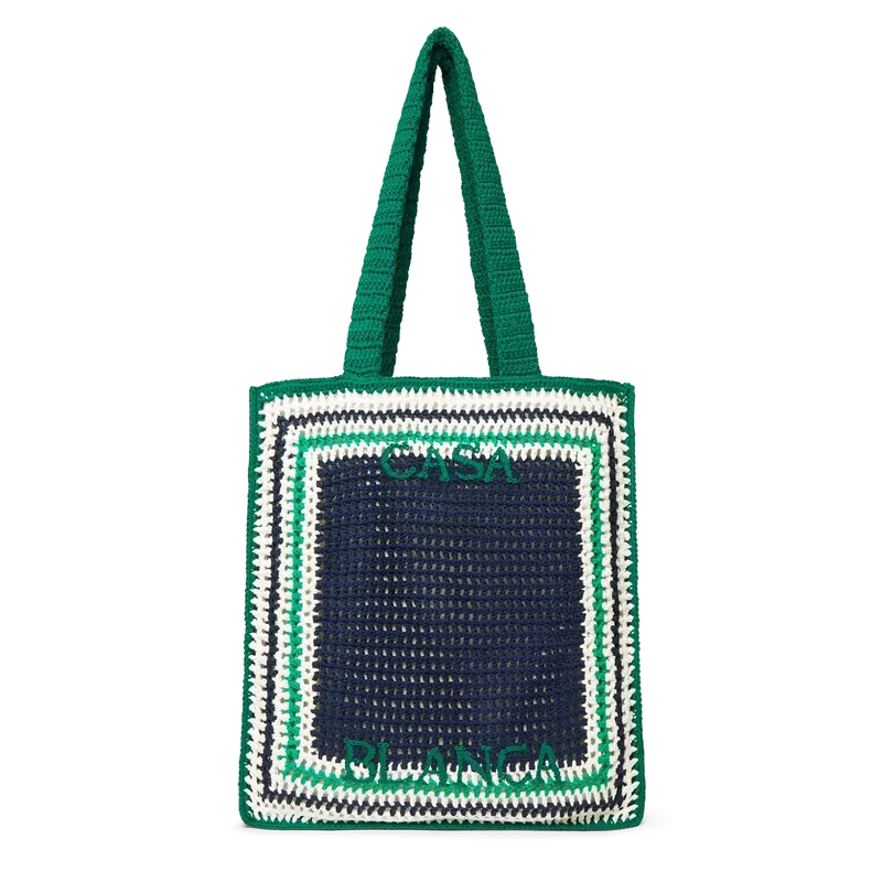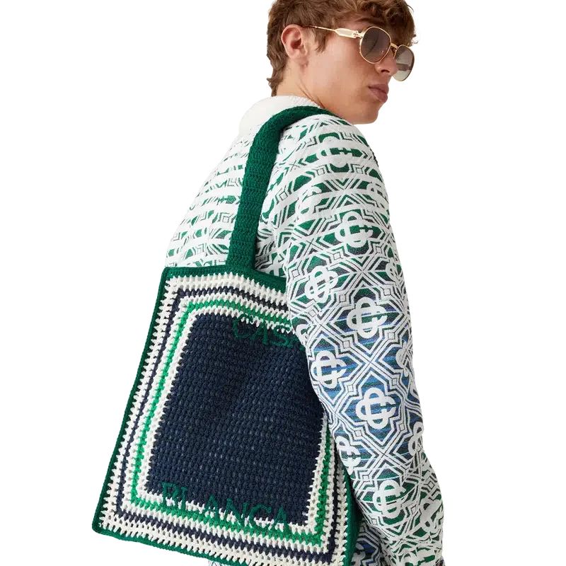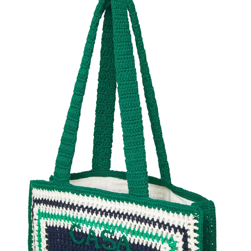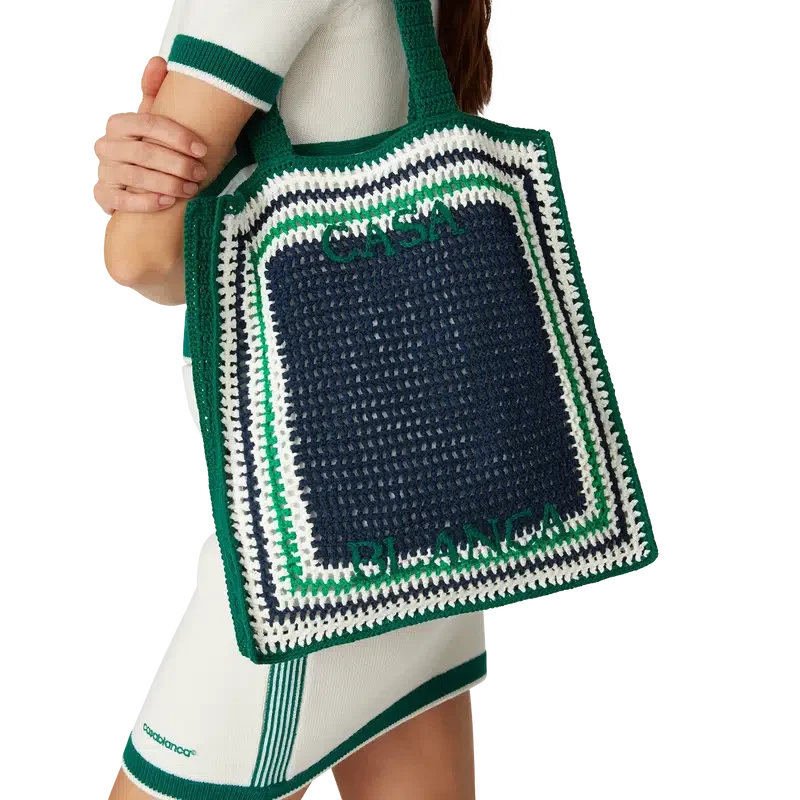 Die Stripe Crochet Bag ist eine gestrickte Tasche aus gehäkelter Baumwolle und zeichnet sich durch eine lockere Silhouette aus. Abgerundet wird sie durch ein gesticktes schwarzes Logo und Riemen, dank derer die Tasche im Tote-Stil über der Schulter oder in der Hand getragen werden kann.