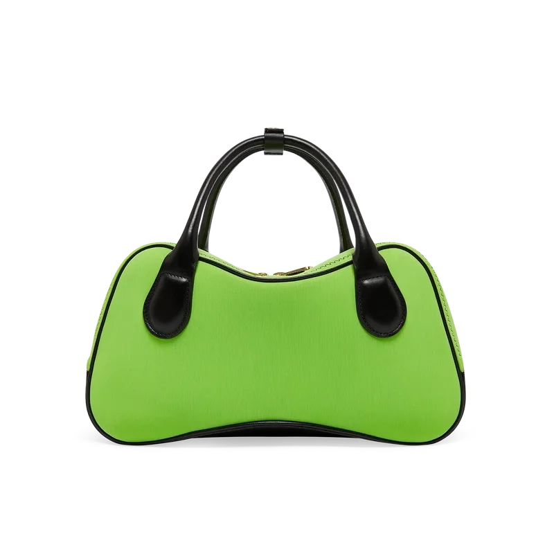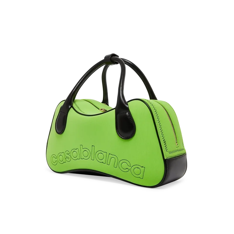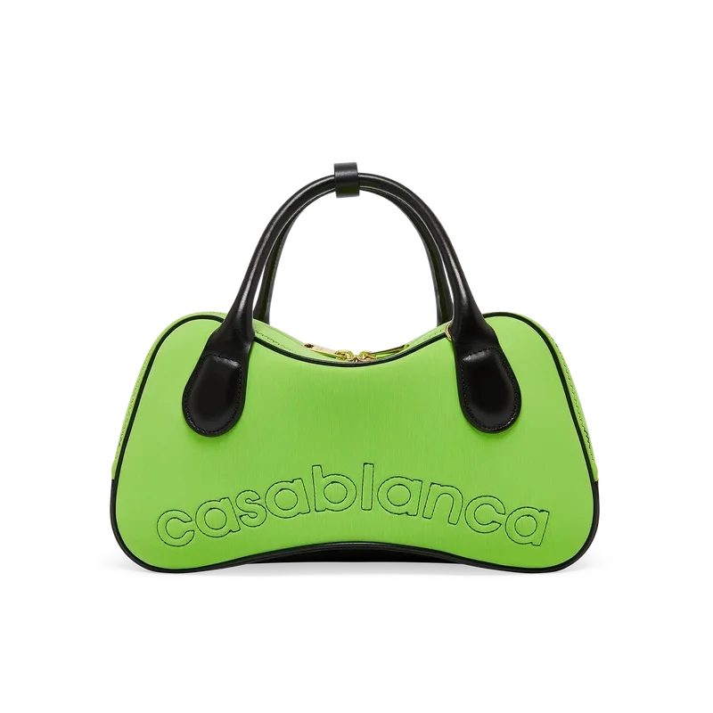 Die grüne Bowling-Minitasche ist aus italienischem Kalbsleder gefertigt und mit dem charakteristischen Casablanca-Logo des Hauses verziert. Abgerundet wird sie durch hochwertige Metallbeschläge, einen Reißverschluss, Paspeldetails, einen verstellbaren Schulterriemen und zwei Tragegriffe.