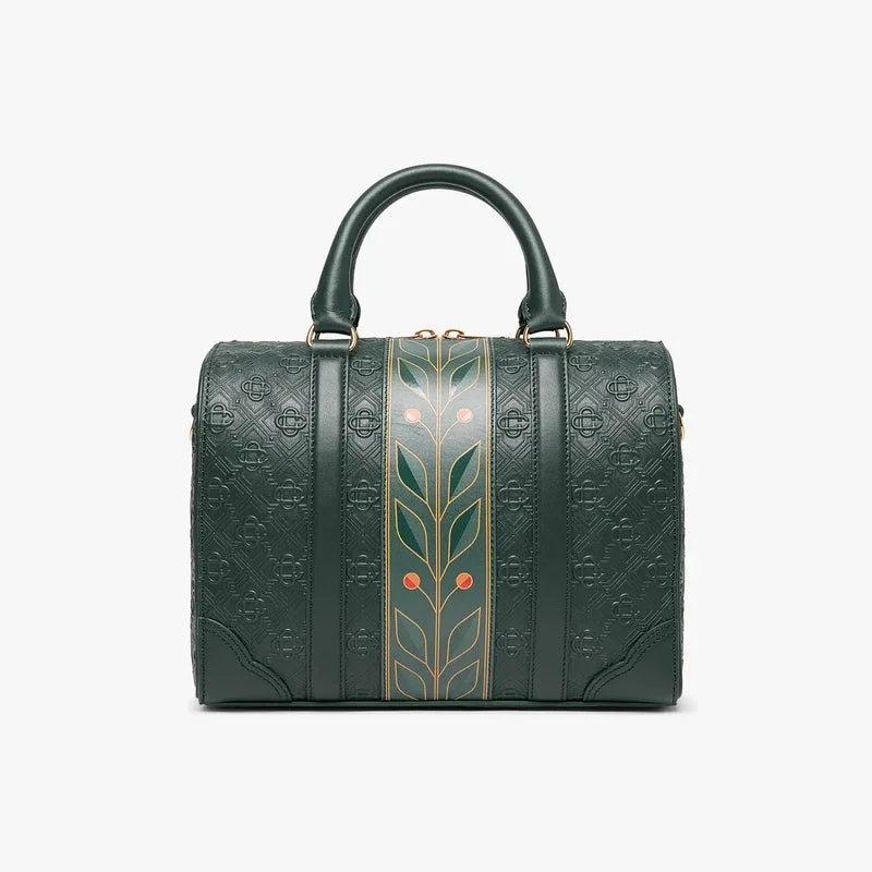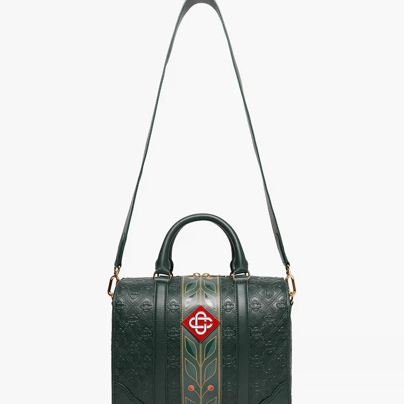 Die grüne Mini Monogram Weekender-Tasche ist aus italienischem Leder gefertigt und an der Seite mit dem charakteristischen Rautenlogo des Hauses verziert. Abgerundet wird sie durch das charakteristische Lorbeerblatt-Motiv des Hauses, Tragegriffe, einen Reißverschluss, einen Schulterriemen, eine Innentasche und Beschläge aus Messing. Im Lieferumfang enthalten sind eine Geschenkbox der Marke Casablanca, ein Staubbeutel und ein Produktinformationsheft.