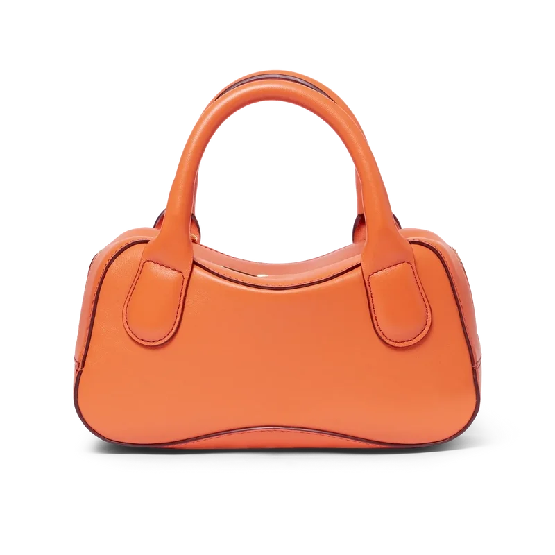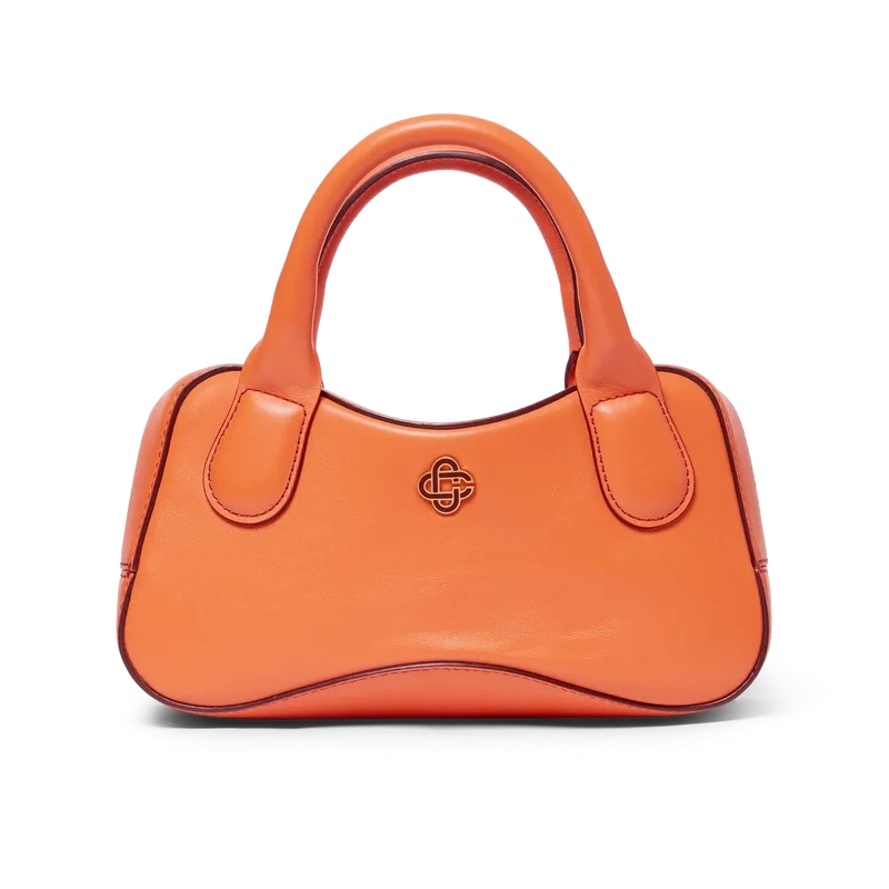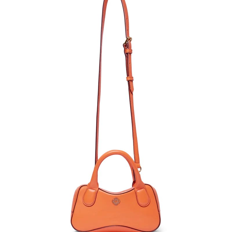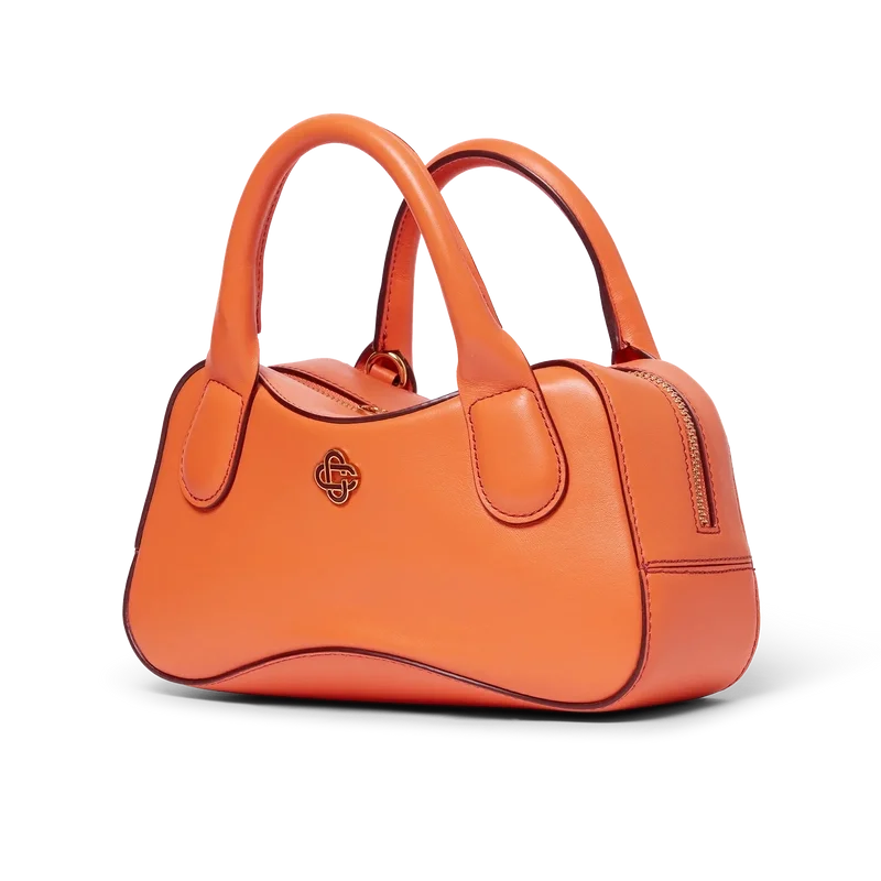 Die orangefarbene Micro-Bowling-Tasche ist aus italienischem Kalbsleder gefertigt und mit dem ineinander verschlungenen CC-Logo des Hauses auf hochwertigen Metallbeschlägen verziert. Ausgestattet mit einem Reißverschluss, einem verstellbaren, abnehmbaren Riemen, zwei Tragegriffen und einer inneren Einstecktasche. Wird mit einem Staubbeutel der Marke Casablanca, einer Geschenkbox und einer Produktbeschreibung geliefert.