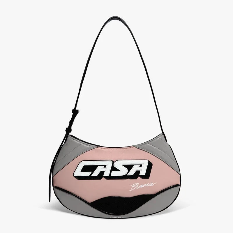 Die rosa schlanke Biker-Tasche ist aus Leder gefertigt und trägt auf der Vorderseite die „Casa“-Inschrift des Hauses. Sie verfügt über einen Schulterriemen, einen Reißverschluss, kontrastierende Paspeldetails, versilberte Beschläge und eine schlanke Silhouette, die für mühelosen Alltagseinsatz konzipiert ist. Im Lieferumfang enthalten sind eine Geschenkbox, ein Staubbeutel mit Markenlogo und eine Produktbeschreibung.