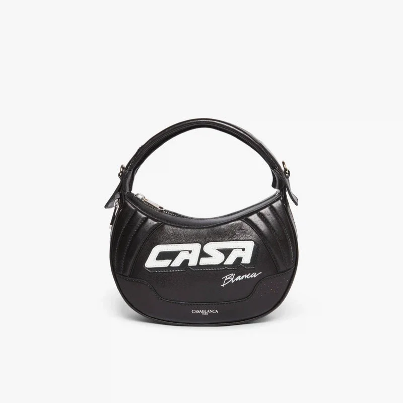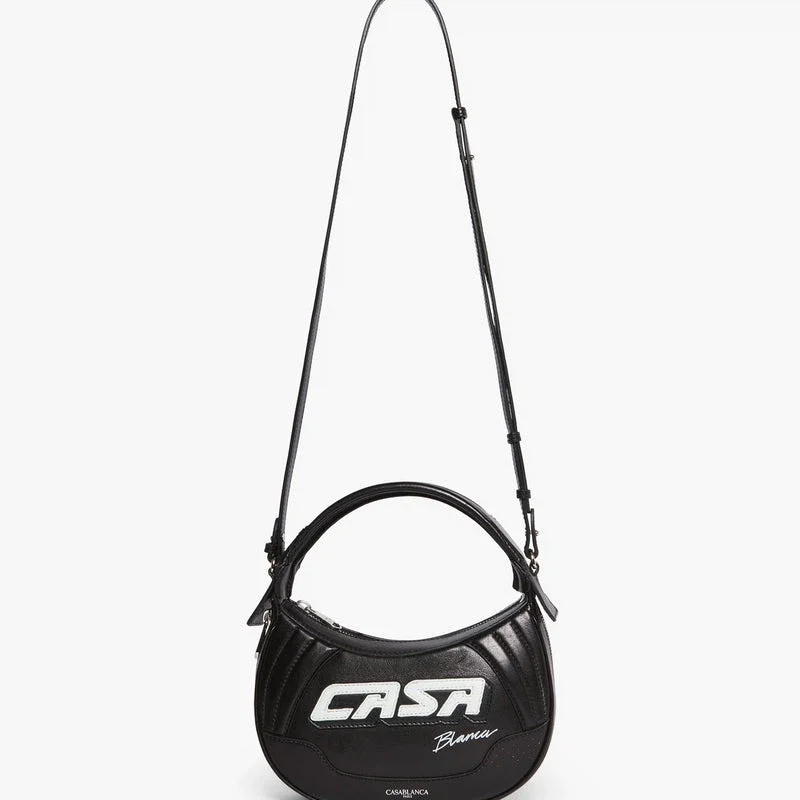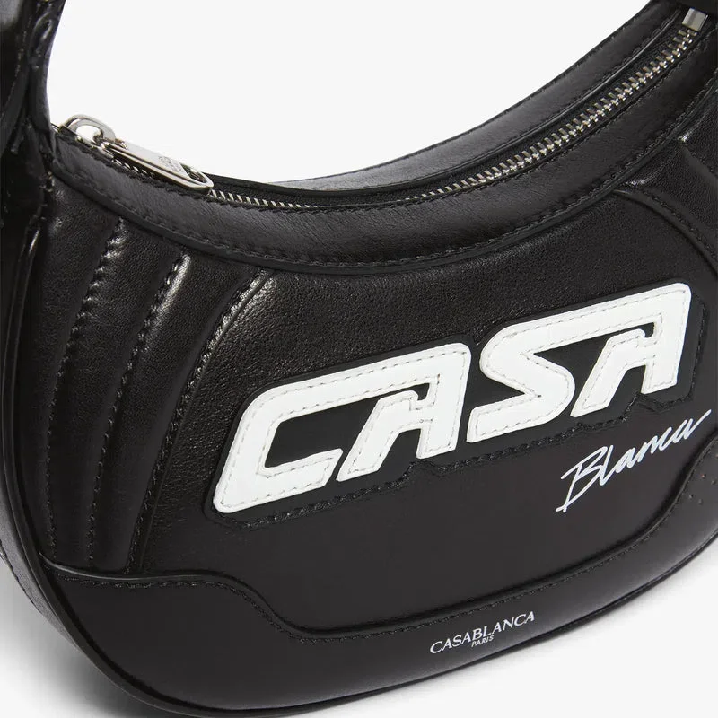Die schwarze Biker-Tasche ist aus Leder gefertigt und trägt auf der Vorderseite die Casa-Inschrift des Hauses. Sie verfügt über einen Riemen, einen Reißverschluss, Reißverschlussdetails, versilberte Beschläge und eine abgerundete Silhouette. Im Lieferumfang enthalten sind eine Geschenkbox, ein Staubbeutel mit Markenlogo und eine Produktbeschreibung.