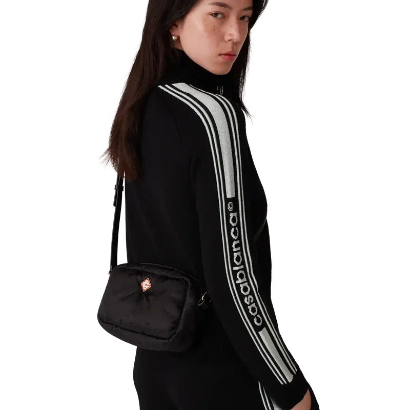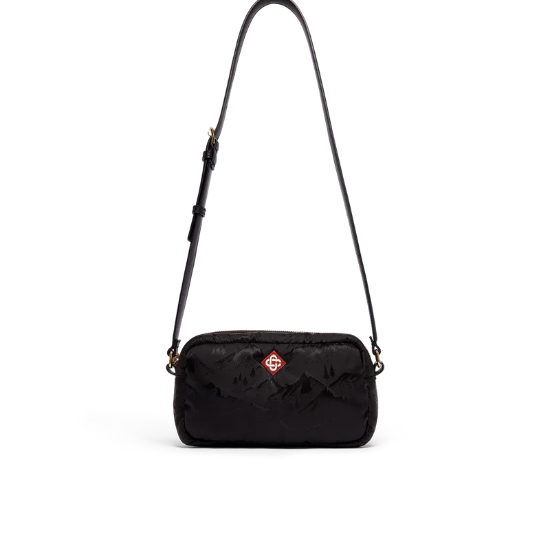 Die schwarze Kameratasche ist aus technischem Gewebe gefertigt und mit dem Jacquard-Bergmuster dieser Saison versehen. Abgerundet wird sie durch einen verstellbaren Schulterriemen aus Leder, einen Reißverschluss und das charakteristische Rautenlogo des Hauses.