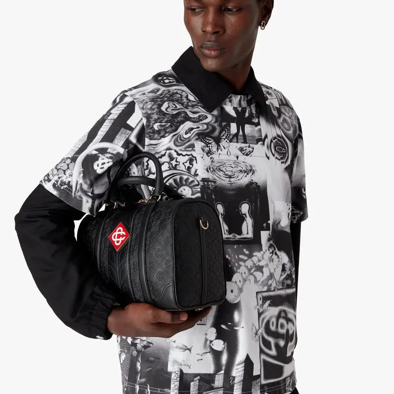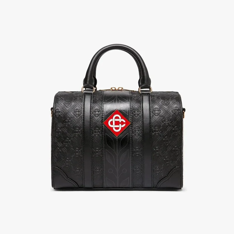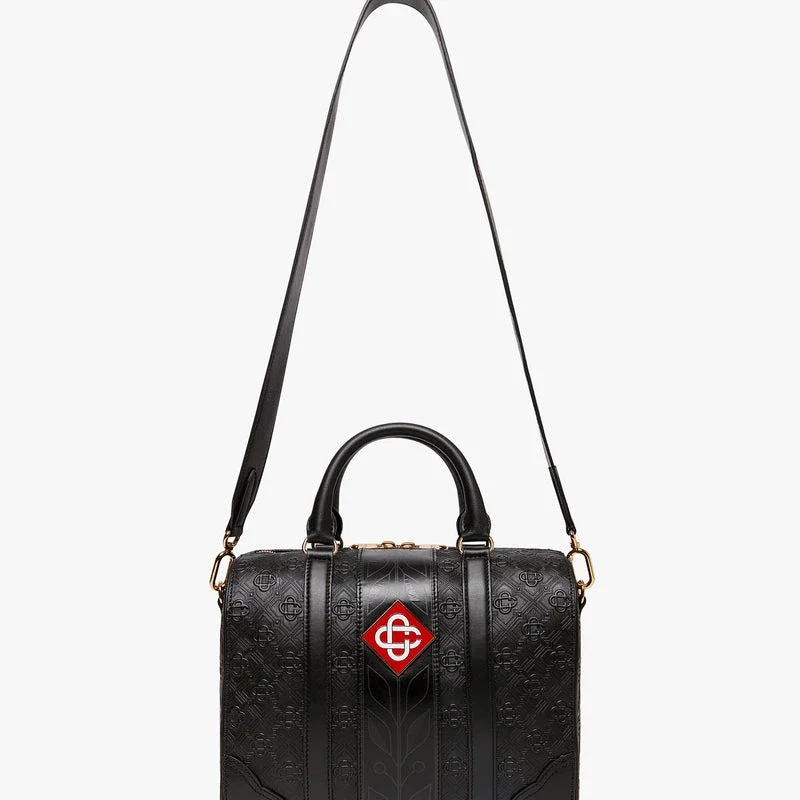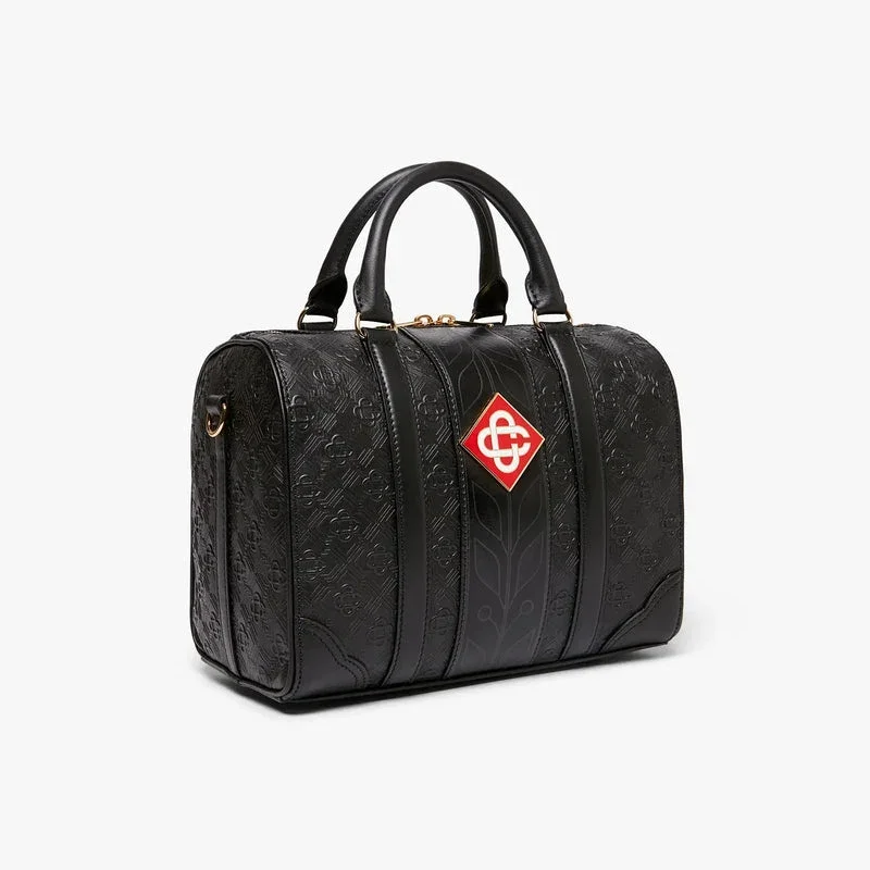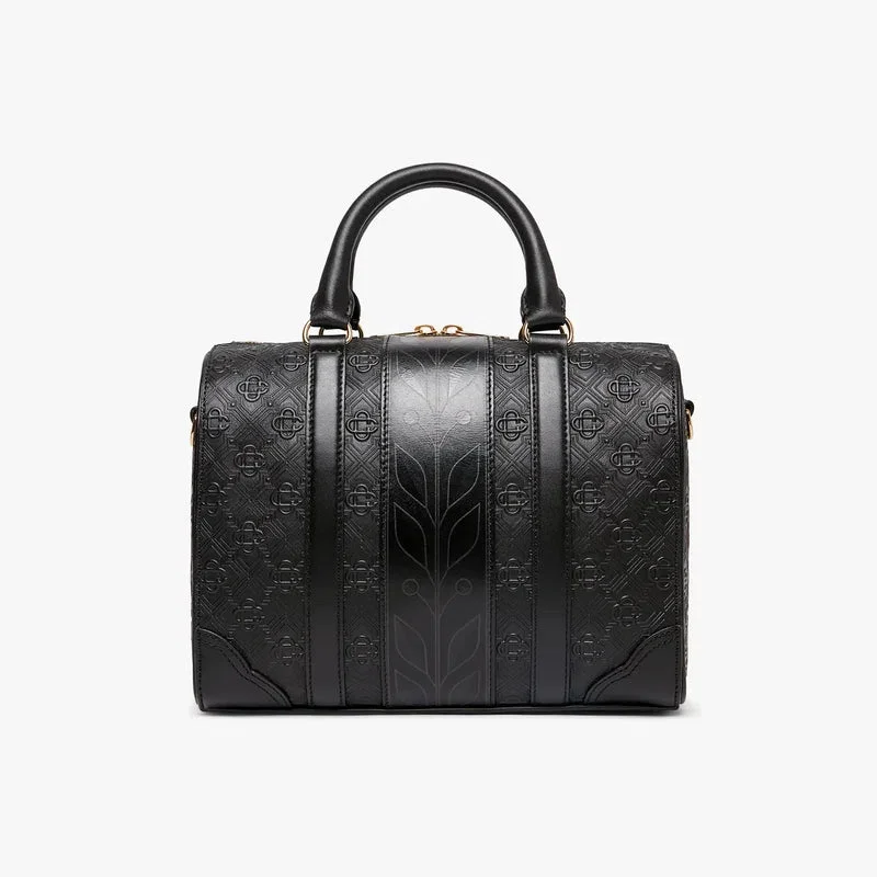 Die schwarze Mini Monogram Weekender-Tasche ist aus italienischem Leder gefertigt und an der Seite mit dem charakteristischen Rautenlogo des Hauses verziert. Abgerundet wird sie durch das charakteristische Lorbeerblatt-Motiv des Hauses, Tragegriffe, einen Reißverschluss, einen Schulterriemen, eine Innentasche und Beschläge aus Messing. Im Lieferumfang enthalten sind eine Geschenkbox der Marke Casablanca, ein Staubbeutel und ein Produktinformationsheft.