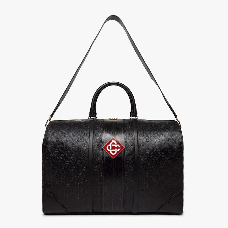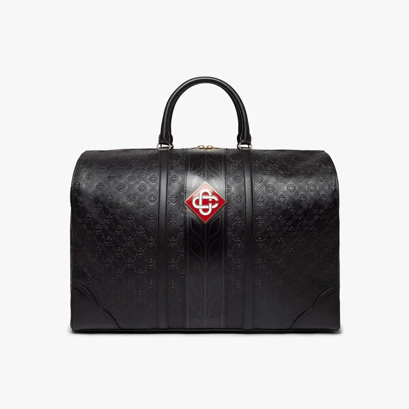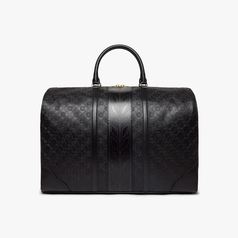 Die schwarze Monogram-Wochenendtasche ist aus italienischem Leder gefertigt und an der Seite mit dem charakteristischen Rautenlogo des Hauses verziert. Abgerundet wird sie durch das charakteristische Lorbeerblatt-Motiv des Hauses, Tragegriffe, einen Reißverschluss, einen Schulterriemen, eine Innentasche und Beschläge aus Messing. Im Lieferumfang enthalten sind eine Geschenkbox der Marke Casablanca, ein Staubbeutel und ein Produktinformationsheft.