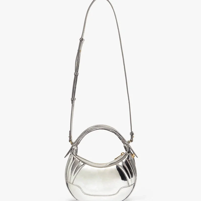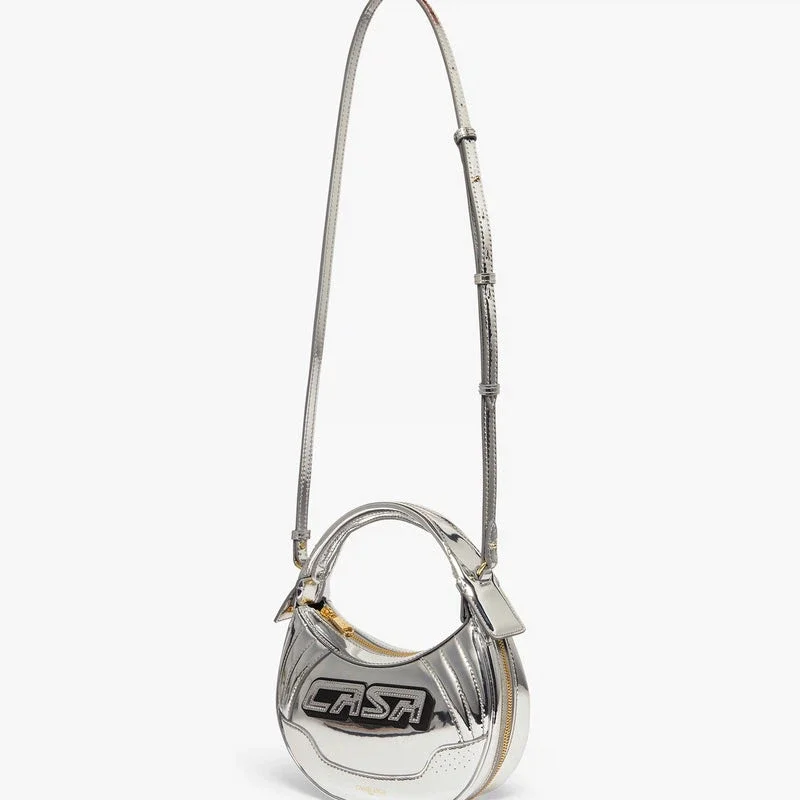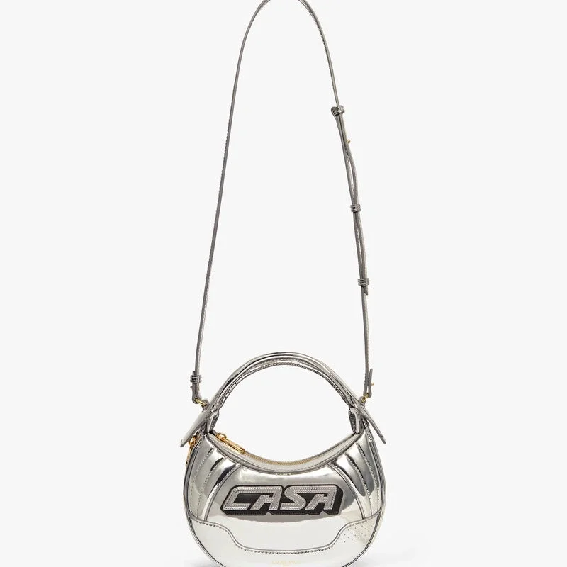 Die silberne Biker-Tasche ist aus Leder gefertigt und auf der Vorderseite mit der Casa-Inschrift des Hauses versehen. Sie verfügt über einen Riemen, einen Reißverschluss, Reißverschlussdetails, vergoldete Beschläge und eine abgerundete Silhouette. Im Lieferumfang enthalten sind eine Geschenkbox, ein Staubbeutel mit Markenlogo und eine Produktbeschreibung.