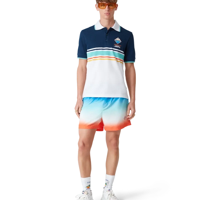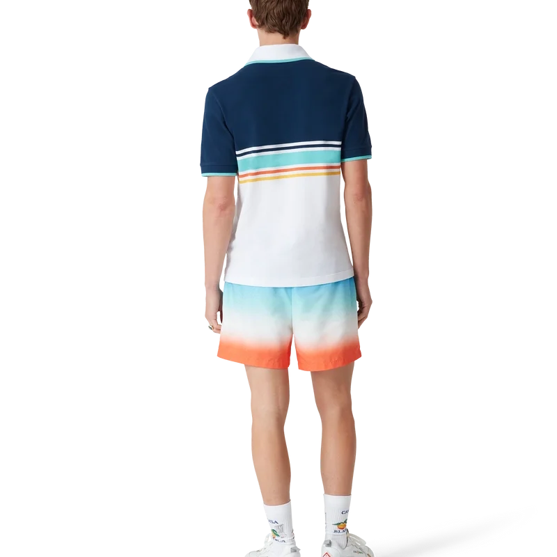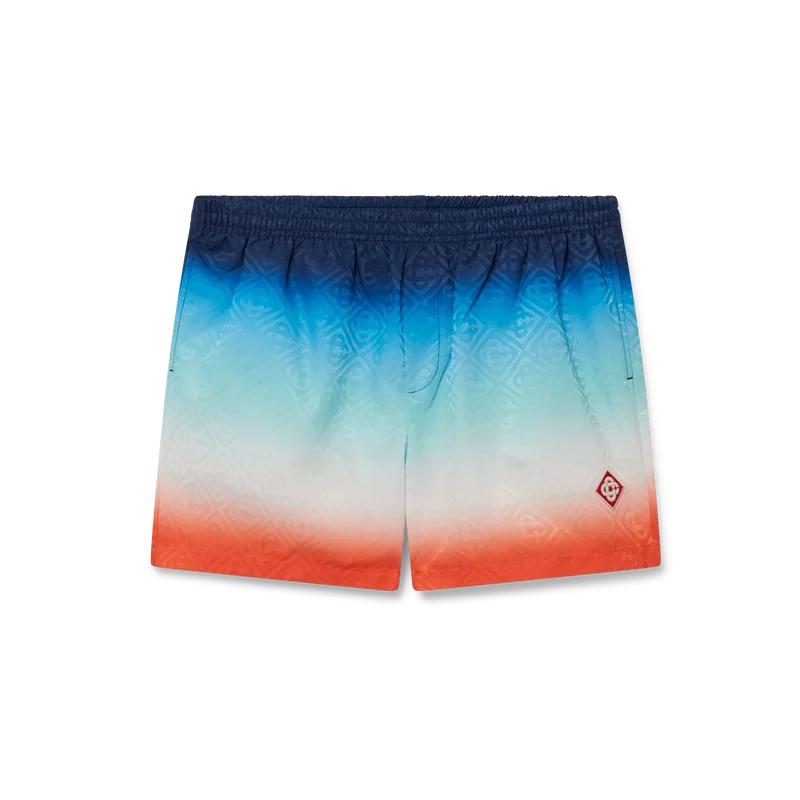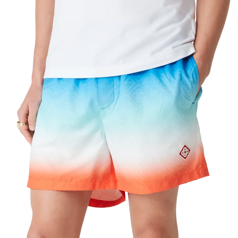 Die Gradient Jacquard-Shorts sind ein durchgehend bedrucktes Modell mit einer zurückhaltenden Farbpalette aus Blau, Aqua, Weiß und Orange in einem speziell für die Kollektion entworfenen Farbverlauf, gefertigt aus einem technischen Stoff. Abgerundet durch einen elastischen Bund mit innenliegendem Kordelzug, Seitentaschen in den Nähten, eine Innentasche und ein Futter.