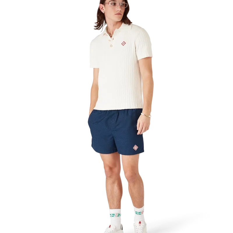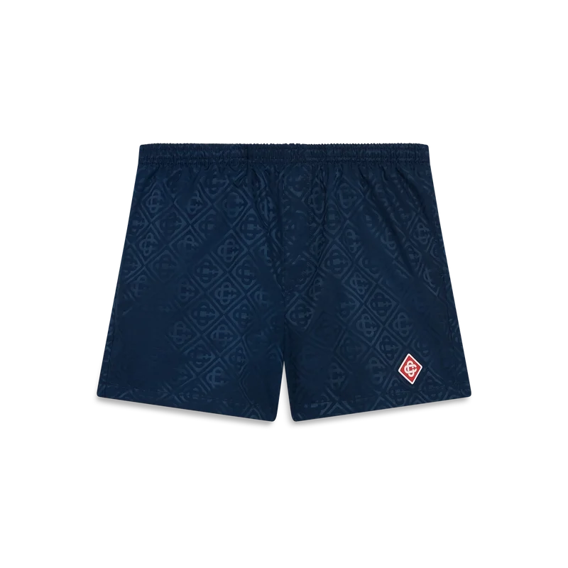 Die Jacquard-Shorts für Herren sind ein raffiniertes Design der Bademode aus technischem Badematerial mit dem charakteristischen Rautenlogo des Hauses. Mit elastischem Bund und Kordelzug in Marineblau. Die Jacquard-Badeshorts für Herren sind ein raffiniertes Modell mit durchgehendem Print, das den charakteristischen Monogram-Stoff und das Diamond Monogram-Logo des Hauses zeigt. Abgerundet durch einen elastischen Bund, einen innenliegenden Kordelzug, Eingrifftaschen und ein Netzfutter.