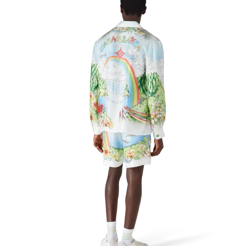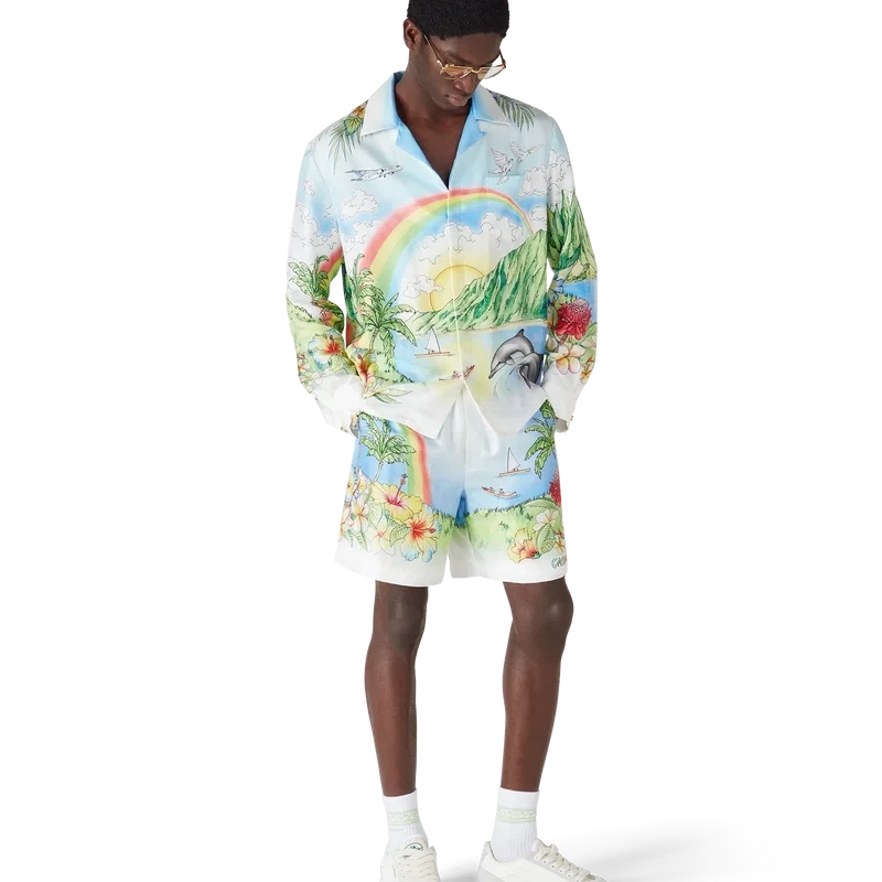 Das Aloha-Langarmhemd präsentiert eine lebendige, gemalte Darstellung von Kauai, Hawaii, und zeigt dessen bergiges Paradies, Wasserfälle, verspielte Delfine, Kanus und einen Regenbogen, wobei die Schönheit der Landschaft besonders hervorgehoben wird. Abgerundet durch eine Silhouette mit Kragen, Knopfleiste, ineinander verschlungenen Cc-Logo-Knöpfen und dem charakteristischen goldgerahmten Perlenknopf an den Manschetten sowie raffinierten Details, die den luxuriösen Sport-Freizeit-Stil der Marke widerspiegeln.