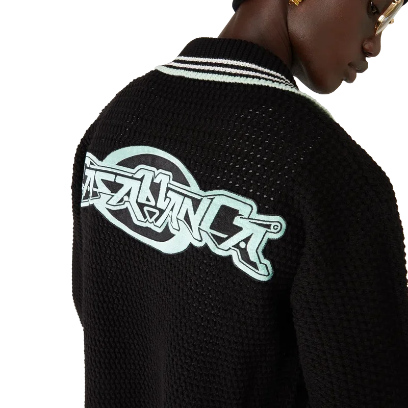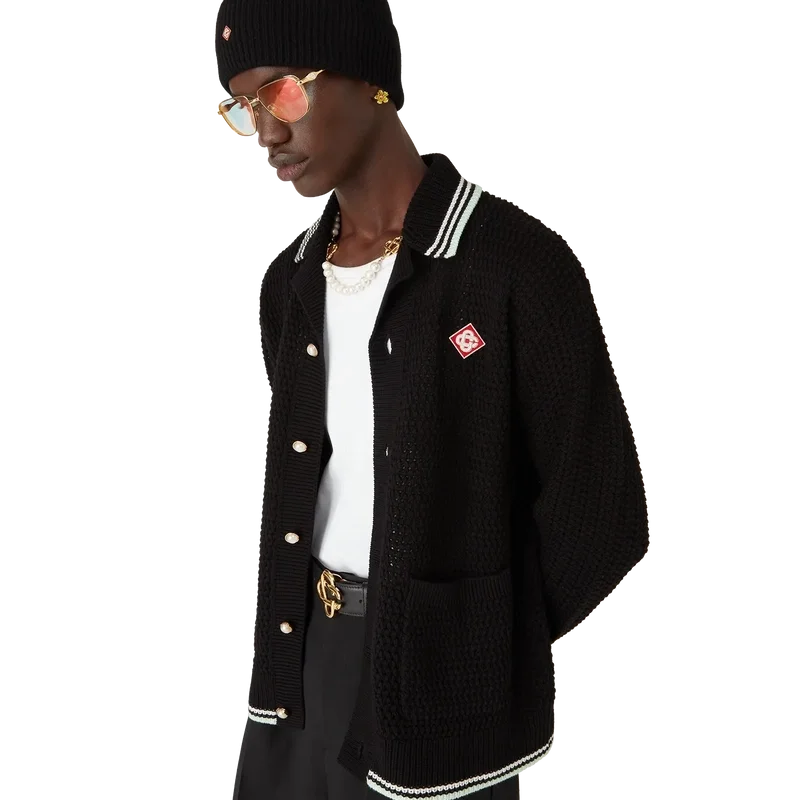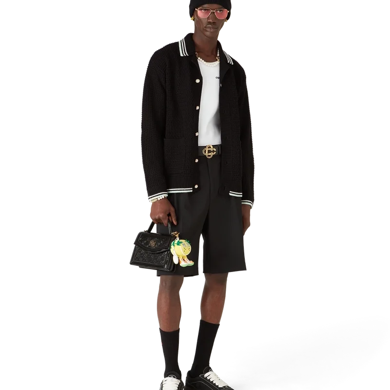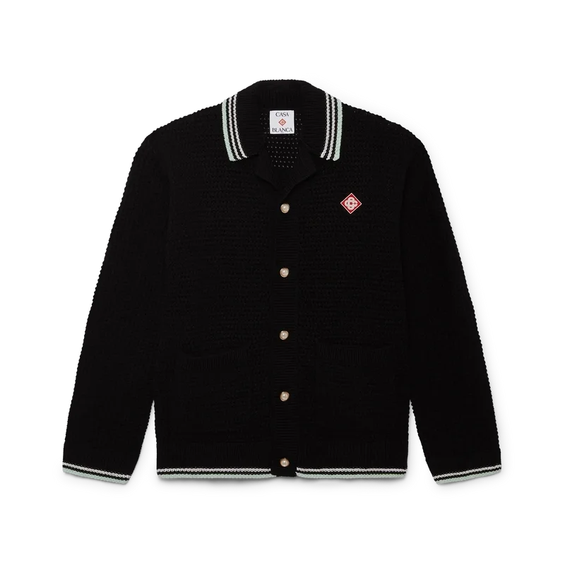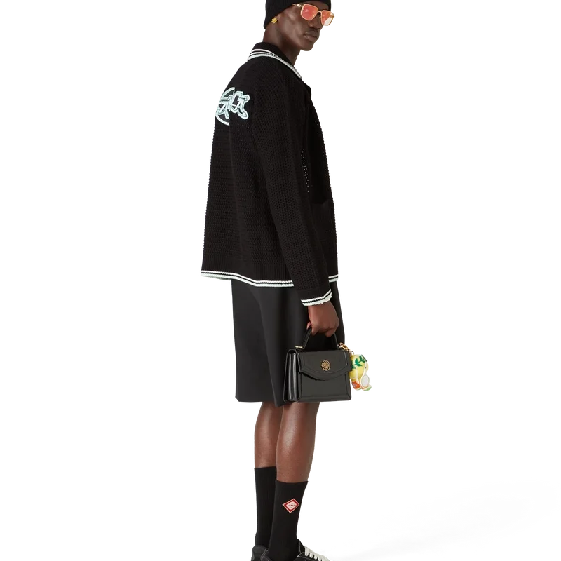 Das bestickte Langarmhemd aus Baumwollhäkelstoff ist ein klassisches Design mit dem charakteristischen Rautenlogo des Hauses, das an das Reise- und Urlaubsthema der Kapselkollektion anknüpft. Abgerundet durch einen gerippten Kragen, Ärmelbündchen, Saum und Knopfleiste, aufgesetzte Taschen vorne, Knopfverschluss, charakteristische goldgeränderte Perlknöpfe sowie schwarze, mintfarbene und weiße Streifen an den Ärmelbündchen, am Saum und am Kragen.