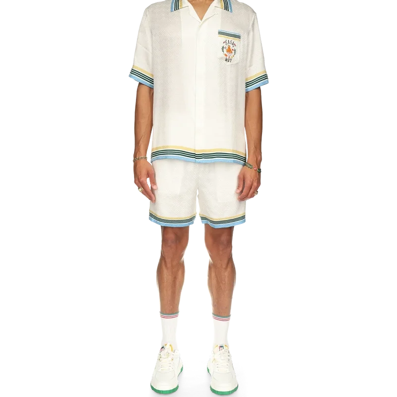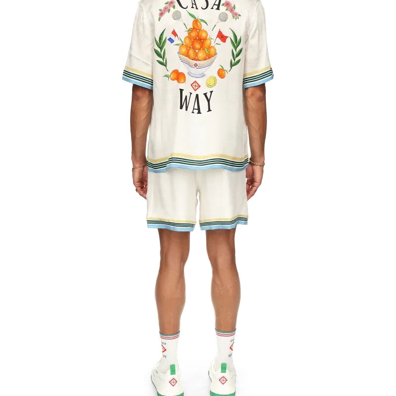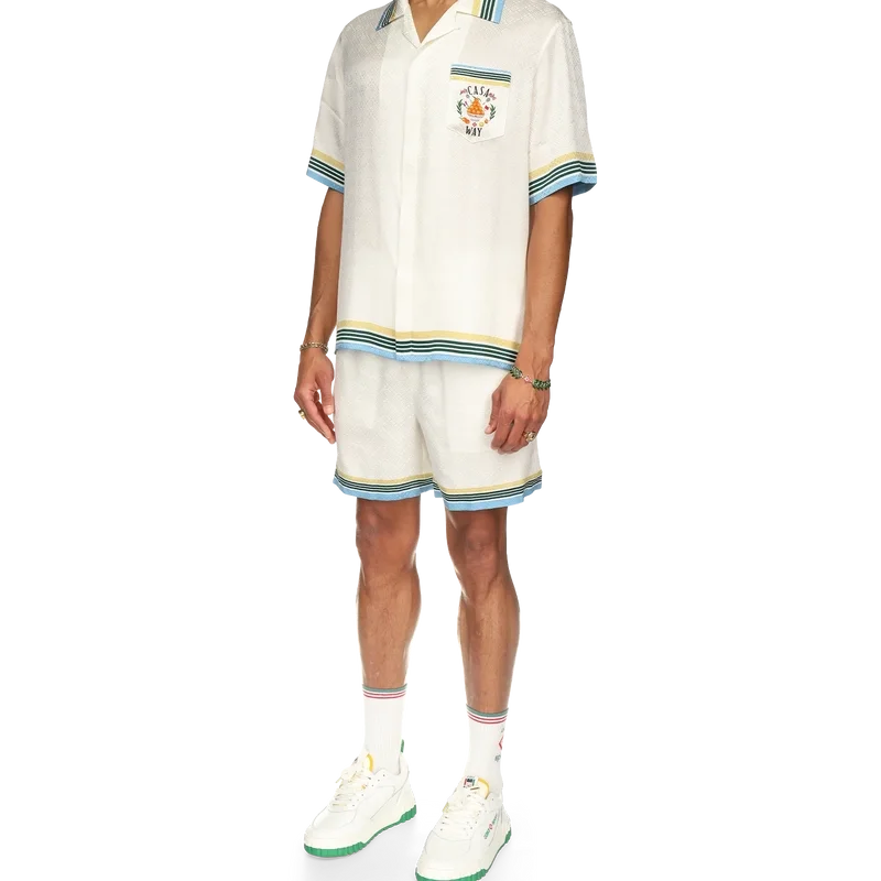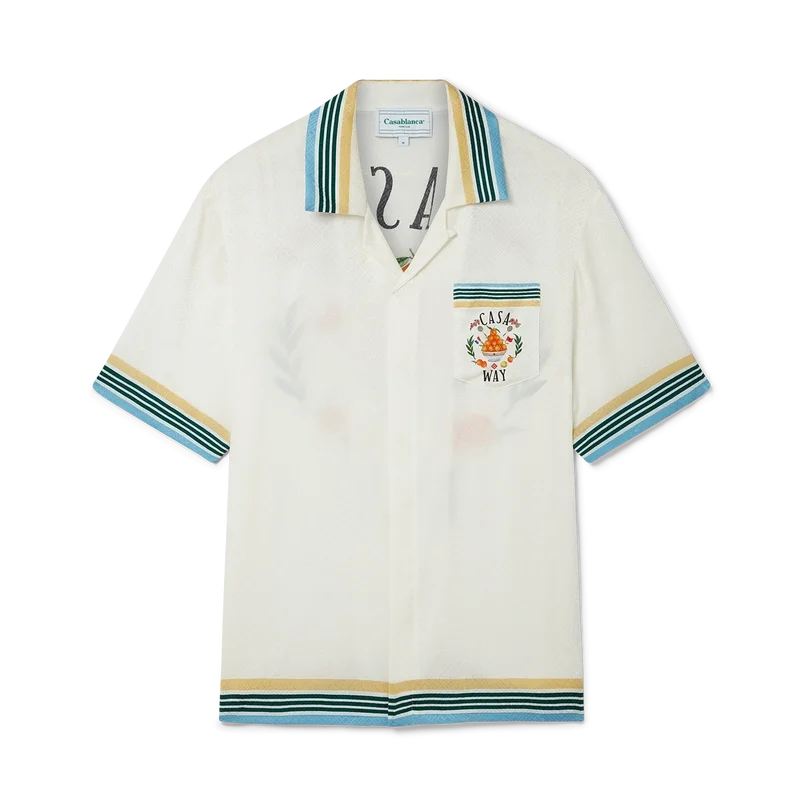 Das Casa Way Seidenhemd zeigt einen Druck des ikonografischen orangefarbenen Pyramiden-Motivs des Hauses mit Tennisschlägern und floralen Details, die für diese Saison neu interpretiert wurden. Mit einem Casablanca-Markenlabel und kontrastierenden Details an Kragen, Manschetten, Saum und Brusttasche – entworfen für eine klassische Passform.