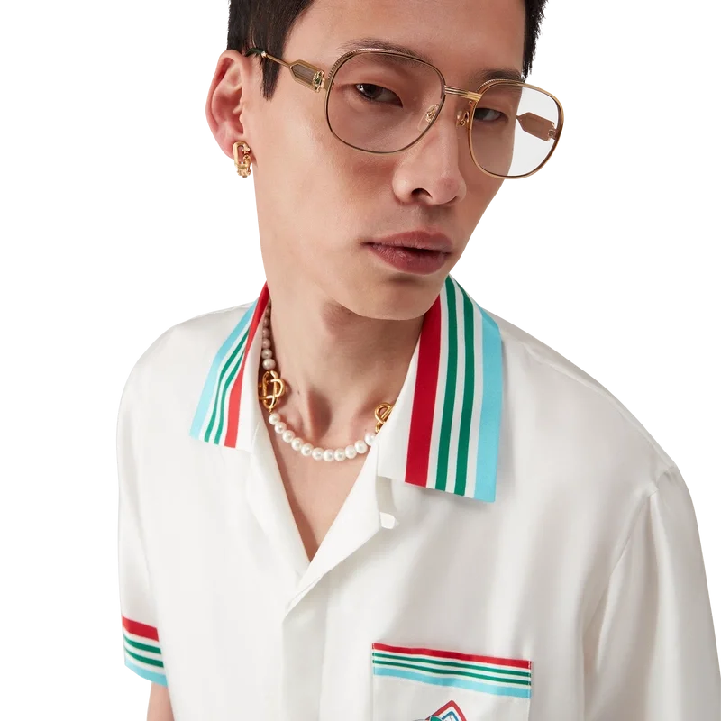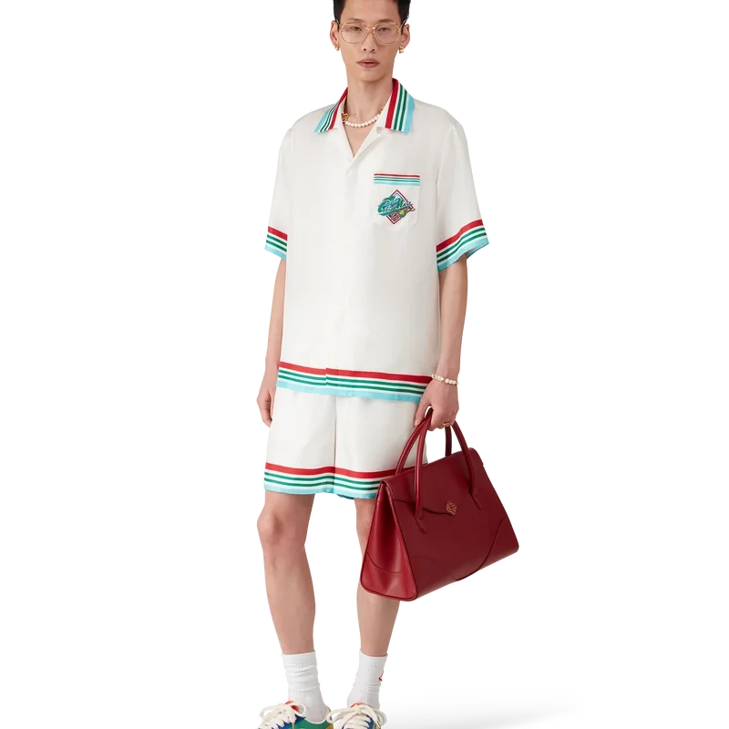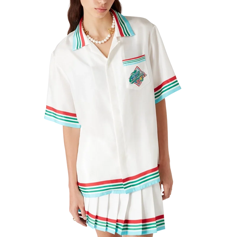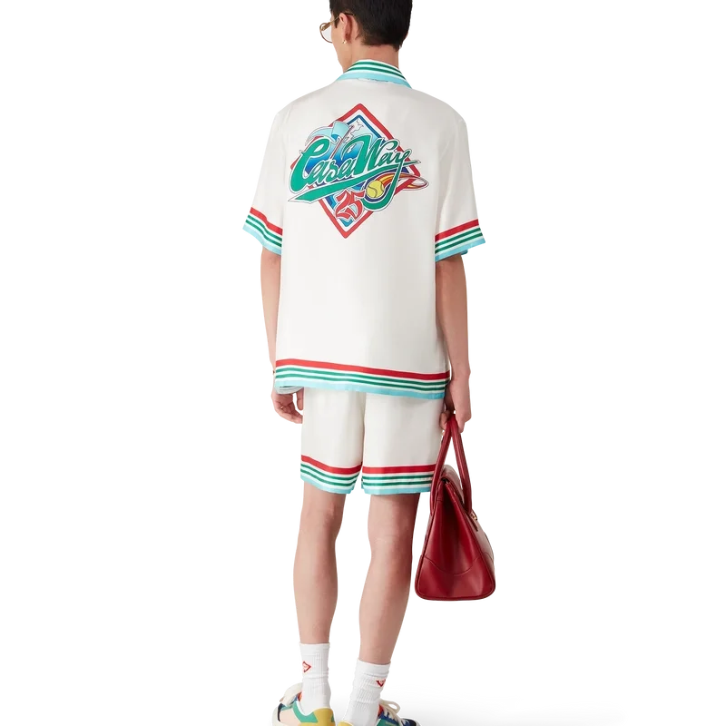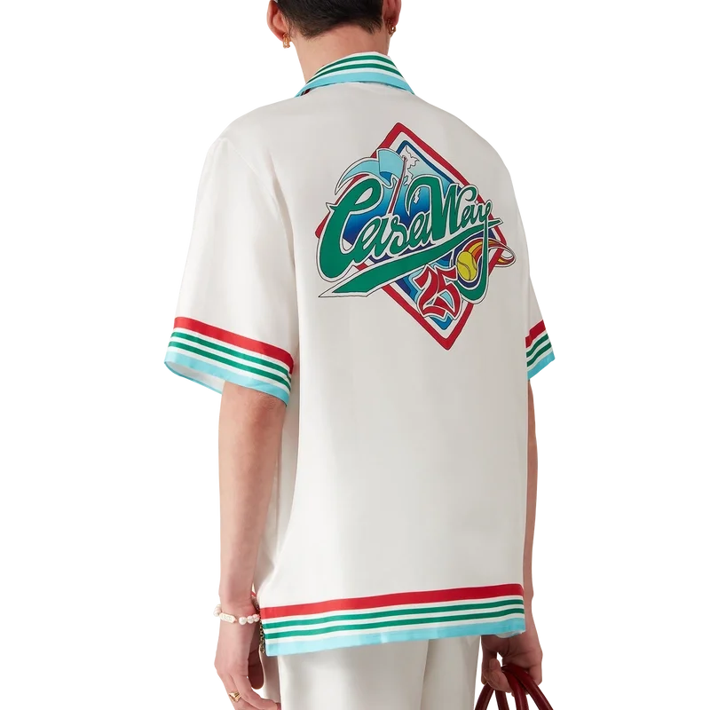 Das Casa Way World Series Seidenhemd ist ein bedrucktes Kurzarm-Modell mit dem Artwork der Saison, das klassische amerikanische Baseball-Symbole für Casa Way Tennis neu interpretiert und aus Seidentwill gefertigt ist.