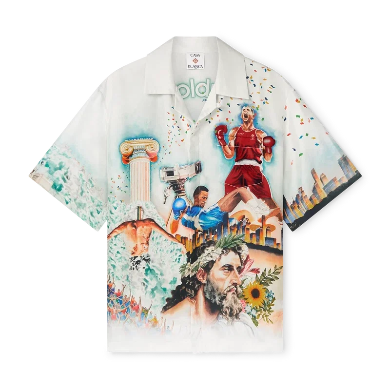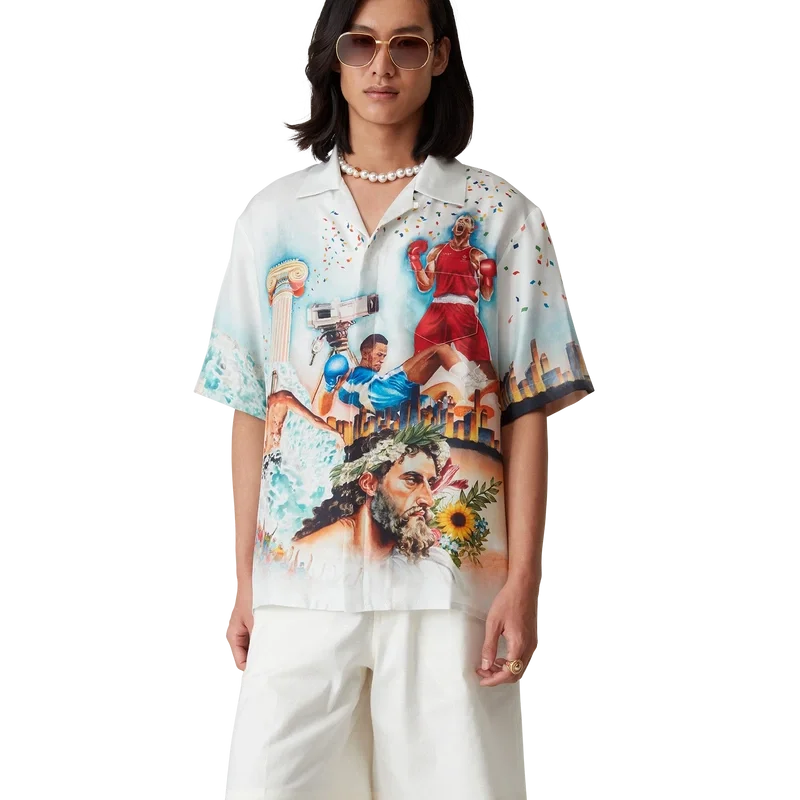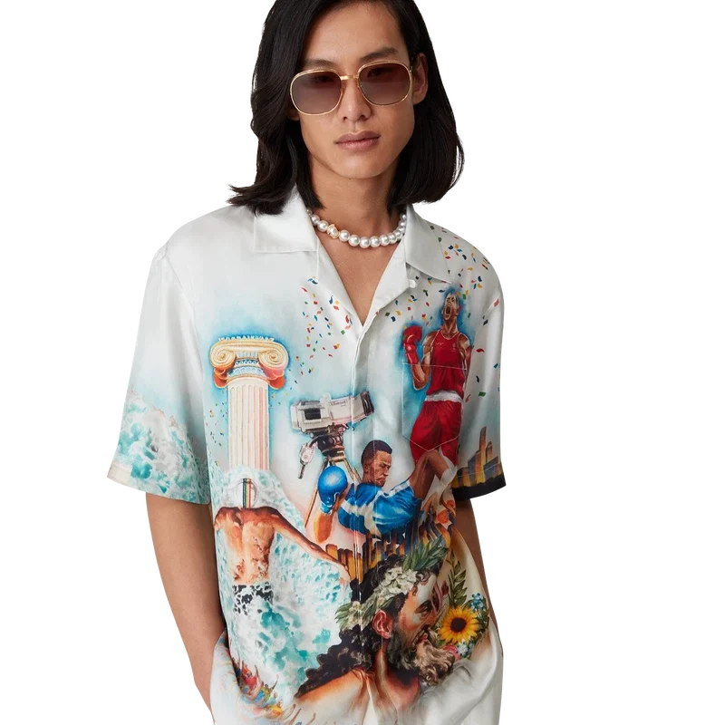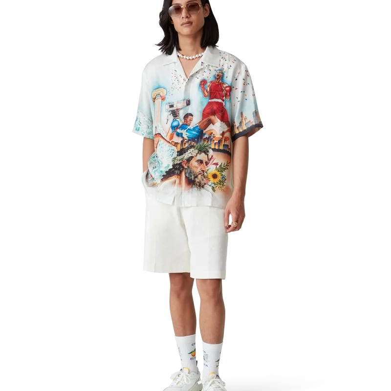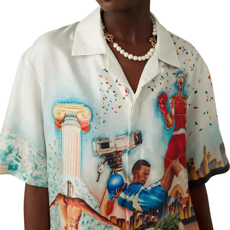 Das Celebration Du Sport Seidenhemd ist ein kurzärmeliges Modell mit Allover-Print aus Seidentwill, das mit saisonalen Motiven verziert ist. Diese sind inspiriert von der Interpretation des Hauses eines klassischen Filmplakat-Layouts mit unseren eigenen Figuren in dieser Welt. Abgerundet wird das Design durch die charakteristischen Corozo-Knöpfe mit ineinander verschlungenem Cc-Logo, einen verdeckten Knopfverschluss, eine Brusttasche und einen kubanischen Kragen.