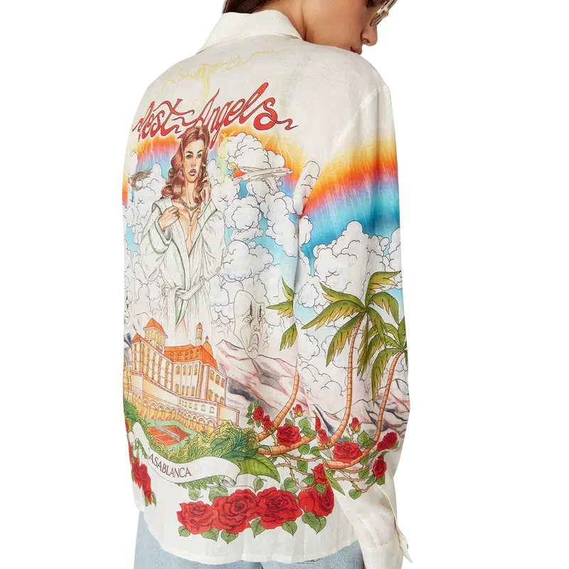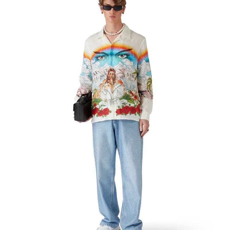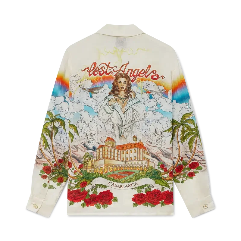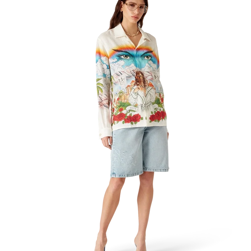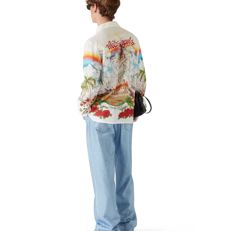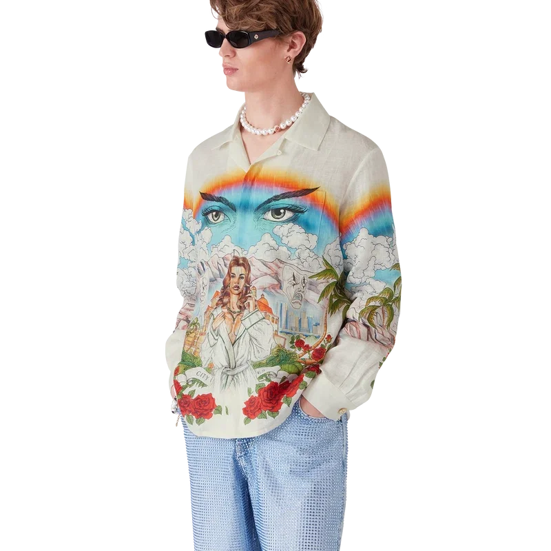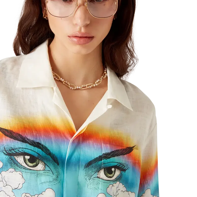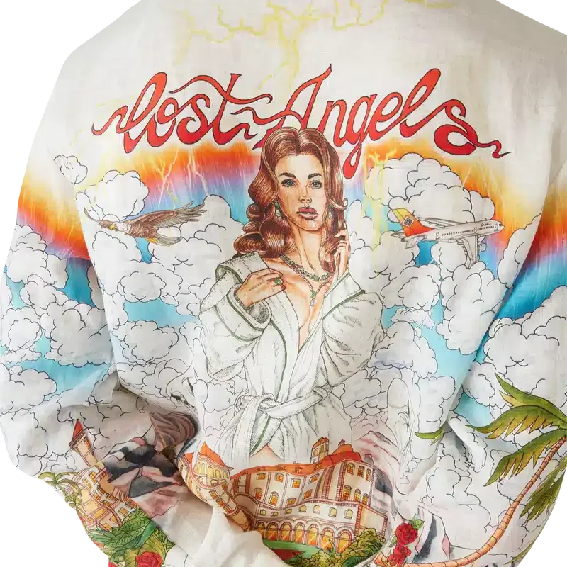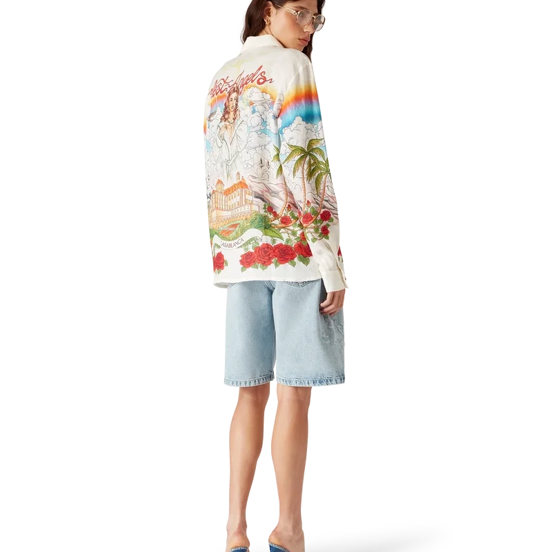 Das Chateau-Leinenhemd ist ein bedrucktes Langarmmodell mit einem Motiv, das auf die dramatische Geschichte einer jungen, aufstrebenden Schauspielerin anspielt, die im berühmten Chateau Marmont Hotel in Los Angeles wohnt. Abgerundet durch einen verdeckten Knopfverschluss, ineinander verschlungene CC-Corozo-Knöpfe, einen kubanischen Kragen und einen emaillierten Knopf mit Goldrand an jedem Ärmelbund.