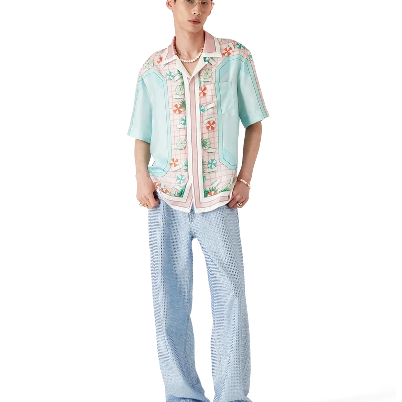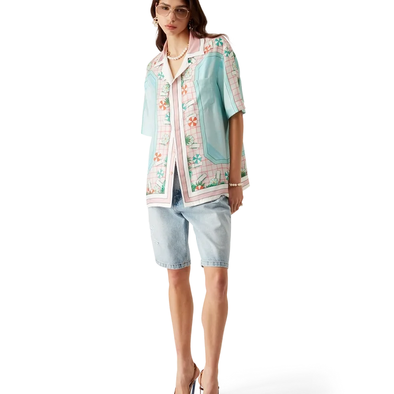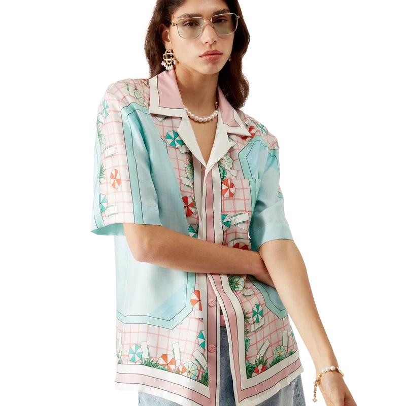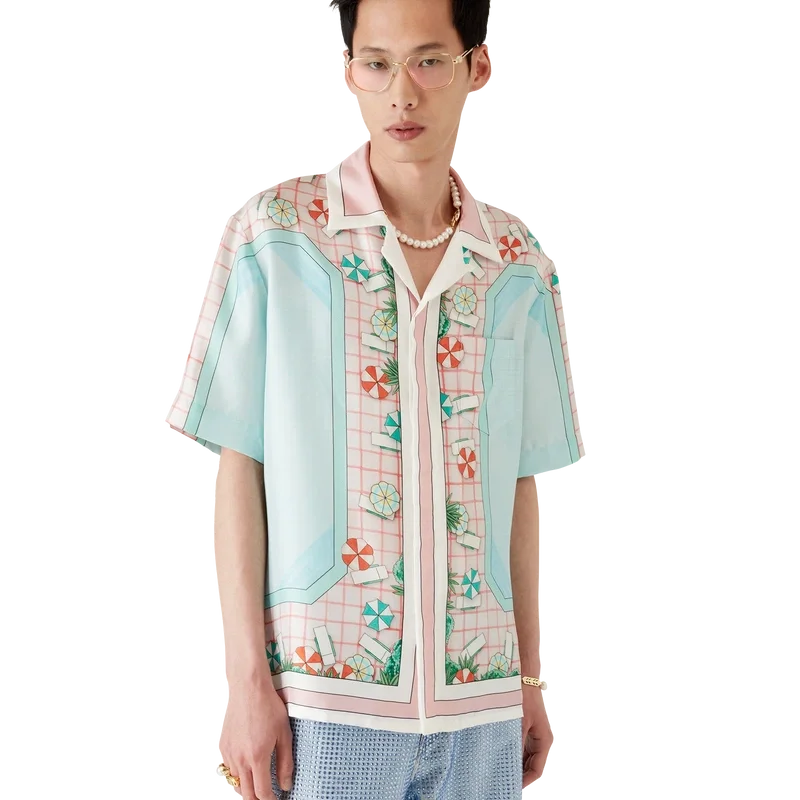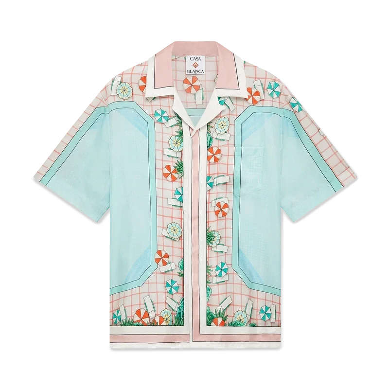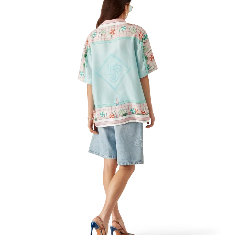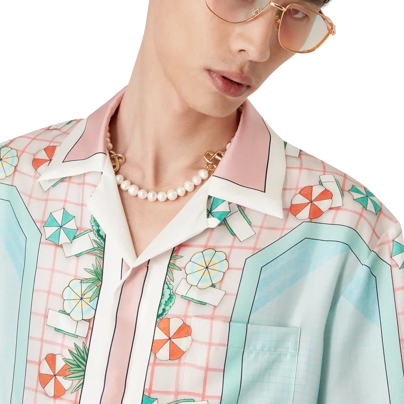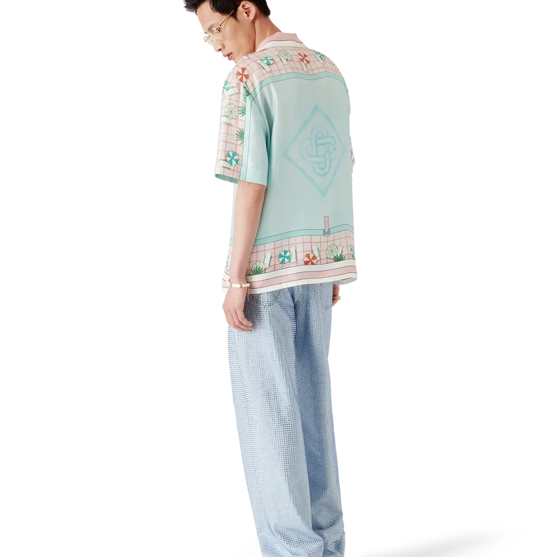 Das kurzärmelige Seidenhemd „Copacabana“ ist ein durchgehend bedrucktes Design mit dem charakteristischen Kunstwerk des Hauses, inspiriert von einem Hotelpool und Reiseidealen. Es zeigt einen wunderschönen Tag am Pool aus der Vogelperspektive – und vermittelt so eine neue Sichtweise. Hergestellt aus Seidentwill.