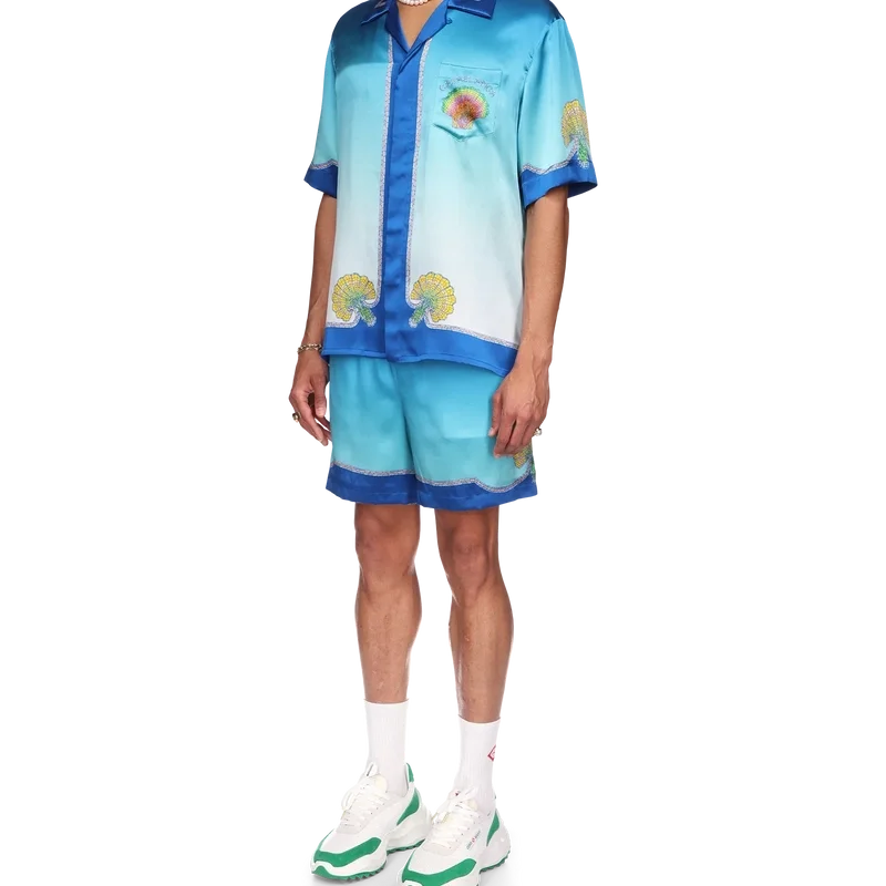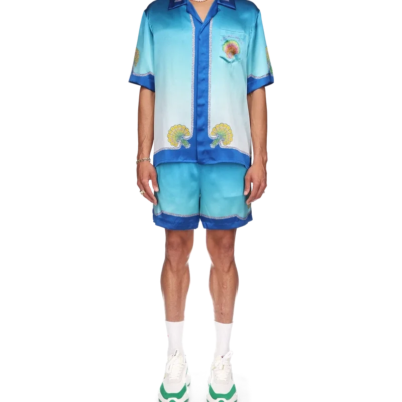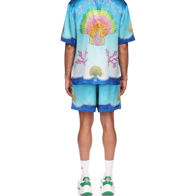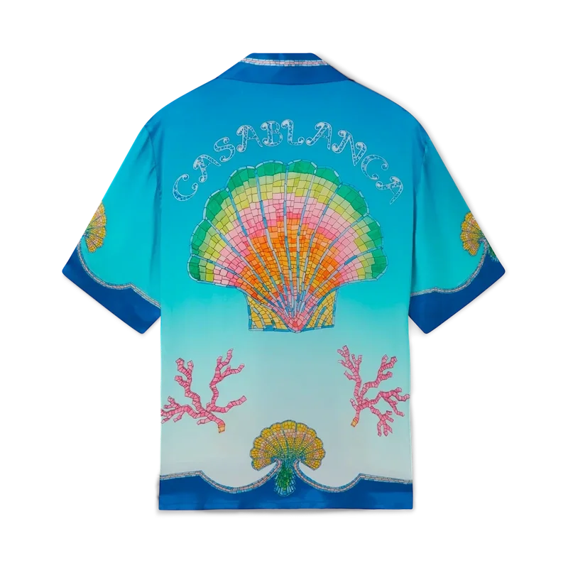 Das Coquillage Colora Seidenhemd ist ein kurzärmeliges Modell mit Allover-Print, das sich durch das Mosaik-Regenbogen-Muschel-Farbverlaufsmuster auf einem bekannten blauen Ombré-Seidentwill-Stoff auszeichnet. Abgerundet wird es durch eine Knopfleiste vorne, einen offenen Kubanerkragen, eine Brusttasche sowie Kontrastdetails an Kragen, Manschetten und Saum.