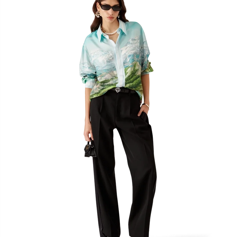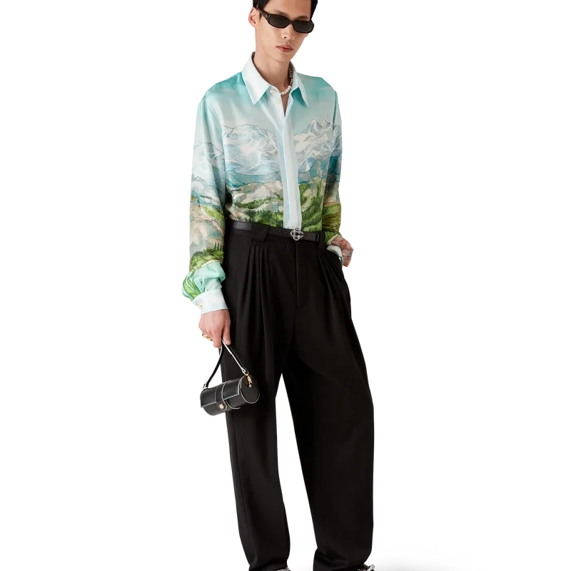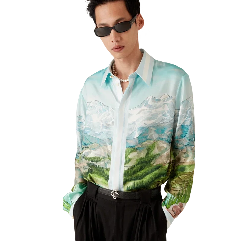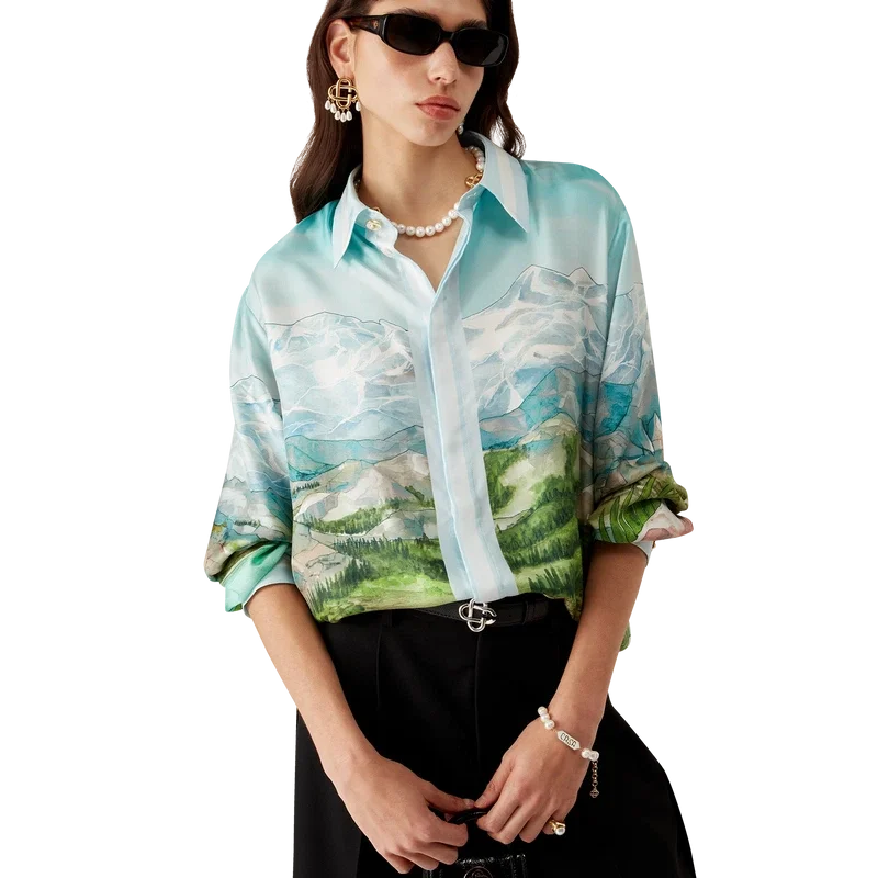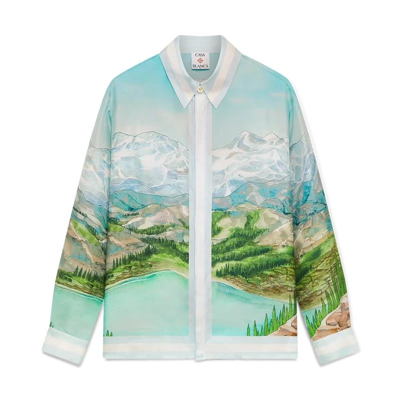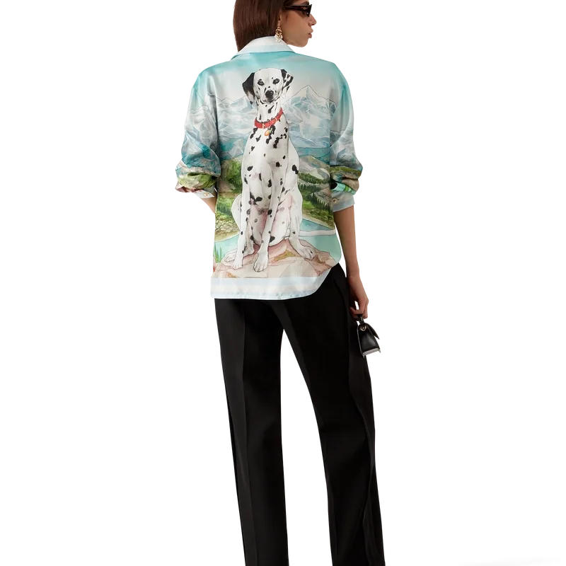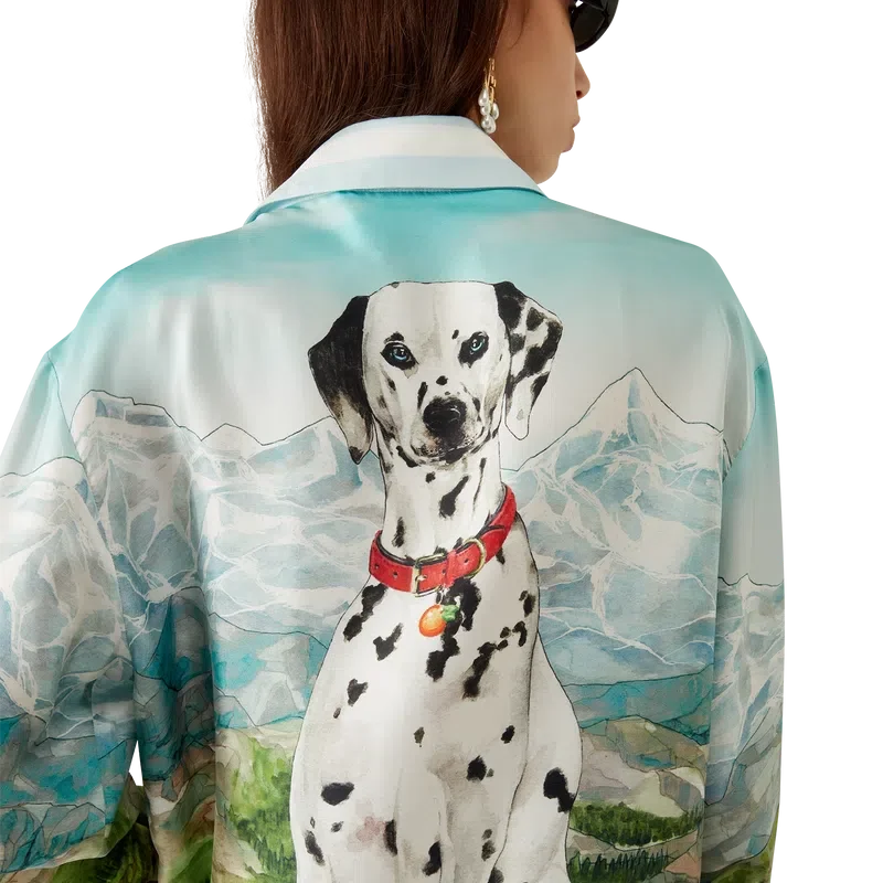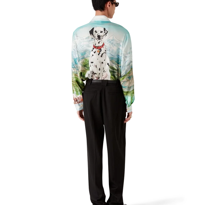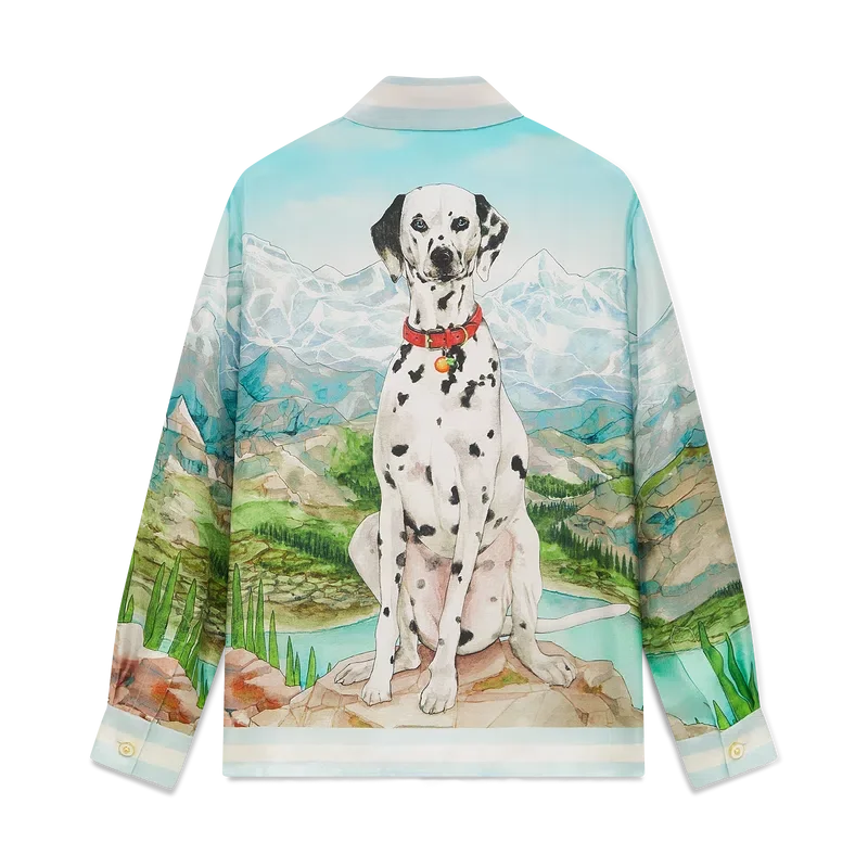 Das Dalmatian a La Montagne Seidenhemd mit langen Ärmeln ist ein durchgehend bedrucktes Design aus Seidentwill mit dem charakteristischen Motiv des Hauses, das eine Landschaft mit schneebedeckten Bergen, Seen und einem Dalmatiner zeigt.
