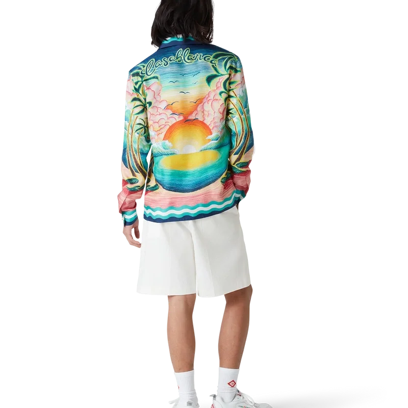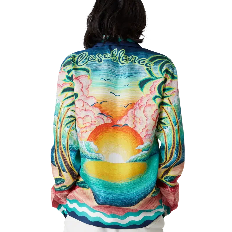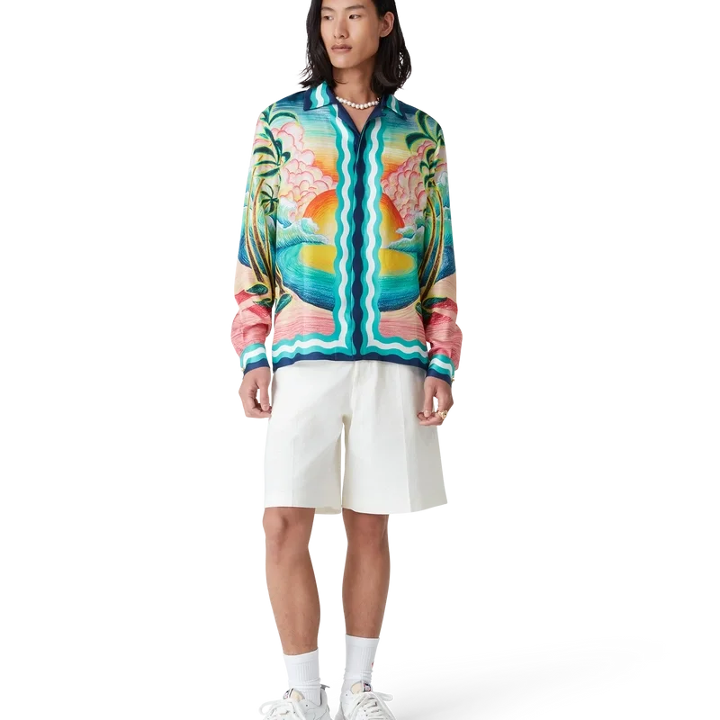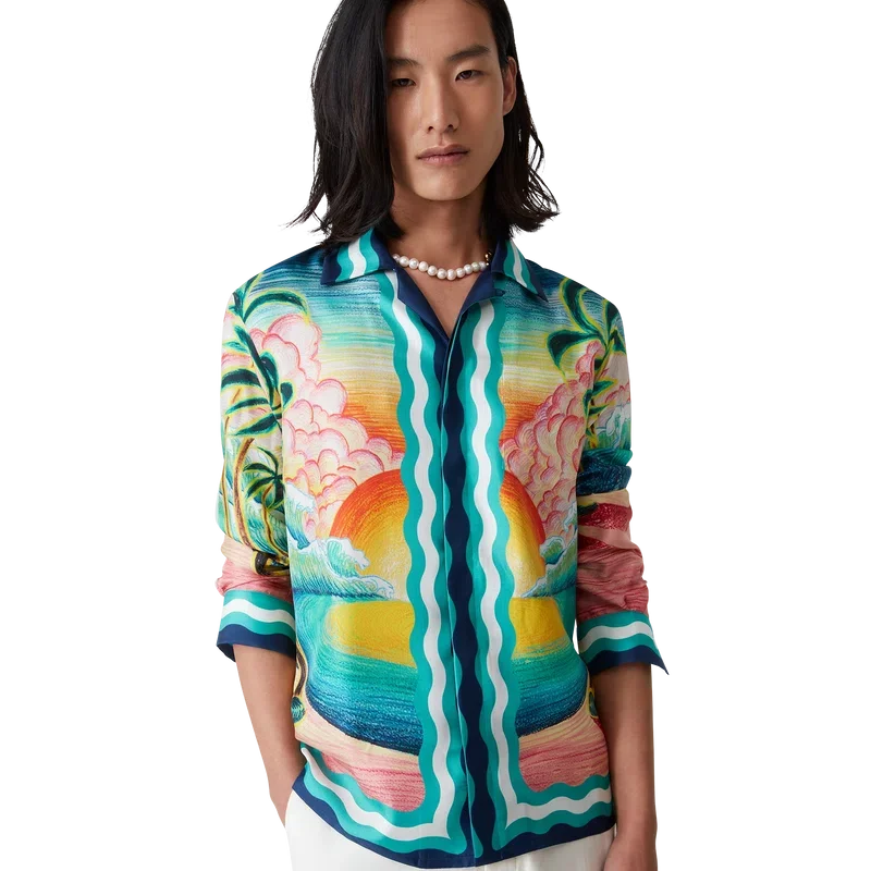 Das Seidenhemd „Danse De La Mer“ ist ein langärmeliges Modell mit durchgehendem Druck, das speziell für die Kollektion entworfene handgemalte Motive zeigt und aus Seidenstoff gefertigt ist. Es verfügt über einen Knopfverschluss, ineinander verschlungene Cc-Logo-Knöpfe aus Corozo, charakteristische emaillierte Knöpfe mit goldenem Rand sowie Streifen-Details am Saum, an den Manschetten, am Kragen und an der Knopfleiste, die von Memphis-Wellenmustern inspiriert sind.