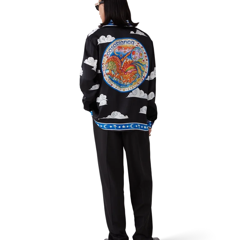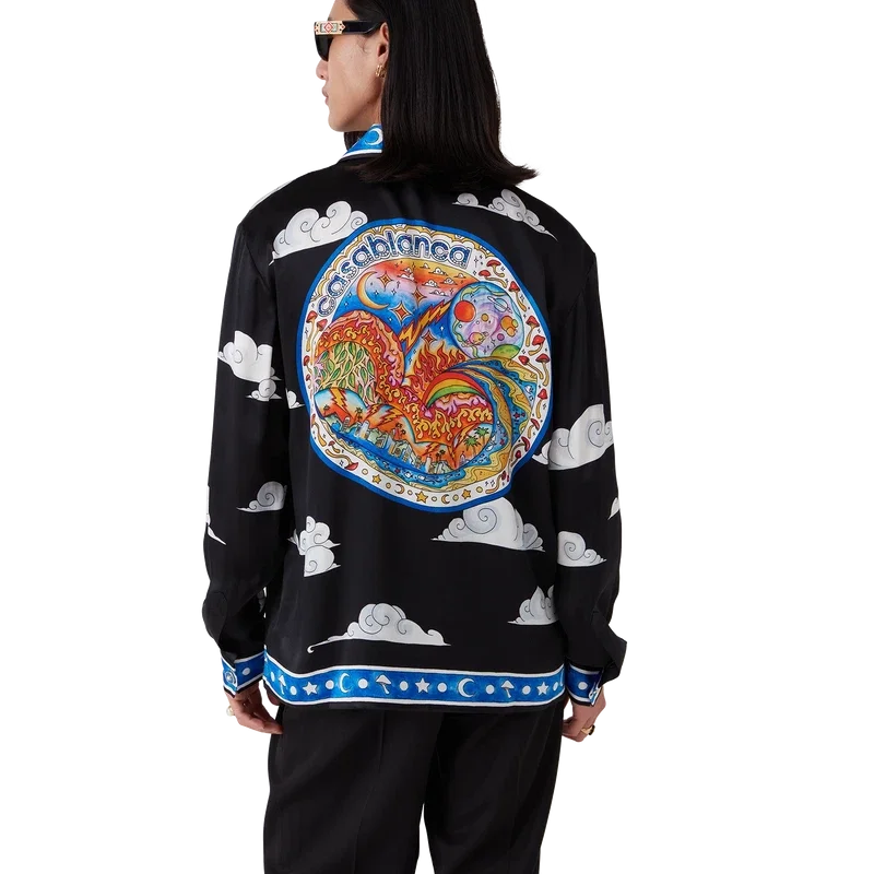 Das „The Four Elements“-Seidenhemd ist ein langärmeliges, durchgehend bedrucktes Modell aus Seidensatin mit einem Design, das alle Elemente von La vereint: Skyline, Strand, Feuer, Vegetation und Astronomie. Ausgestattet mit einem Kubanerkragen, einer Brusttasche, einem verdeckten Knopfverschluss mit ineinander verschlungenen Cc-Logo-Knöpfen aus Corozo, einem goldrandigen Emailleknopf an jedem Manschettenbund sowie Kantenverzierungen an Kragen, Manschetten, Knopfleiste, Saum und Tasche.<!–
