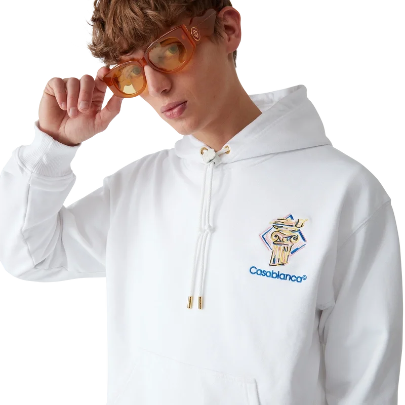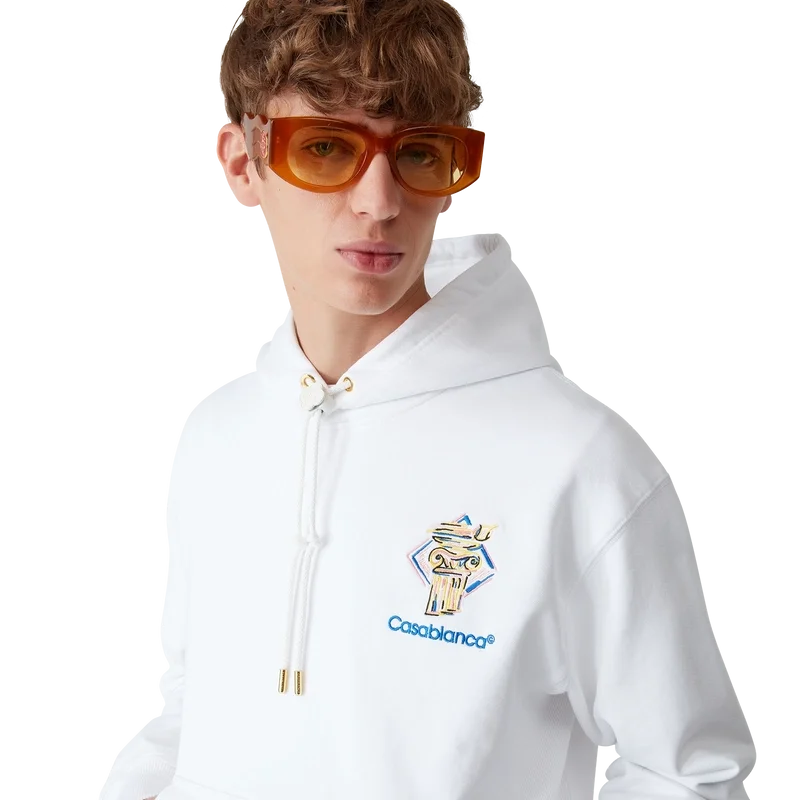 Das Diamond Column Hooded Sweatshirt ist ein langärmeliges, klassisches Design aus Bio-Baumwollstoff mit der für das Haus typischen Kreide-Ikonografie einer Säule. Abgerundet wird es durch eine Kapuze mit goldfarbenen Kordelenden für sicheren Verschluss, eine Känguru-Fronttasche sowie gerippte Bündchen und Saum.