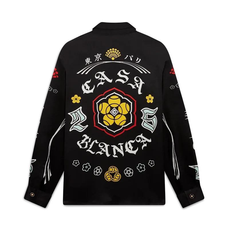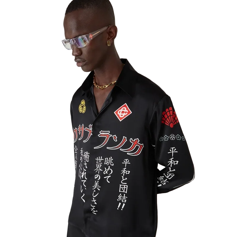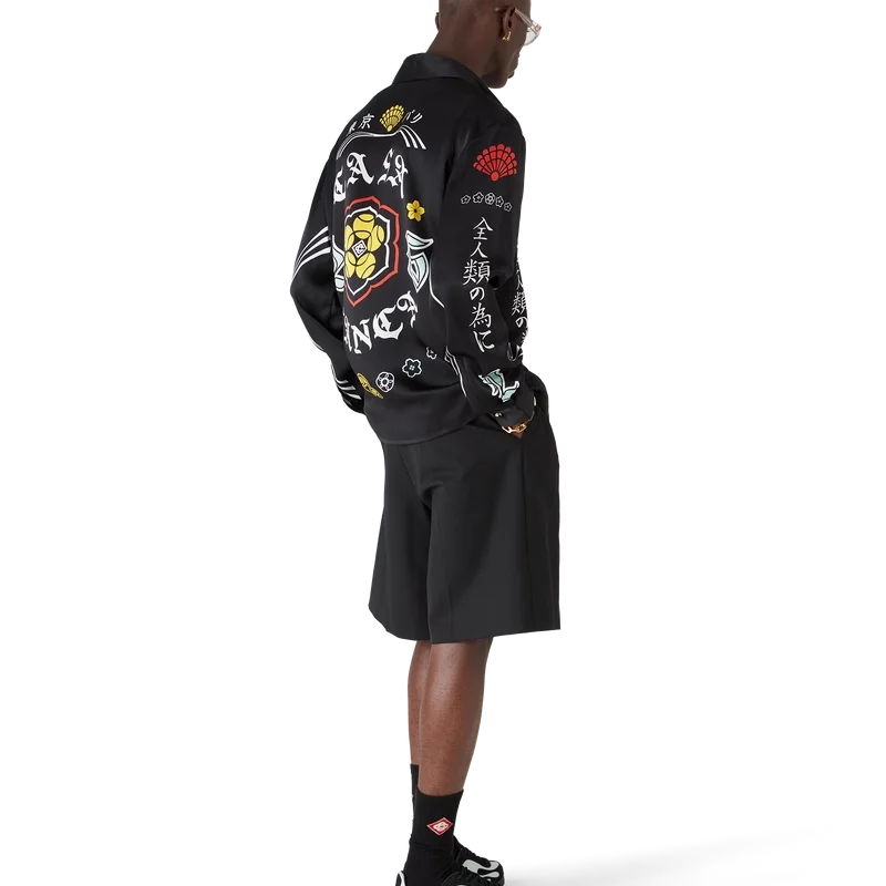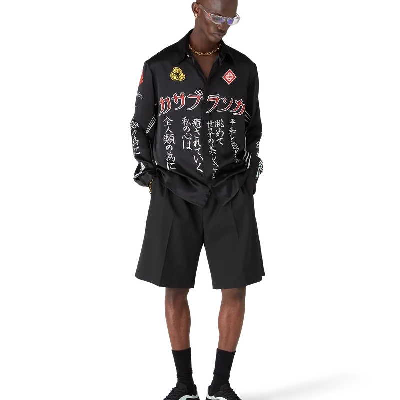Das langärmelige Seidenhemd „Emblem“ ist ein bedrucktes Design mit den Motiven der Saison – für eines unserer Hauptthemen haben wir uns von der japanischen Subkultur der BōSōZoku inspirieren lassen. Der Kontrast zwischen grafischen Elementen und Text erinnerte uns sehr an Casablanca. Wir haben unsere eigene Interpretation geschaffen und dabei Sätze integriert, die die Marke beschreiben, wie zum Beispiel „Looking at the Beauty of the World“. Das Layout ist unkonventionell, aber die Komposition ist sorgfältig ausbalanciert, was dem Shirt eine einzigartige und dennoch harmonische Ausstrahlung verleiht. Abgerundet wird es durch einen Spitzkragen, einen Knopfverschluss, Corozo-Knöpfe mit dem „Interlocking Cc“-Logo sowie emaillierte Knöpfe mit Goldrand an den Manschetten und am Kragen.