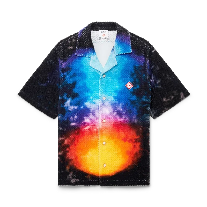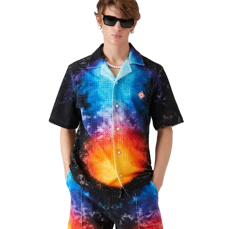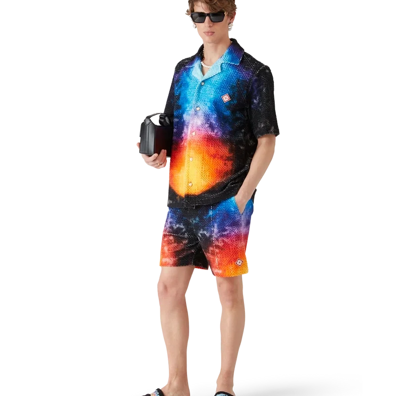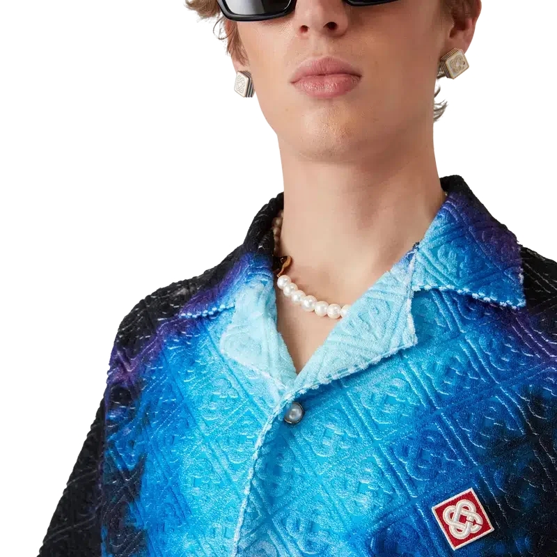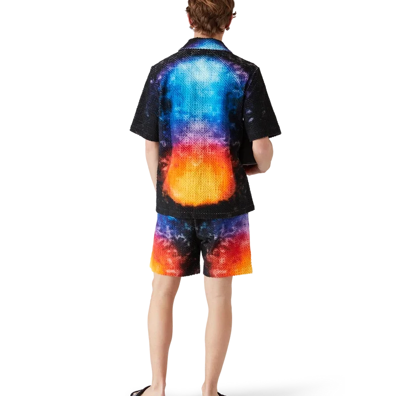 Das „Gradient Towelling Shirt“ ist ein bedrucktes Kurzarm-Hemd aus Jacquard-Frottee mit Farbverlauf, das den Farbtrend der Saison aufgreift. Es verfügt über einen Kubanerkragen, einen Knopfverschluss, Corozo-Knöpfe mit dem „Interlocking Cc“-Logo sowie eine Brusttasche. Es ist dazu gedacht, zusammen mit den passenden „Gradient Towelling Shorts“ getragen zu werden.