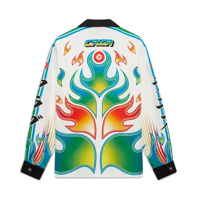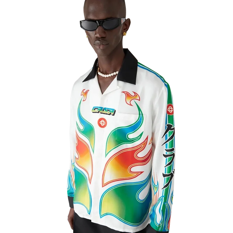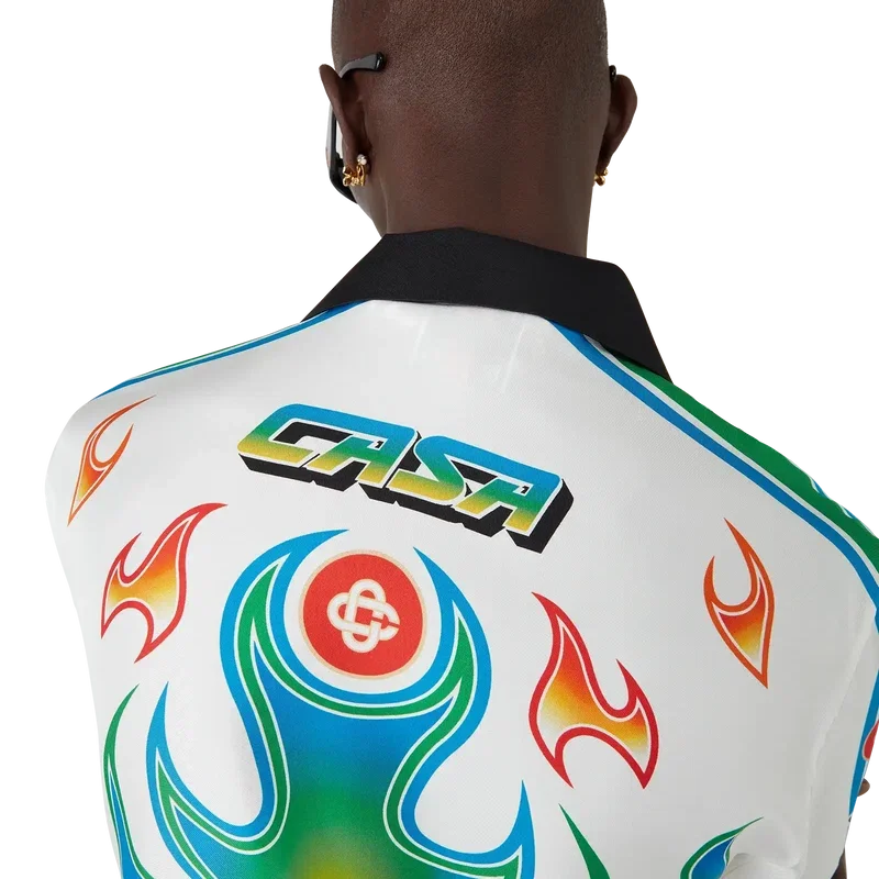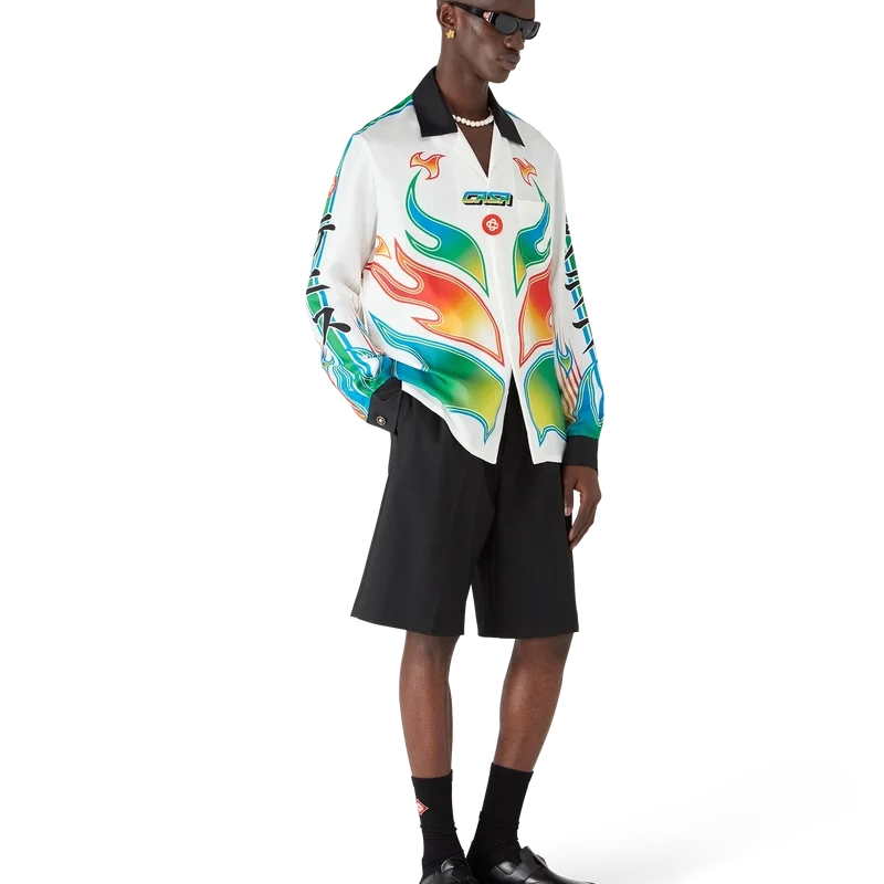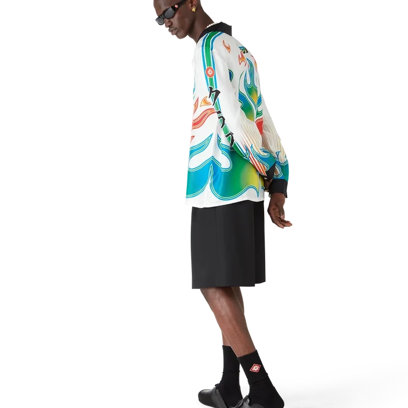 Das langärmelige Seidenhemd „Flame Laurel“ ist mit einem Druck versehen, der das „Flames“-Motiv der Saison zeigt – eine moderne Interpretation unseres „Laurel“-Oberteils aus der Nigerian-Kollektion, inspiriert von den auffälligen Grafiken auf Fußballtrikots. Wir haben Elemente aus japanischen Vintage-Fußballtrikots integriert, darunter grafische Designs und Typografie, einschließlich Text auf den Ärmeln für den klassischen sportlichen Look. Abgerundet wird das Design durch einen Kubanerkragen, einen Knopfverschluss, Corozo-Knöpfe mit dem ineinander verschlungenen Cc-Logo, goldrandige Emaille-Knöpfe an den Manschetten, eine Brusttasche sowie kontrastierende schwarze Details an Kragen, Manschetten und Saum.