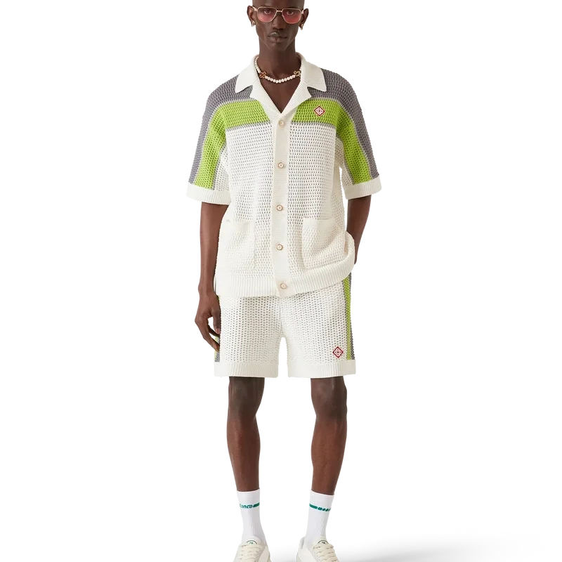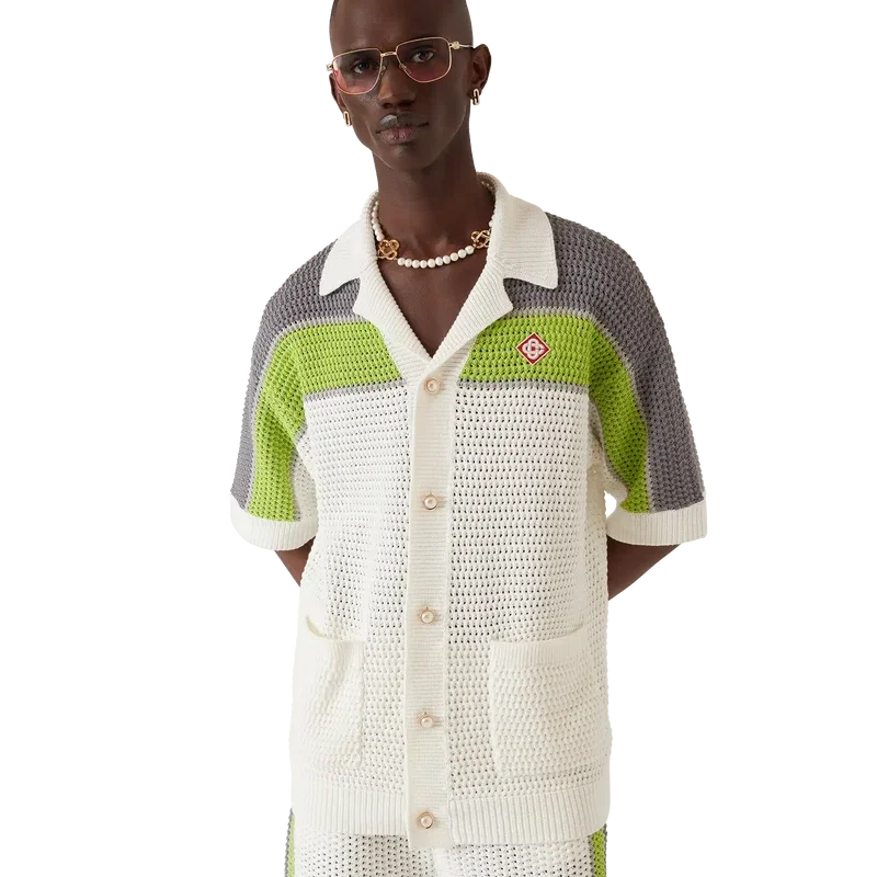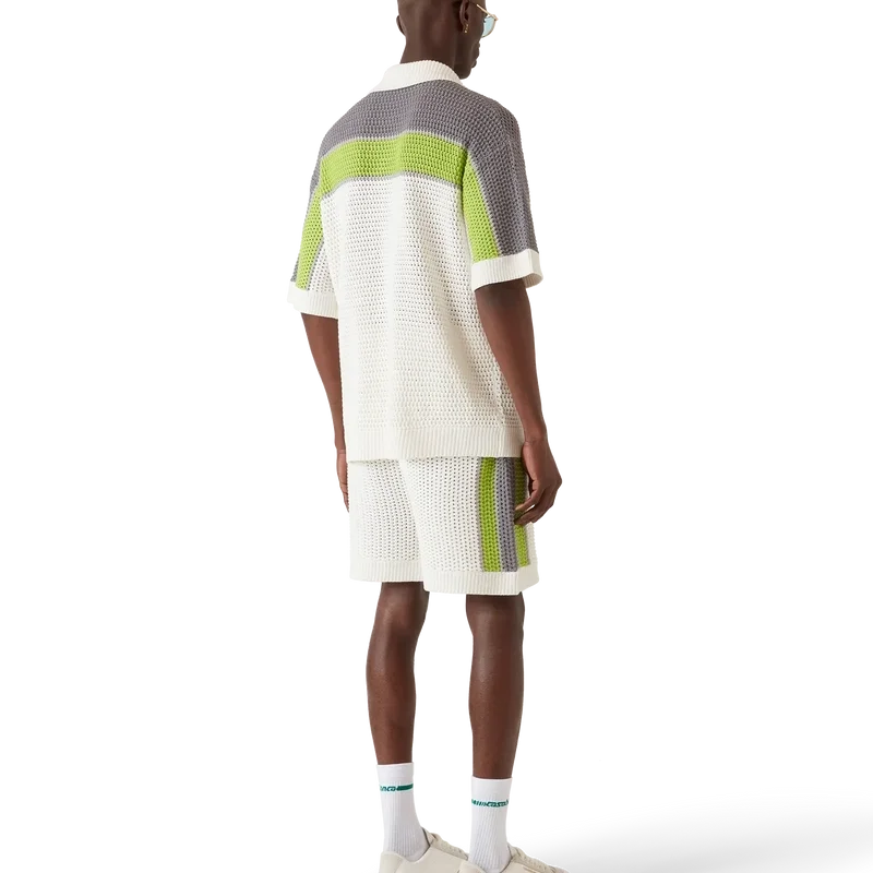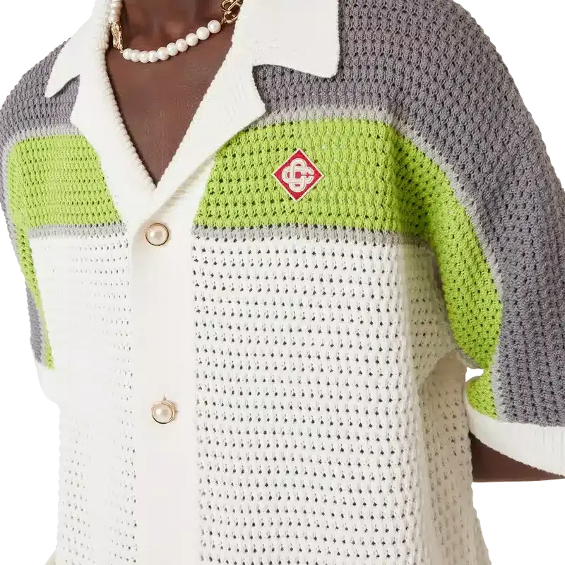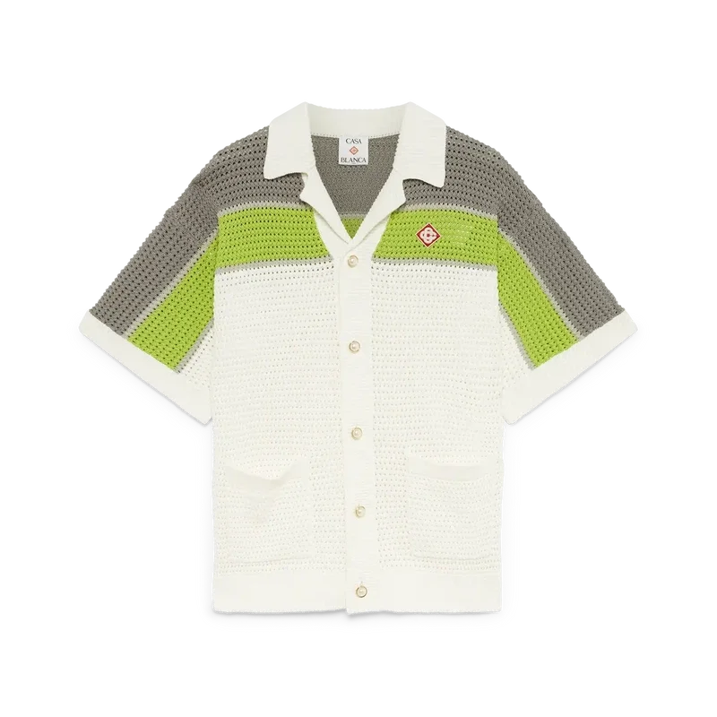Das gestreifte Häkelhemd ist ein raffiniertes, klassisches Design mit dem Warped-Logo des Hauses und Streifendetails an Schultern, Brust und Ärmeln in Naturfarben. Mit geripptem Kragen, Manschetten und Saum, Knopfleiste vorne, aufgesetzten Taschen vorne, charakteristischen goldenen Perlenknöpfen und einer lockeren Silhouette.