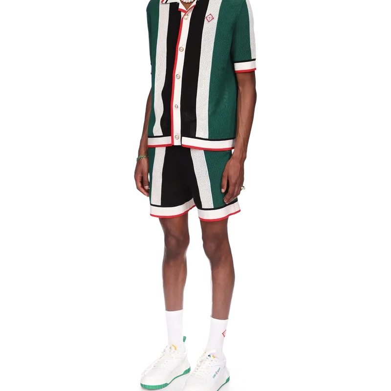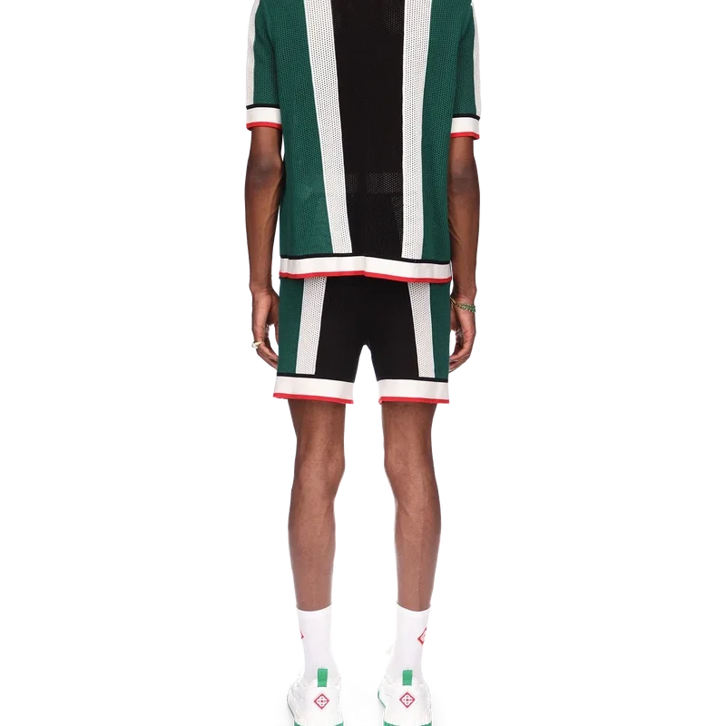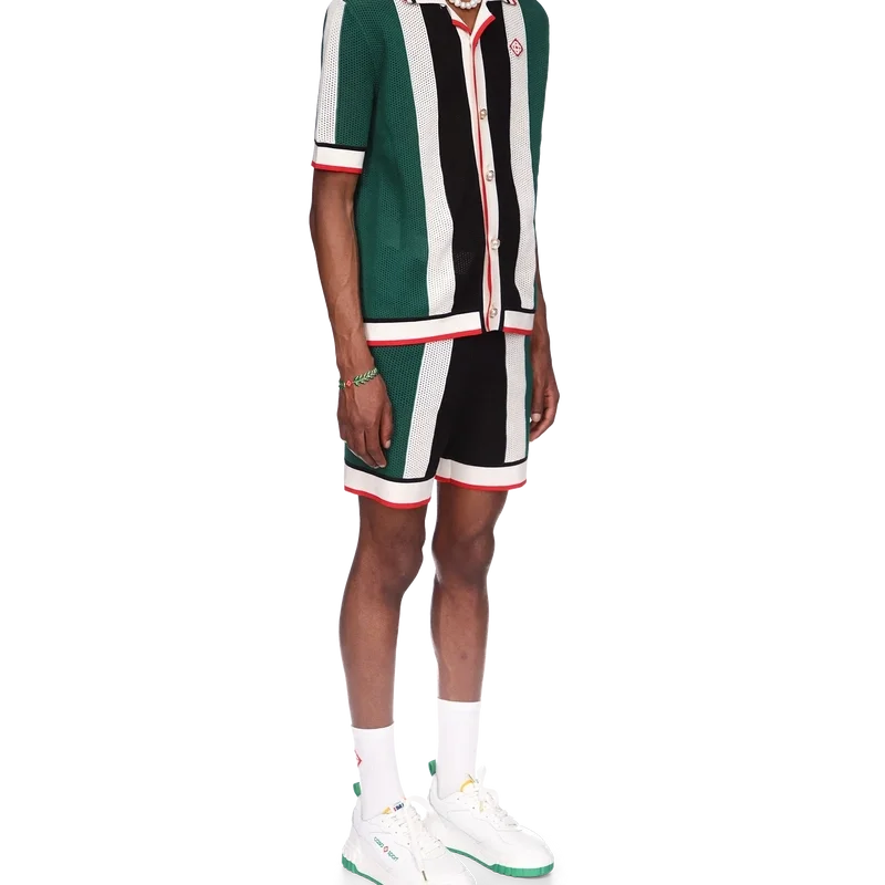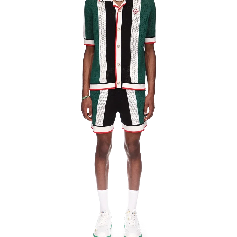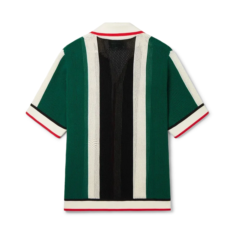 Das gestreifte Mesh-Hemd ist ein kurzärmeliges Modell, inspiriert von den Farben der nigerianischen Flagge, gefertigt aus einem gestrickten Bio-Baumwollstoff mit dem Diamond-Logo-Patch des Hauses. Abgerundet durch einen gerippten Kragen, Ärmelbündchen, Knopfleiste, Saum, Knopfverschluss und die charakteristischen goldgeränderten Perlenknöpfe.
