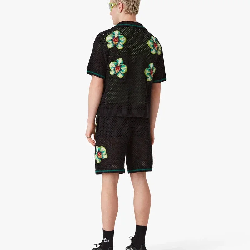 Das Glitch Orchid bestickte Kurzarm-Häkel-Shirt mit Shorts besticht durch ein raffiniertes Design mit einem Motiv, das den kontrastreichen Designansatz der Schnittstelle zwischen Natur und Mensch verkörpert und durch die Darstellung der natürlichen Schönheit der Orchideenblüte Harmonie vermittelt. Abgerundet wird das Design durch einen gerippten Saum, eine Knopfleiste, einen Kragen im kubanischen Stil, einen Knopfverschluss und die charakteristischen goldgerahmten Perlenknöpfe.