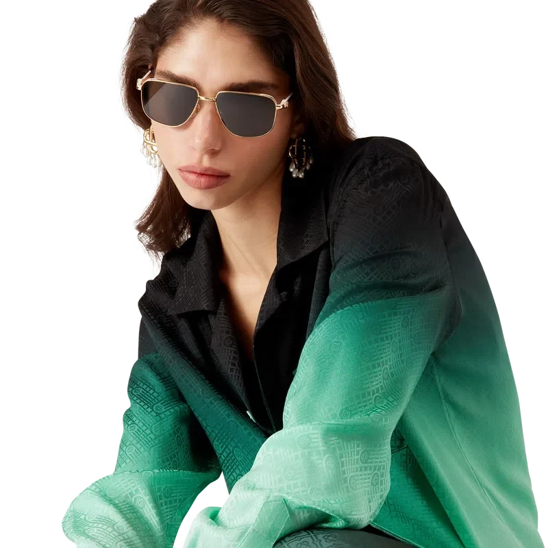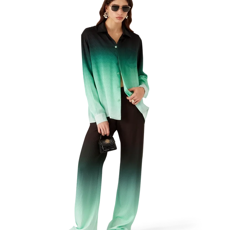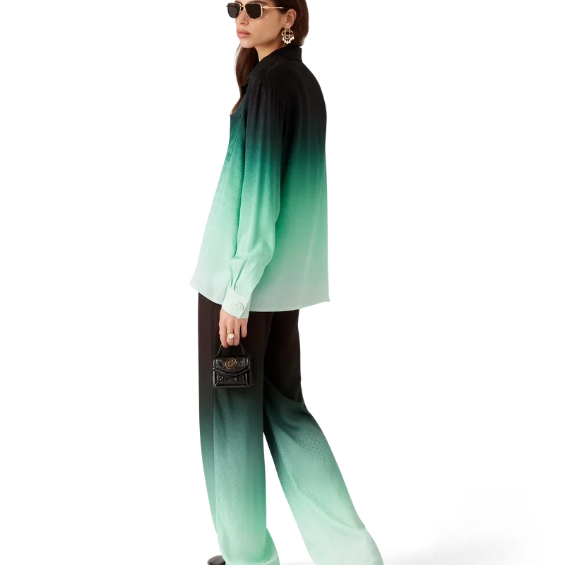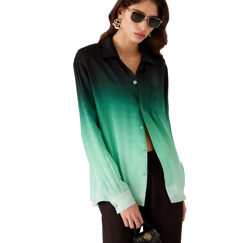 Das Gradient Ping Pong Jacquard-Seidenhemd ist ein langärmeliges Modell mit durchgehendem Druck – es zeigt ein klassisches Monogramm, das für unsere erste japanische Kollektion entwickelt wurde und sich wiederholend Ping-Pong-Bälle in diagonaler Bewegung darstellt – gefertigt aus einem Monogramm-Seidentwill. Abgerundet durch einen Kubanerkragen, einen Knopfverschluss, Corozo-Knöpfe mit ineinander verschlungenem CC-Logo und die charakteristischen emaillierten Knöpfe mit goldenem Rand an den Manschetten.