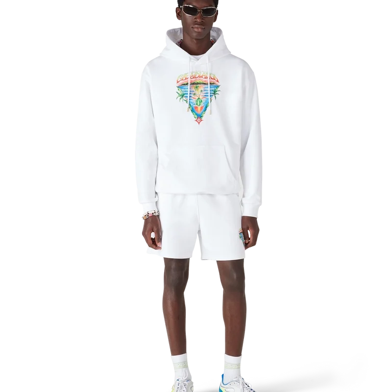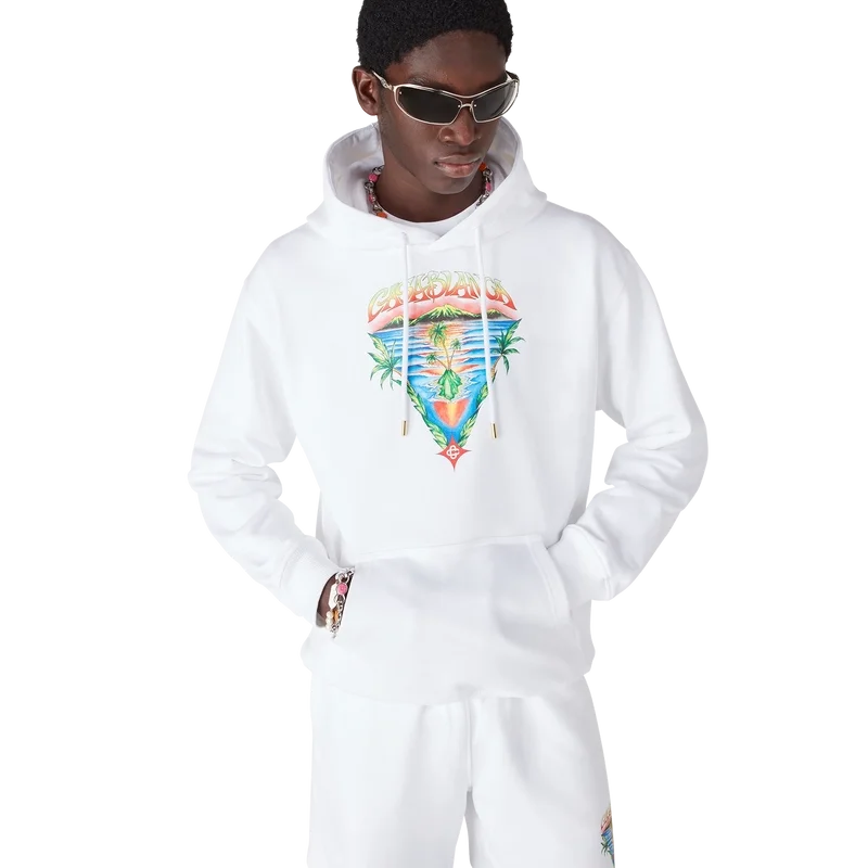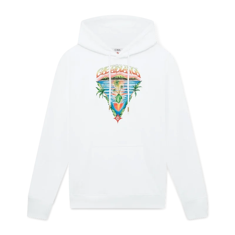 Der Innocence Triangle Hoodie ist ein luxuriöses Design mit einer Meereslandschaft bei Sonnenuntergang und einer Insel im Zentrum, dargestellt in einem Stil, der von klassischer Surf-T-Shirt-Kunst beeinflusst ist. Das Kunstwerk fängt die ätherische Schönheit der goldenen Stunde über tropischen Gewässern ein und präsentiert eine idealisierte Vision eines Strandparadieses durch die raffinierte Sport-Freizeit-Linse des Hauses.