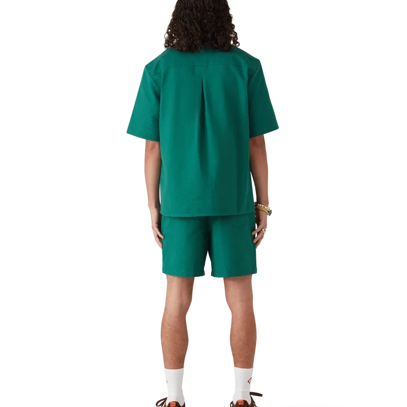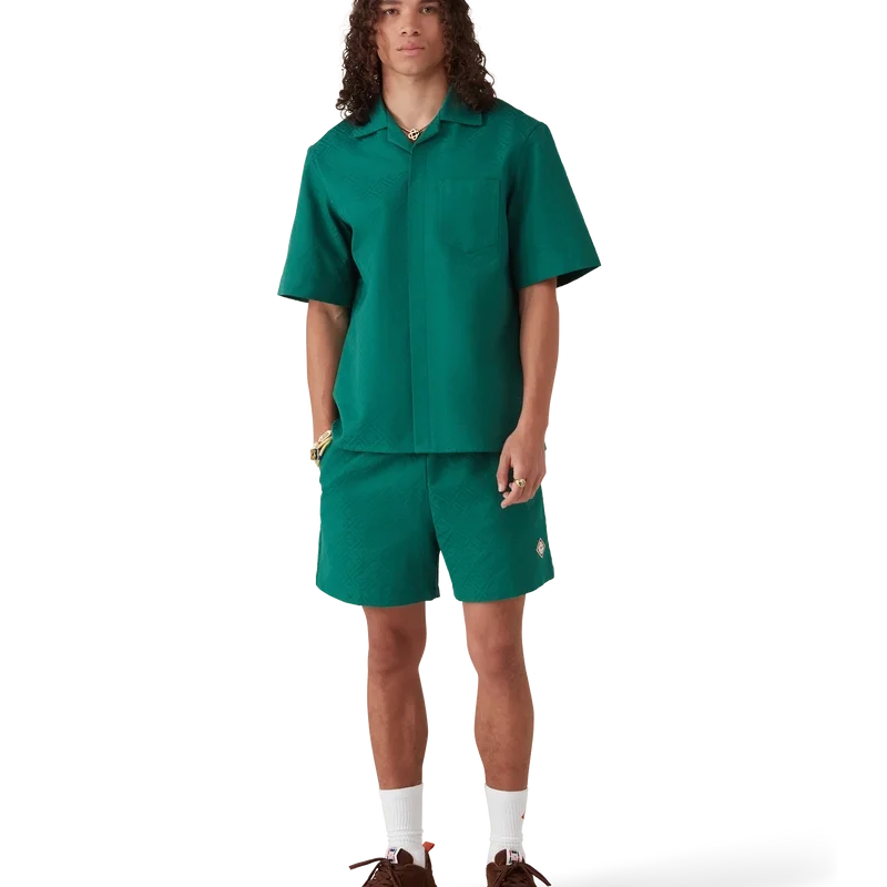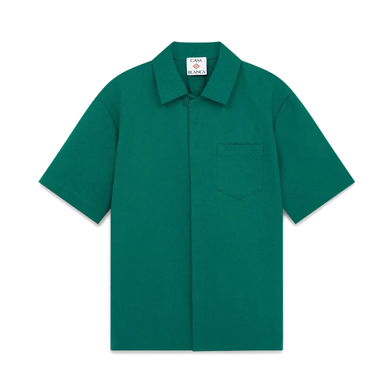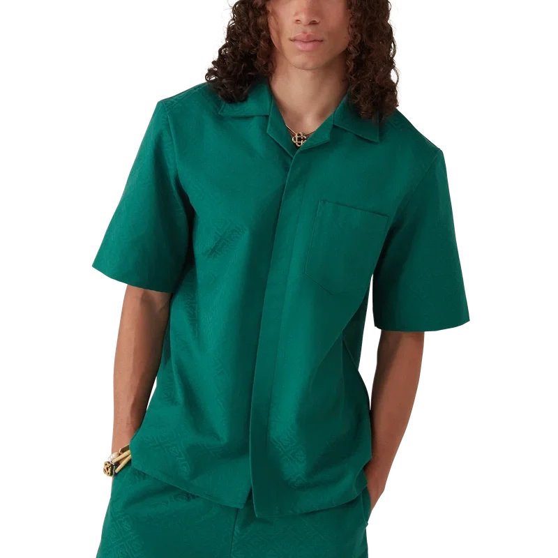 Das Baumwoll-Monogramm-Jacquard-Shirt mit kurzen Ärmeln ist ein klassisches Design aus einem Jacquard-Stoff mit Monogramm. Es verfügt über einen Kubanerkragen, einen Knopfverschluss, Corozo-Knöpfe mit dem Cc-Logo und eine umgekehrte Falte am Rücken.