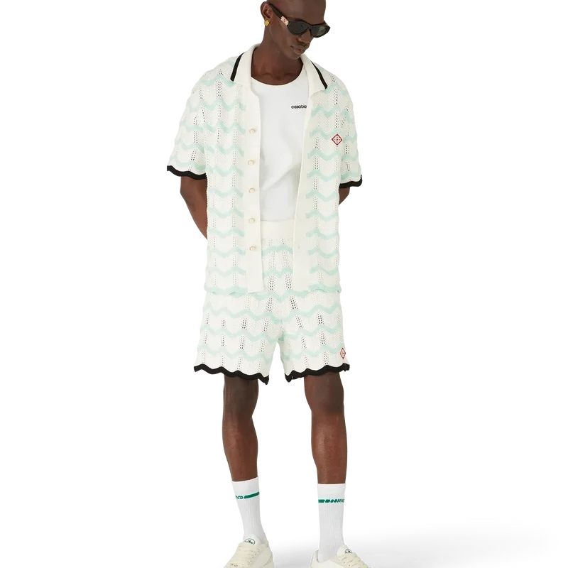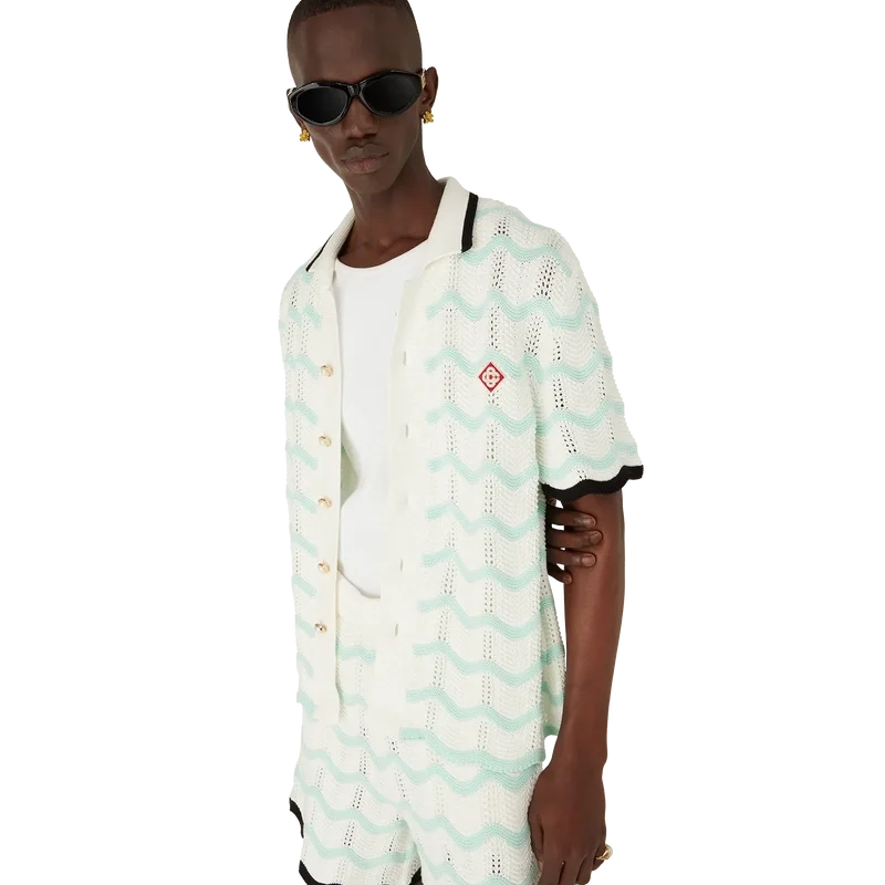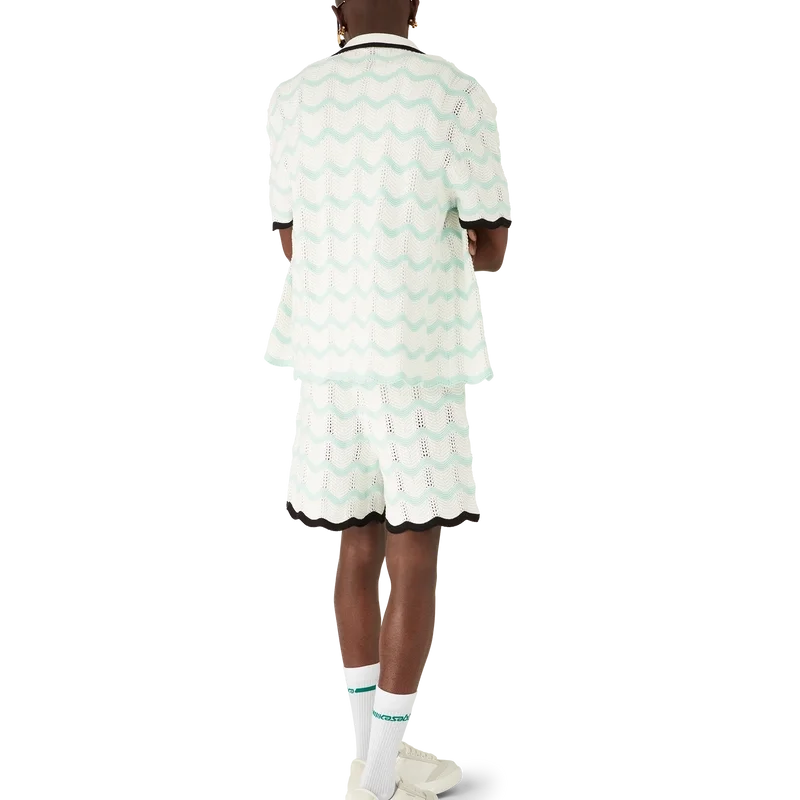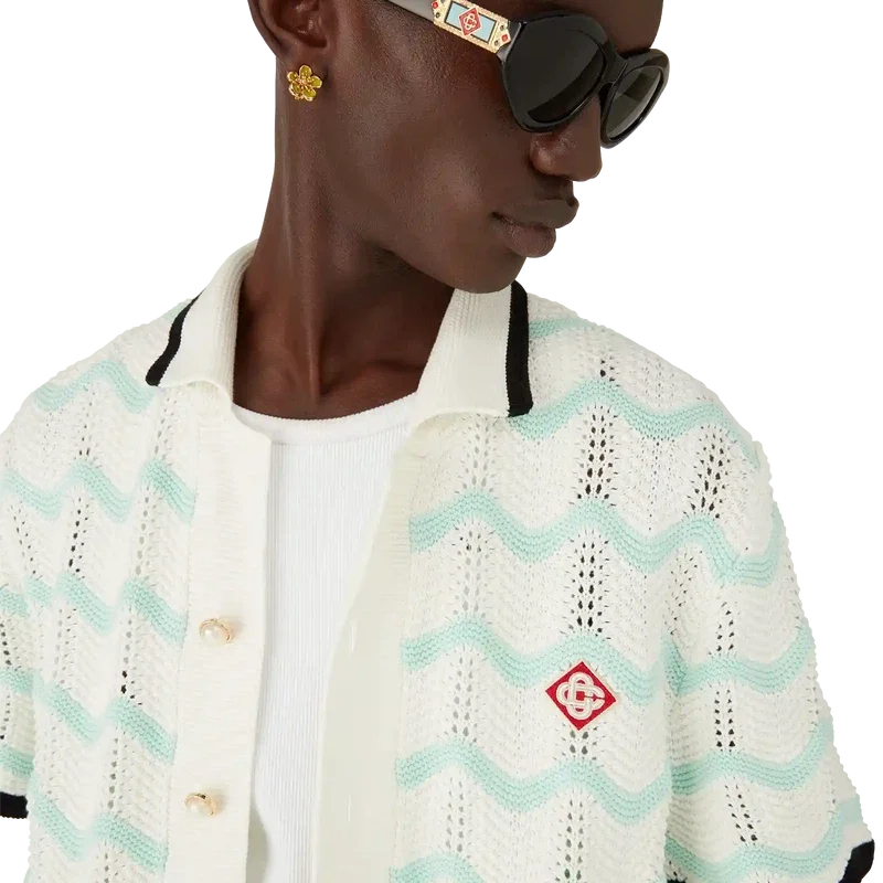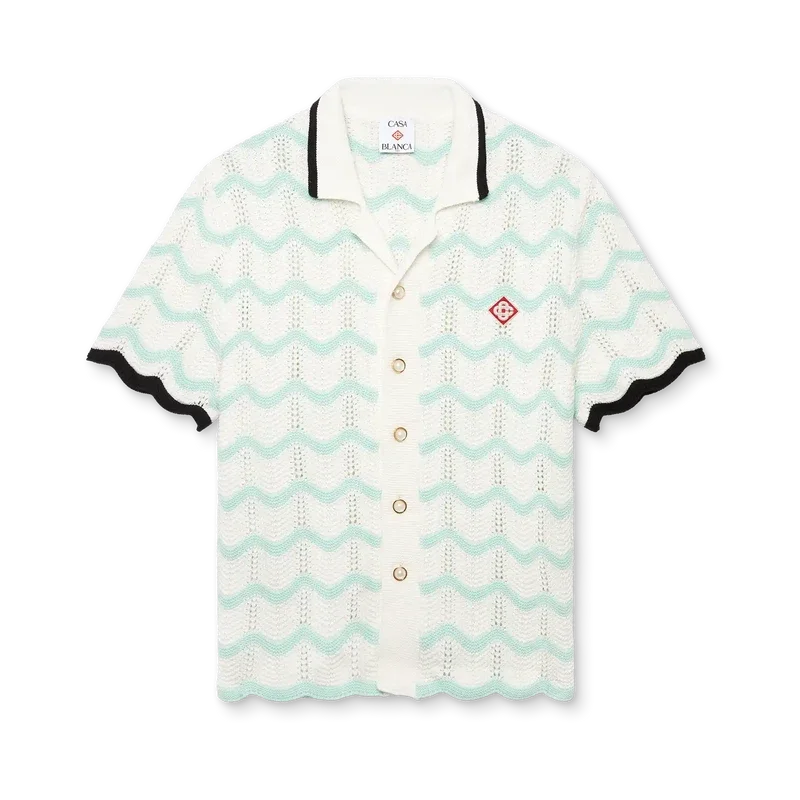 Das kurzärmelige Hemd aus gehäkelter Baumwolle mit Farbverlauf und Wellenmuster ist ein Strickdesign mit dem charakteristischen Rautenlogo des Hauses. Abgerundet wird es durch einen kontrastierenden schwarzen Rippkragen, Manschetten und Knopfleiste, einen Knopfverschluss, charakteristische goldene Perlenknöpfe mit Rand sowie Wellenkanten an Manschetten und Saum.