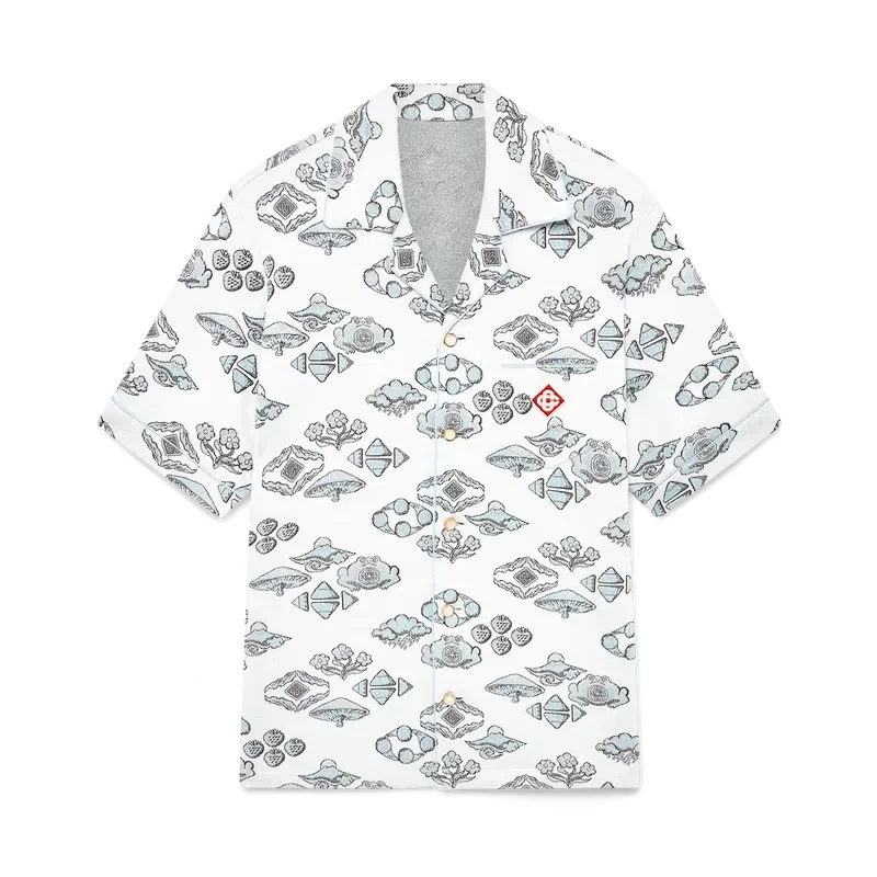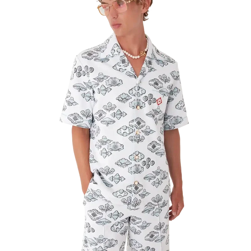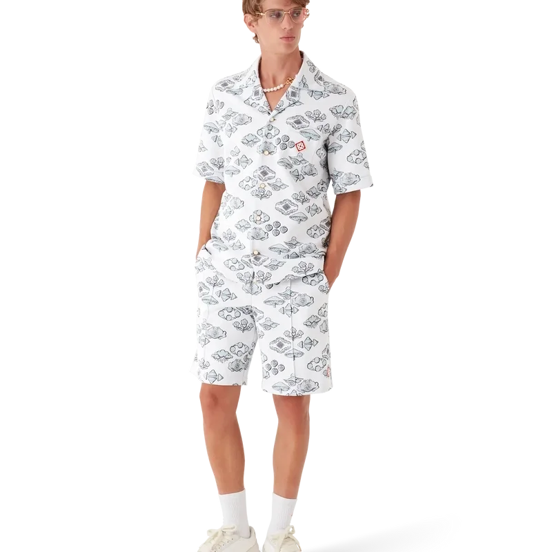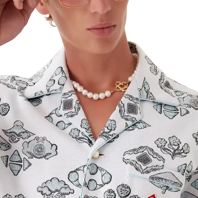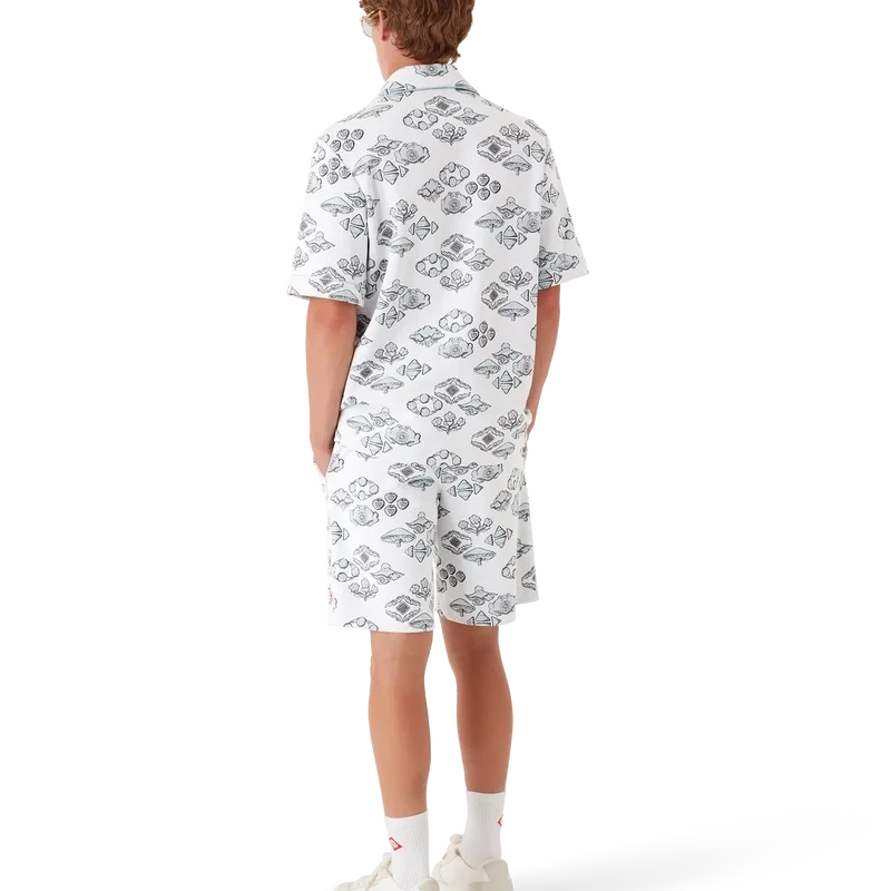 Das Kurzarmhemd mit Jacquard-Motiv ist ein klassisches Design mit dem charakteristischen Rautenlogo des Hauses und von der Natur und dem Tennis inspirierten Motiven in einem Rautenmuster. Abgerundet wird es durch einen Kubanerkragen, einen Knopfverschluss, charakteristische Perlenknöpfe mit Goldrand, eine Brusttasche sowie Paspeldetails an Kragen, Manschetten, Knopfleiste und Brusttasche.