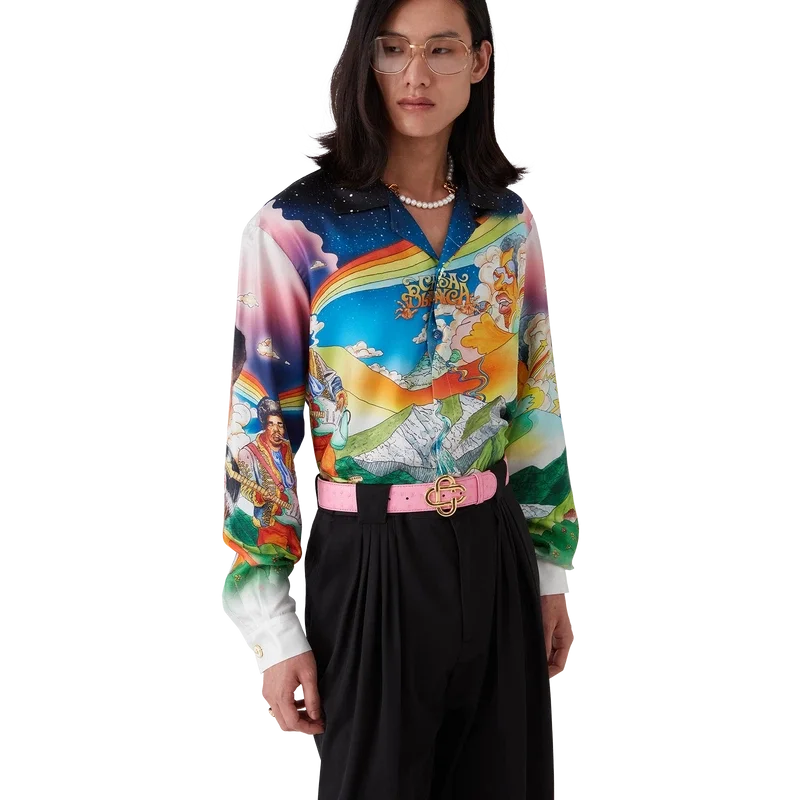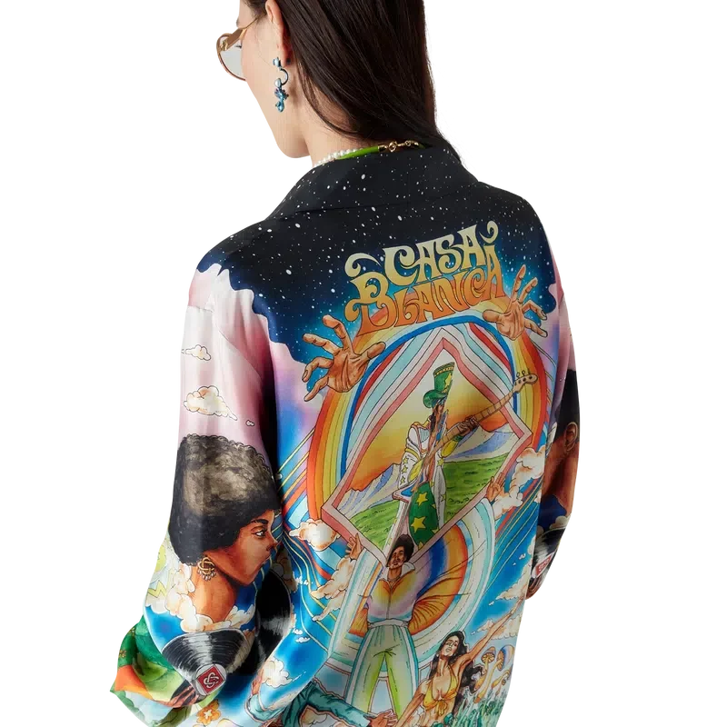Das Seidenhemd „La Musique“ ist ein Langarmmodell aus bedrucktem Seidentwill mit dem saisonalen Motiv, das eine Hommage an Bootsy Collins und ikonische Funk-Platten der 70er Jahre darstellt. Abgerundet wird es durch einen Kubanerkragen, eine Brusttasche, einen verdeckten Knopfverschluss mit ineinandergreifenden Cc-Corozo-Knöpfen und einen goldrandigen Emailleknopf an jedem Ärmelbund.