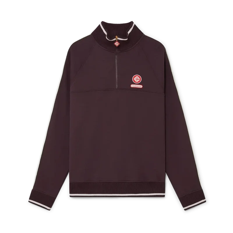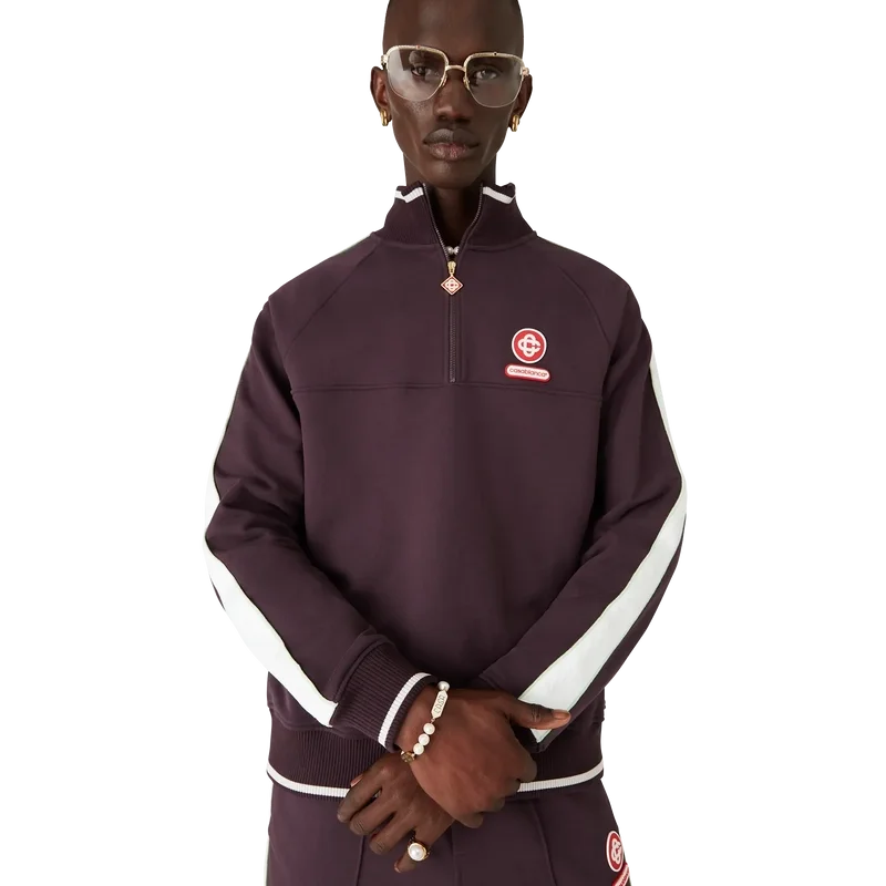 Das Quarter-Zip-Laurel-Sweatshirt ist ein Langarm-Modell mit dem Interlocking-Cc-Logo des Hauses und einem Casablanca-Logo-Patch. Abgerundet wird es durch einen Viertelreißverschluss mit charakteristischer Reißverschlusslasche mit Diamant-Logo, weißen Laurel-Streifen an den Ärmeln sowie einem gerippten Trichterkragen, Bündchen und Saum mit weißen Kanten.