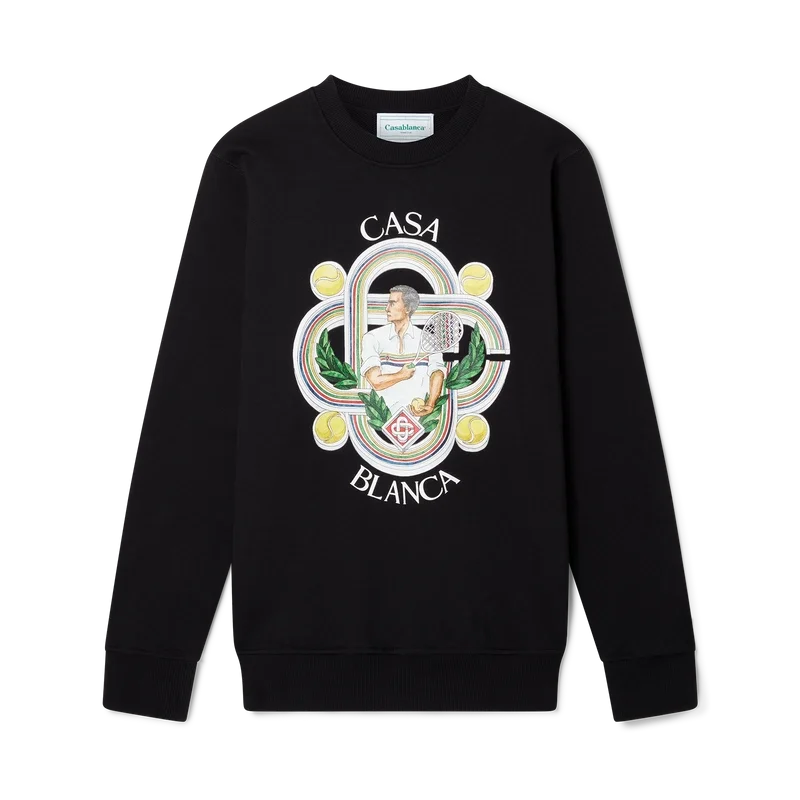 Das schwarze Le Joueur Sweatshirt aus Bio-Baumwolle mit Siebdruck zeigt ein saisonales Design, das die charakteristische Tennis-Ikonografie des Hauses aufgreift. Es verfügt über einen klassischen Rundhalsausschnitt, lange Ärmel und ein Casablanca Paris-Markenlabel und ist für eine lockere Passform konzipiert.