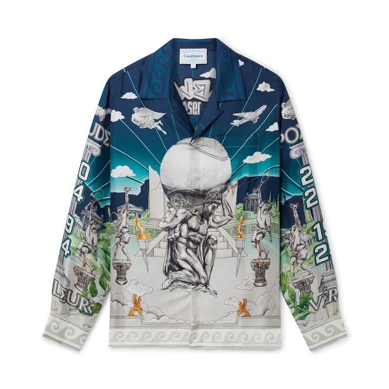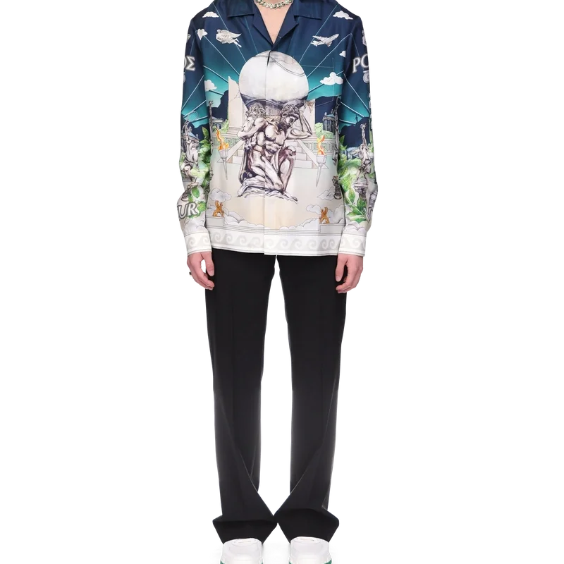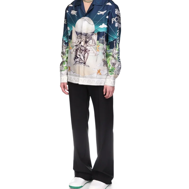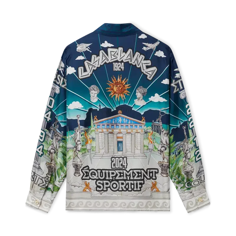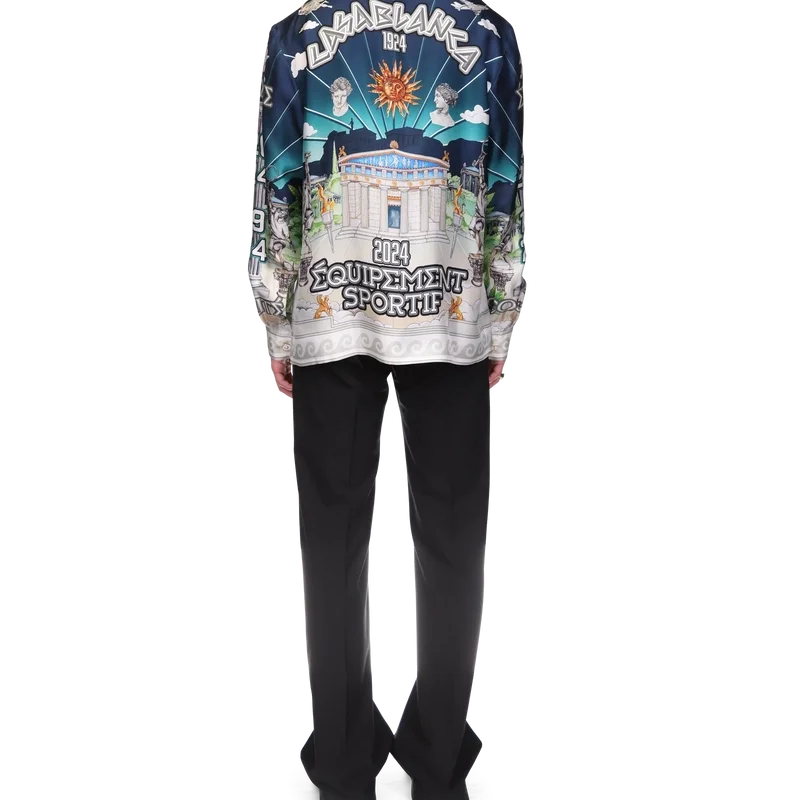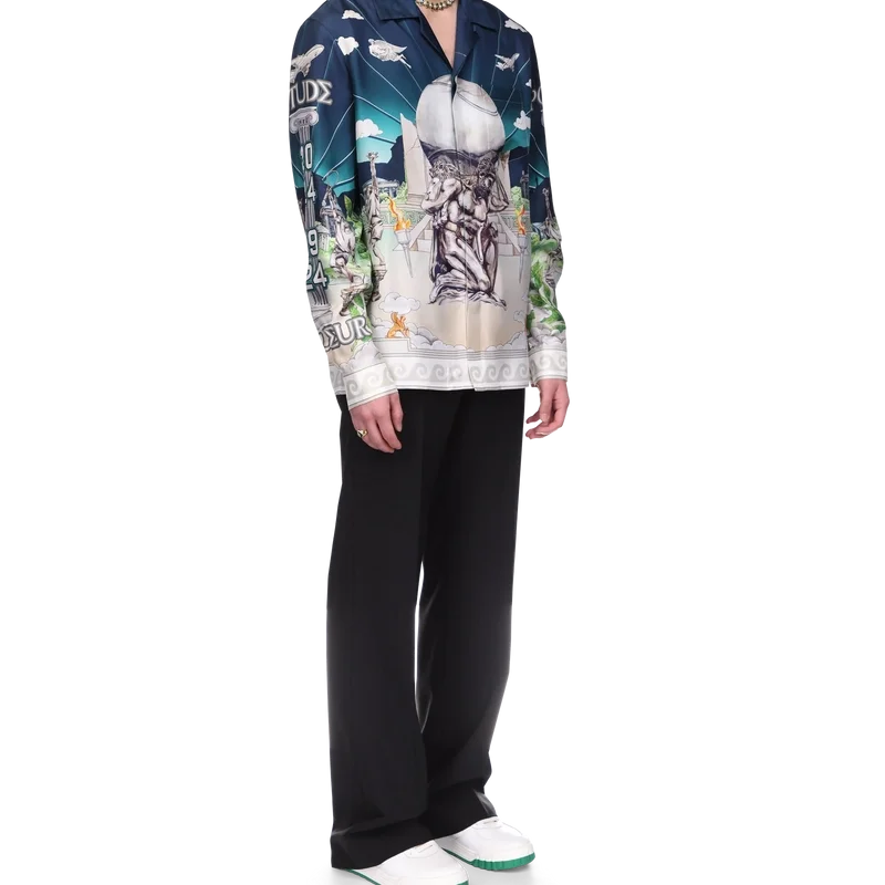 Das Le Temple Du Sport Seidenhemd ist ein langärmeliges Modell mit Allover-Print und Teil der exklusiven Zusammenarbeit mit Jeff Hamilton – es ist eine Interpretation unseres Tennisclubs mit Landschaftsmotiven und schwebenden Elementen – gefertigt aus Seidentwill. Abgerundet durch die für das Haus typischen goldumrandeten Perlmuttknöpfe, einen Knopfverschluss, einen Kubanerkragen und die in dieser Saison von griechischen Wellen inspirierten Kantenverzierungen an Kragen, Manschetten und Saum.