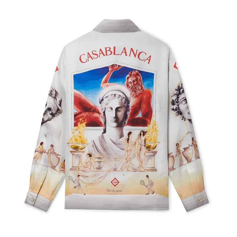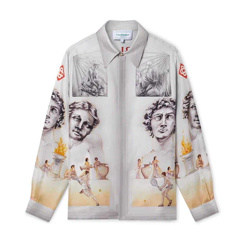 Das Le Theatre Seidenhemd ist ein langärmeliges, durchgehend bedrucktes Modell aus Seidentwill, das mit dem saisonalen Design des Hauses verziert ist. Inspiriert von Vintage-Theaterplakaten zeigt es antike griechische Statuen und Tennis in einem neuen, frischen Layout. Abgerundet wird es durch die für das Haus typischen goldgerahmten Perlmuttknöpfe, einen Knopfverschluss, einen kubanischen Kragen sowie Streifen mit Farbverlauf an Manschetten, Saum, Kragen und Knopfleiste.