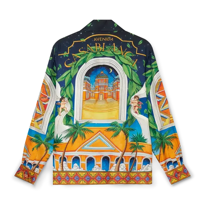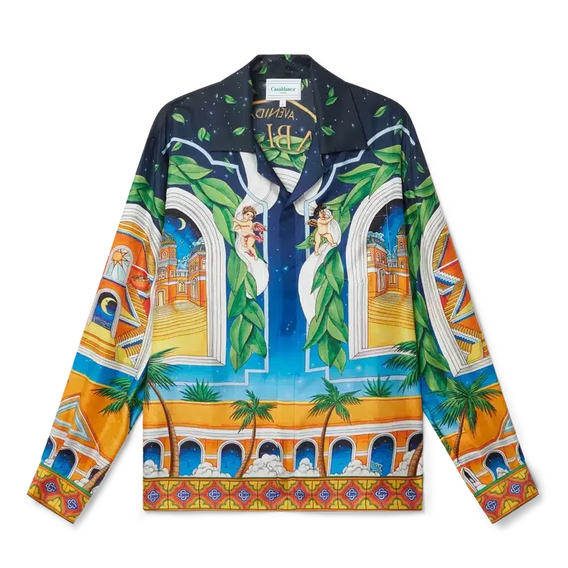 Das langärmelige Seidenhemd für Herren von Maison D’ete besticht durch einen saisonalen Key-Print in einer Tagesfarbpalette aus warmen Gelb-, Orange- und Grüntönen. Mit offenem Kragen und geschlossener Kragenverschluss.