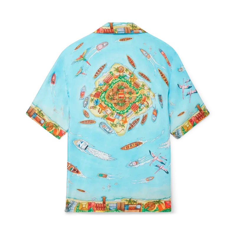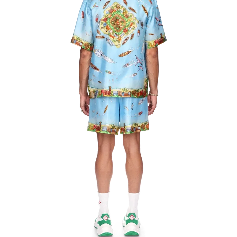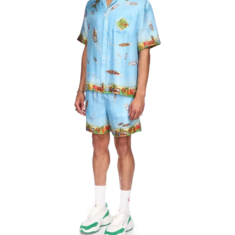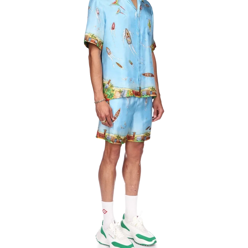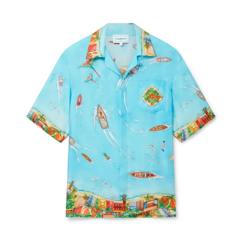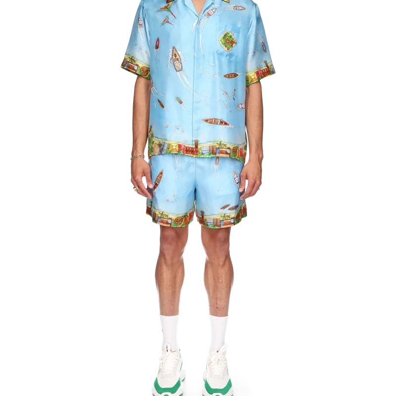 Das Maison Sur Piloti Seidenhemd ist ein kurzärmeliges Modell mit Allover-Print, inspiriert von den Wasserdörfern von Lagos, der Gemeinschaft und der Energie, der kreisförmigen Bewegung der Boote, den Farben und dem Kontrast zwischen Holz und Wasser. Es ist aus Seidentwill gefertigt und verfügt über einen Knopfverschluss, eine Brusttasche und einen offenen Kubanerkragen.