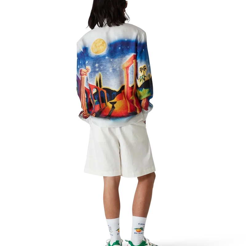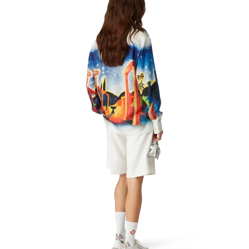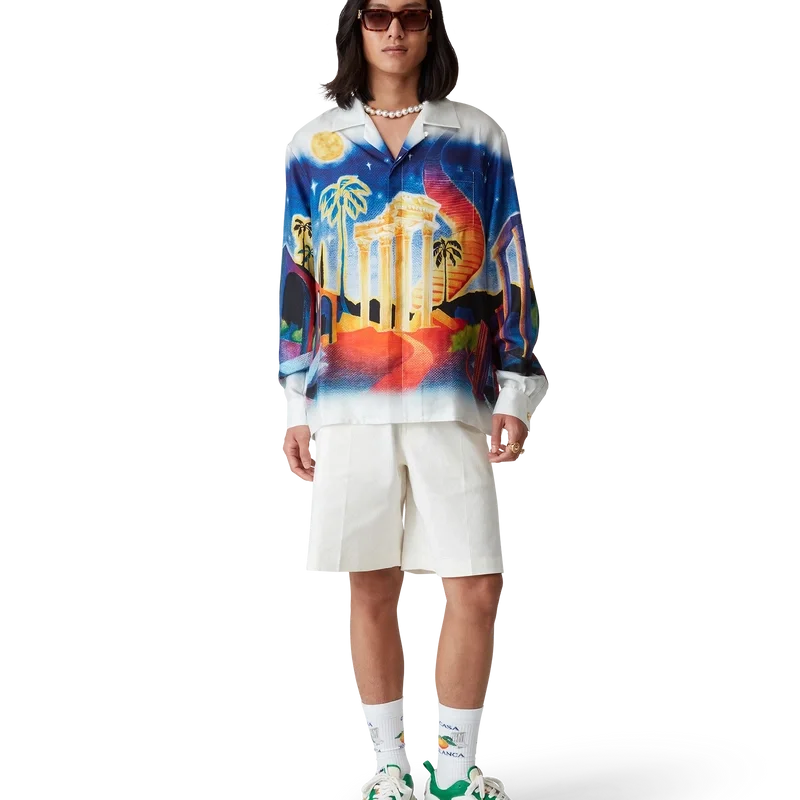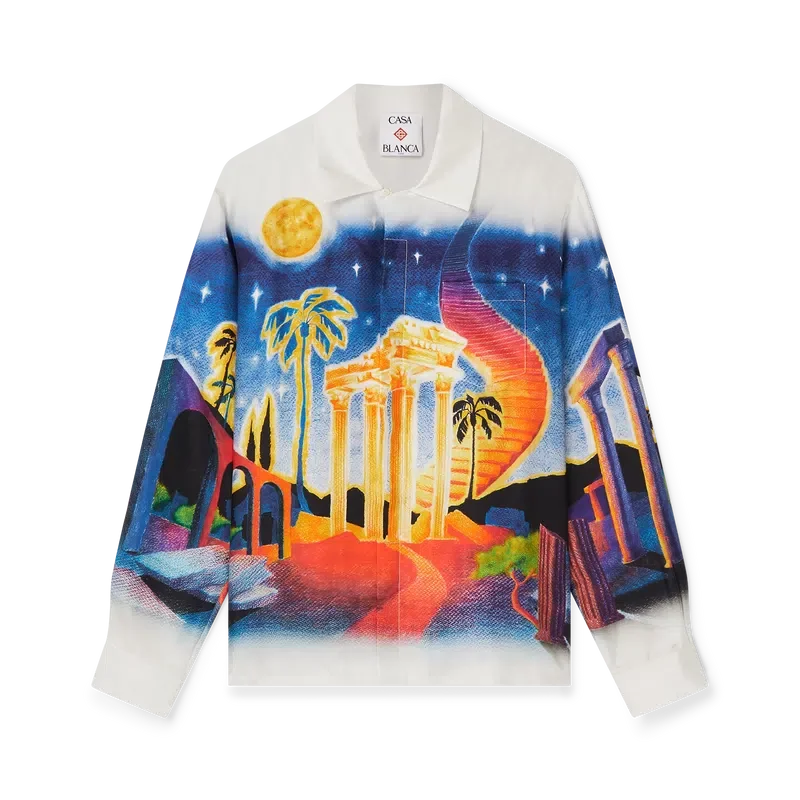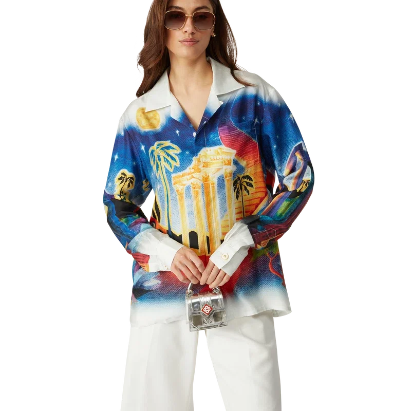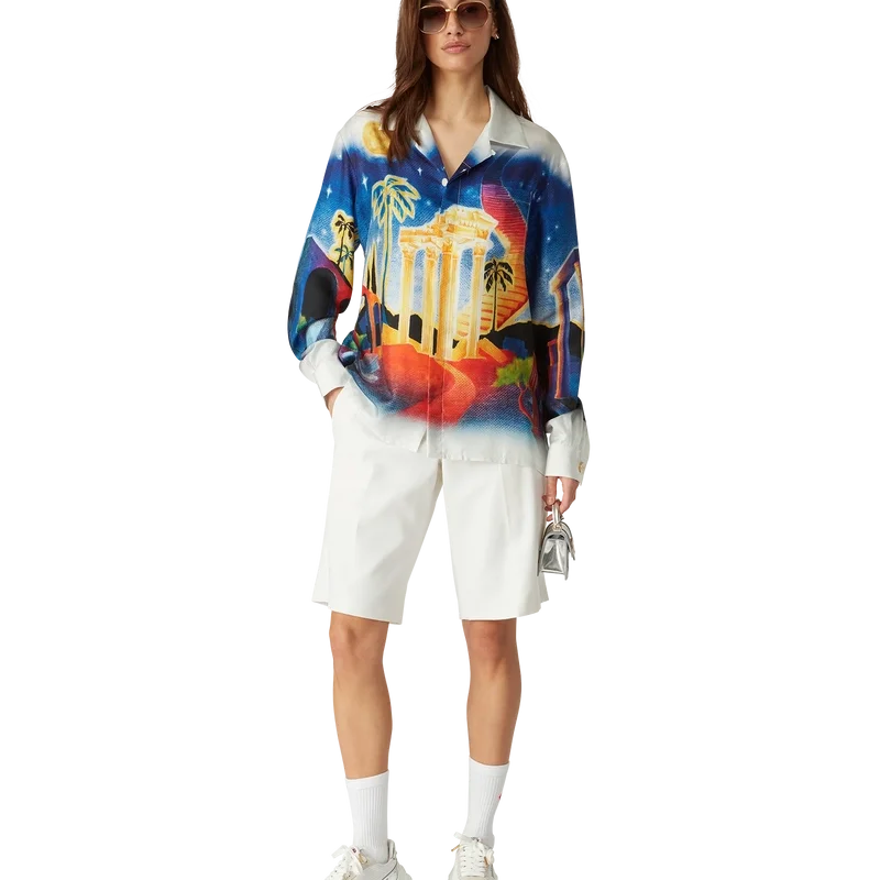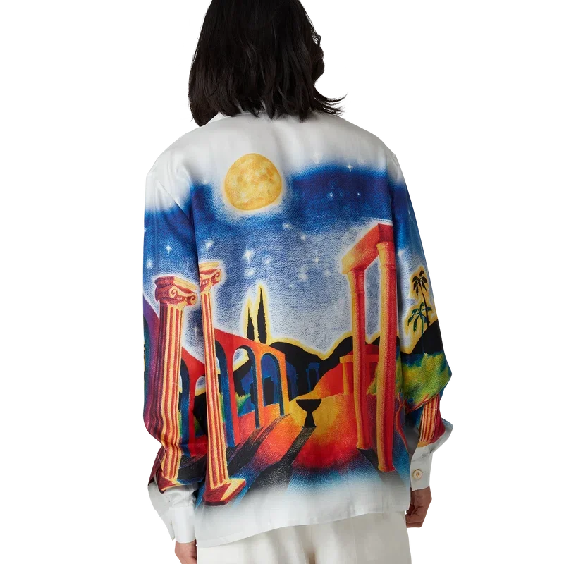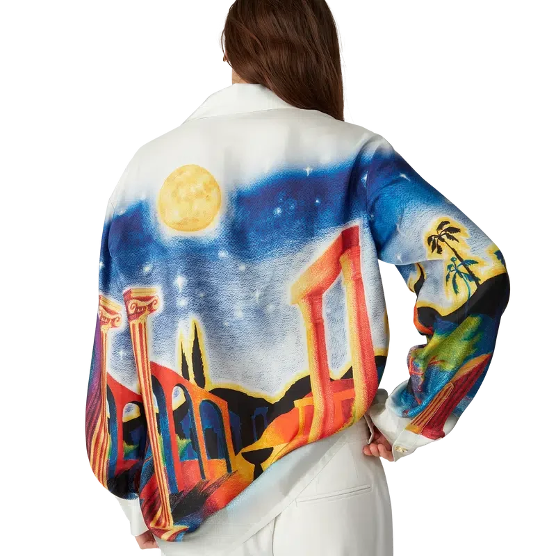 Das Midnight Acropolis Seidenhemd mit langen Ärmeln ist ein durchgehend bedrucktes Design aus Seidentwill, das mit dem Licht des Tempels und des Himmels eine Hommage an die wunderschöne Nacht des antiken Griechenlands darstellt. Abgerundet wird es durch einen kubanischen Kragen, goldgerahmte Emaille-Knöpfe an den Ärmeln und einen Knopfverschluss vorne mit ineinander verschlungenen Cc-Logo-Knöpfen aus Corozo.