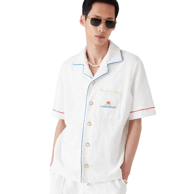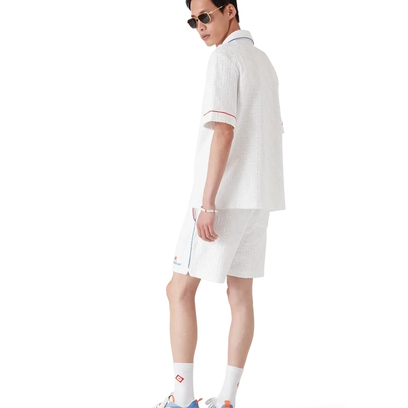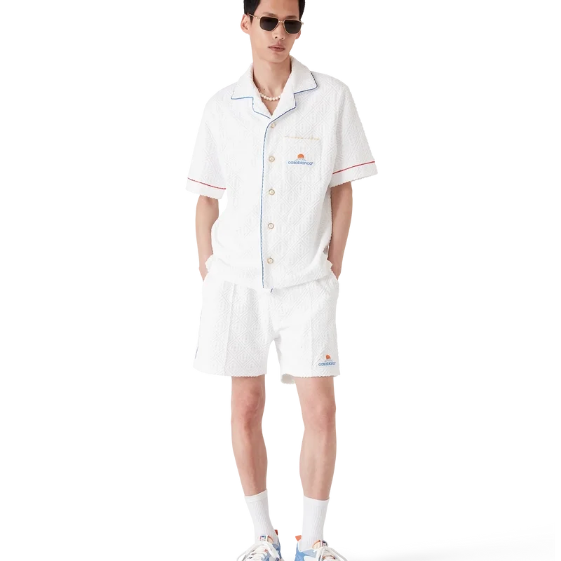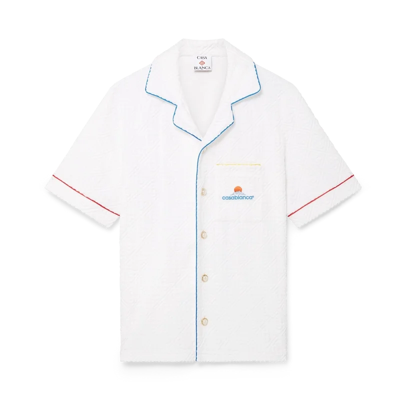 Das Monogram-Frottee-Hemd mit kurzen Ärmeln ist ein klassisches Design aus einem Frotteestoff mit Monogramm. Es verfügt über einen Knopfverschluss, charakteristische goldgeränderte Perlknöpfe, eine Brusttasche sowie Paspeldetails an Kragen, Knopfleiste, Manschetten und Brusttasche.