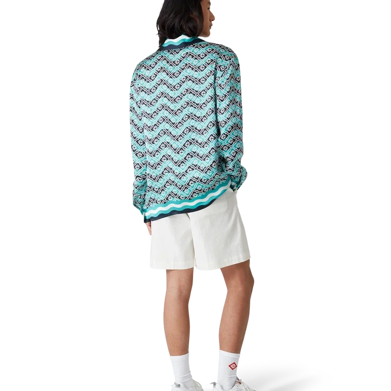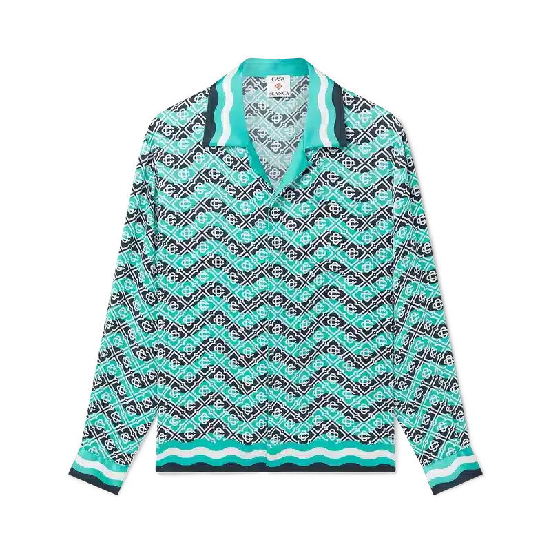 Das Monogram Wave Seidenhemd ist ein durchgehend bedrucktes Modell mit dem charakteristischen Monogramm des Hauses, gefertigt aus Seidensatin. Es verfügt über eine Knopfleiste vorne mit ineinander verschlungenen Cc-Corozo-Knöpfen, goldrandige Emaille-Knöpfe an den Manschetten, einen kubanischen Kragen sowie von der Memphis-Welle inspirierte Streifendetails an Kragen, Manschetten und Saum.